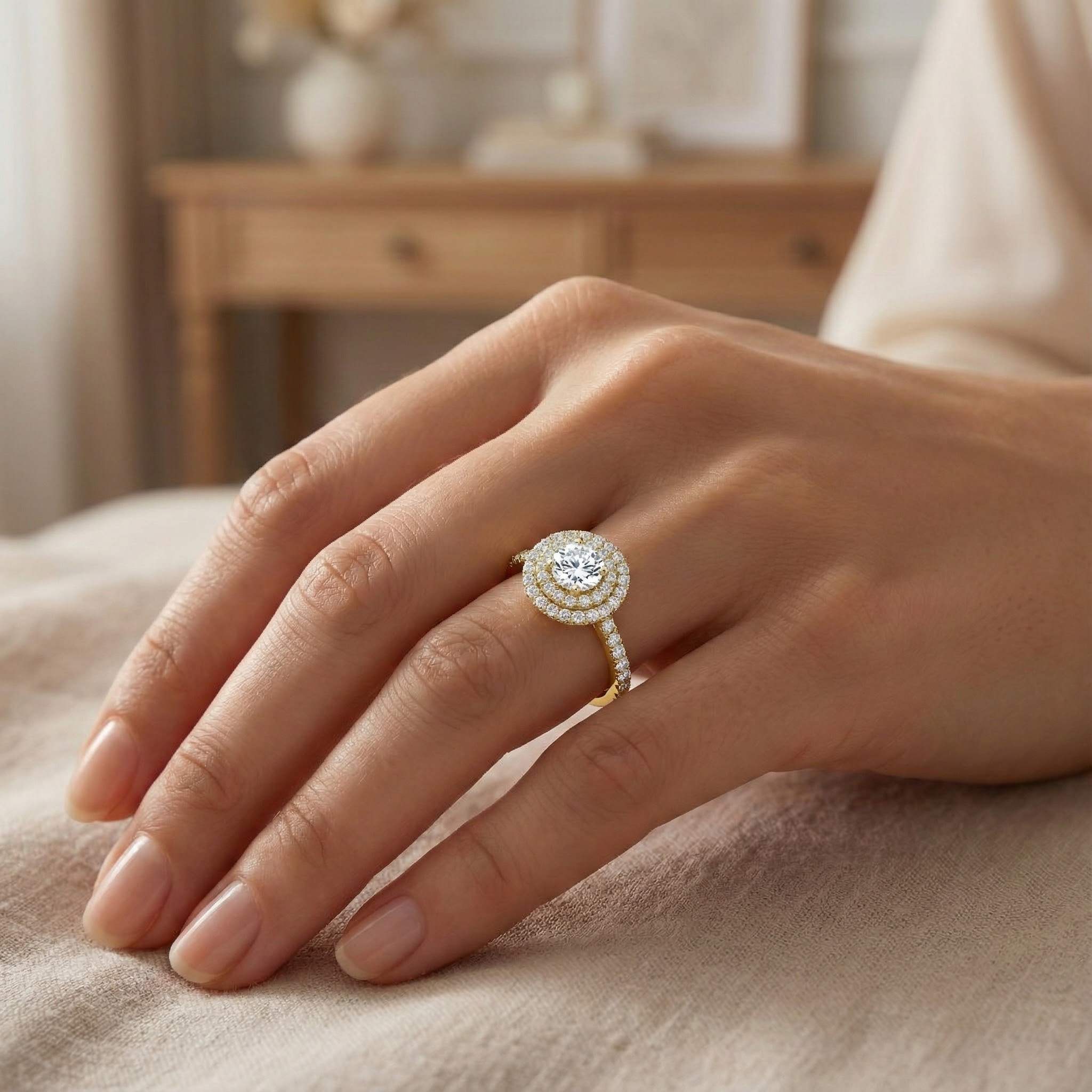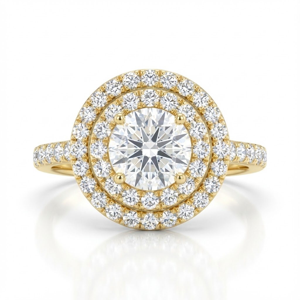 טבעת זהב מרשימה בעיצוב הלואו-פרופיל המחמיא ביותר – עם יהלום מרכזי עגול מוקף בשתי שורות הילה מנצנצות של יהלומים קטנים המלוטשים בקפידה. השיבוץ ממשיך גם על גבי החישוק ליצירת נוכחות זוהרת מכל זווית. עיצוב אלגנטי ומדויק המעניק מראה יוקרתי במיוחד, מבלי להתפשר על נוחות.