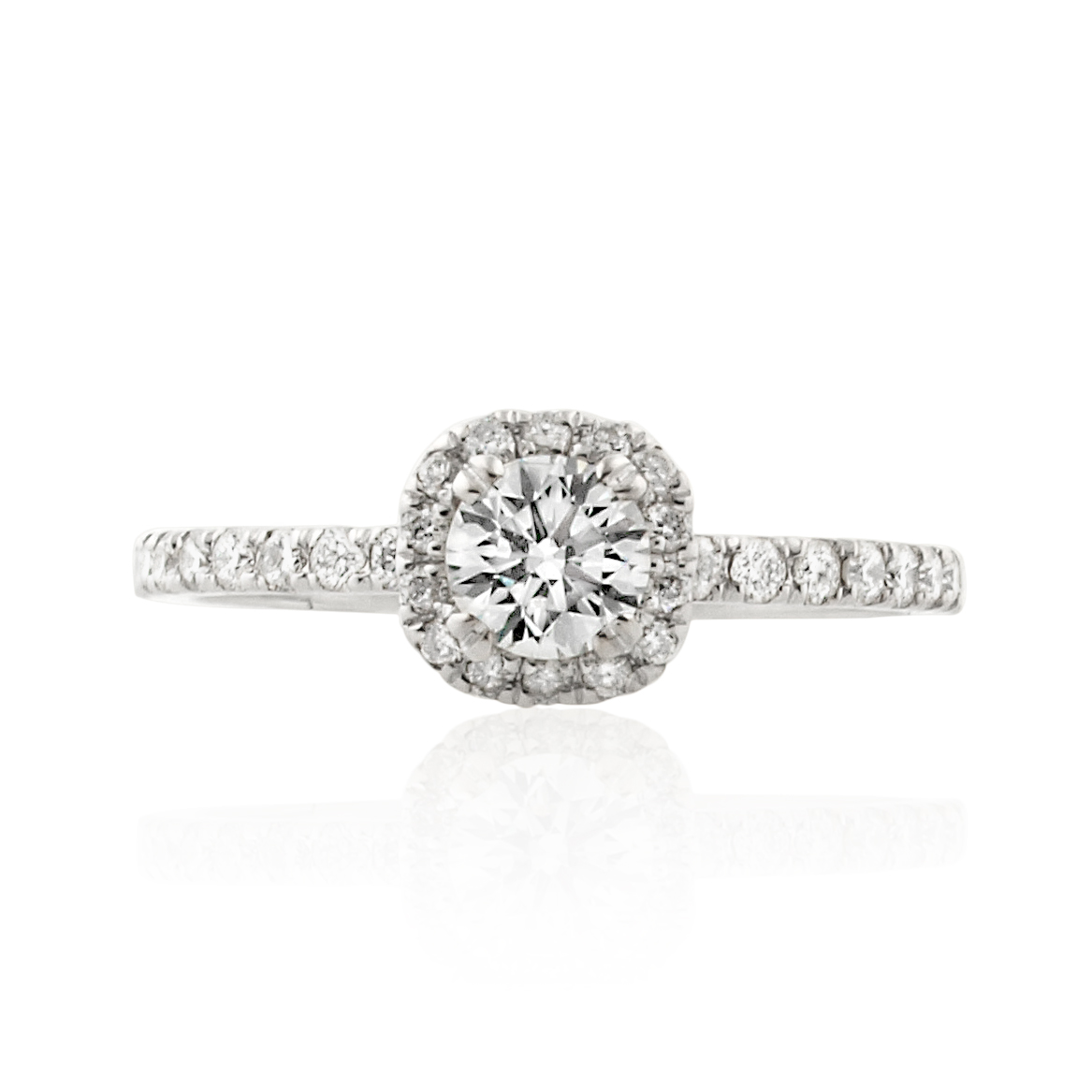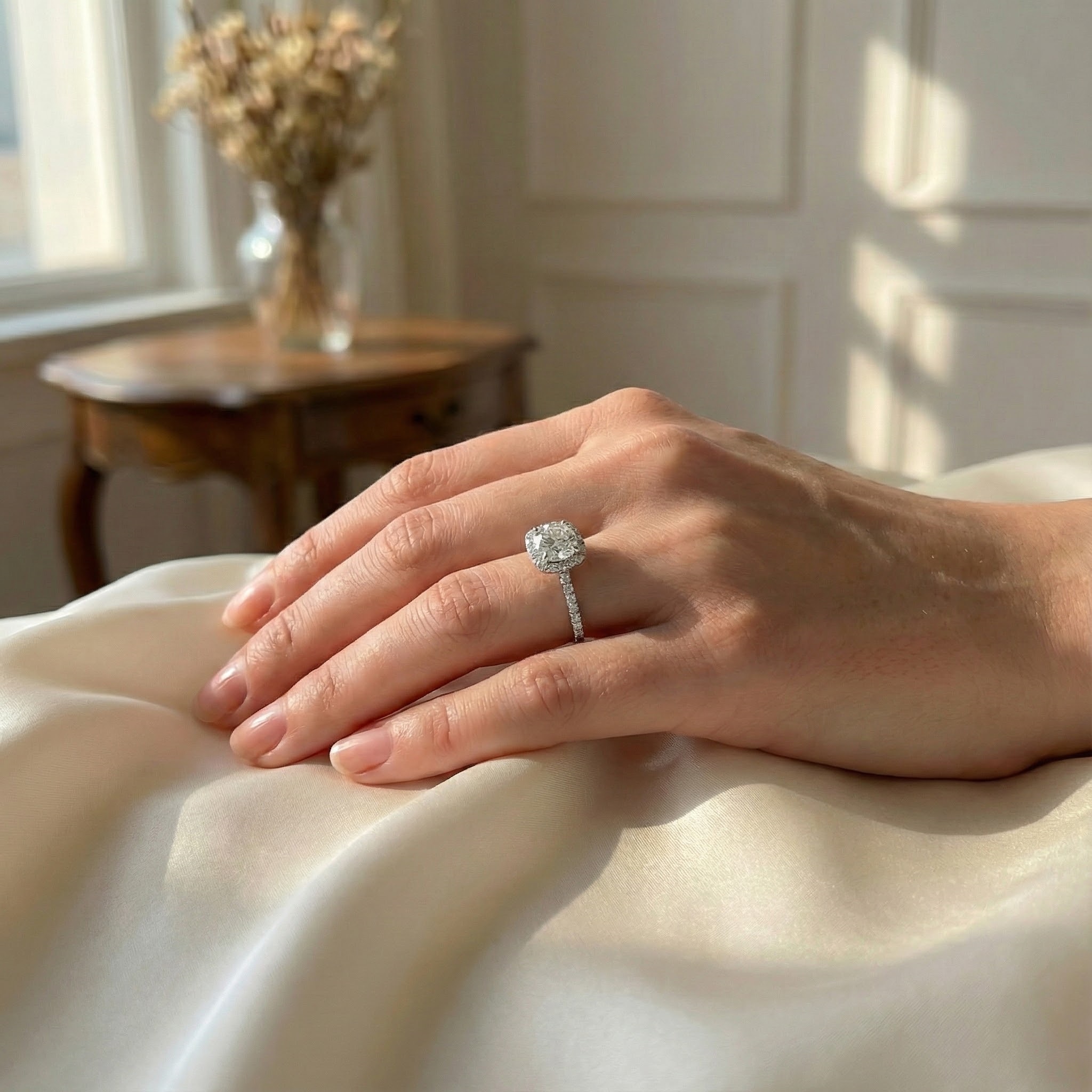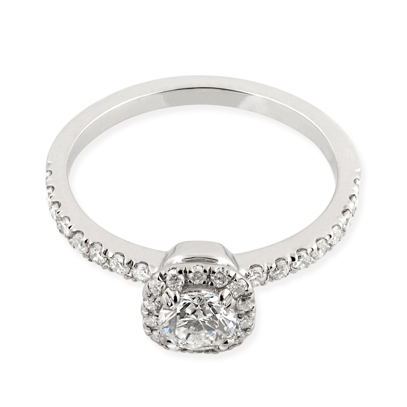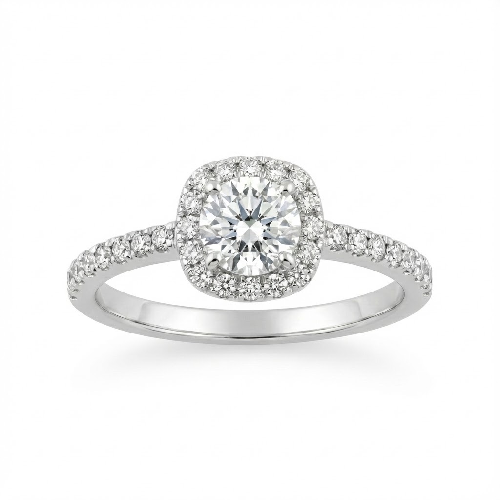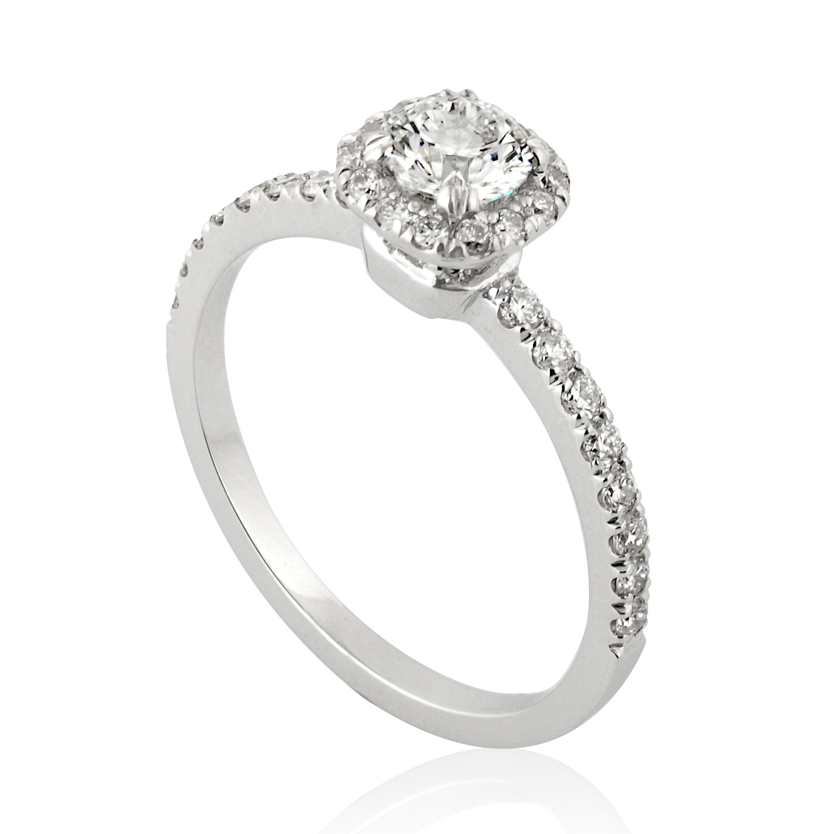 אלואן, טבעת יהלום עוצרת נשימה שמשלבת עיצוב עכשווי עם טאצ’ על-זמני. יהלום מרכזי עגול מלוטש שזורח מתוך מסגרת הלואו-פרופיל, ומוקף בהילה של יהלומים קטנים שמעצימים את הברק. הזרועות משובצות גם הן ביהלומים עדינים לכל אורכן, מה שיוצר אפקט נוצץ מכל זווית.