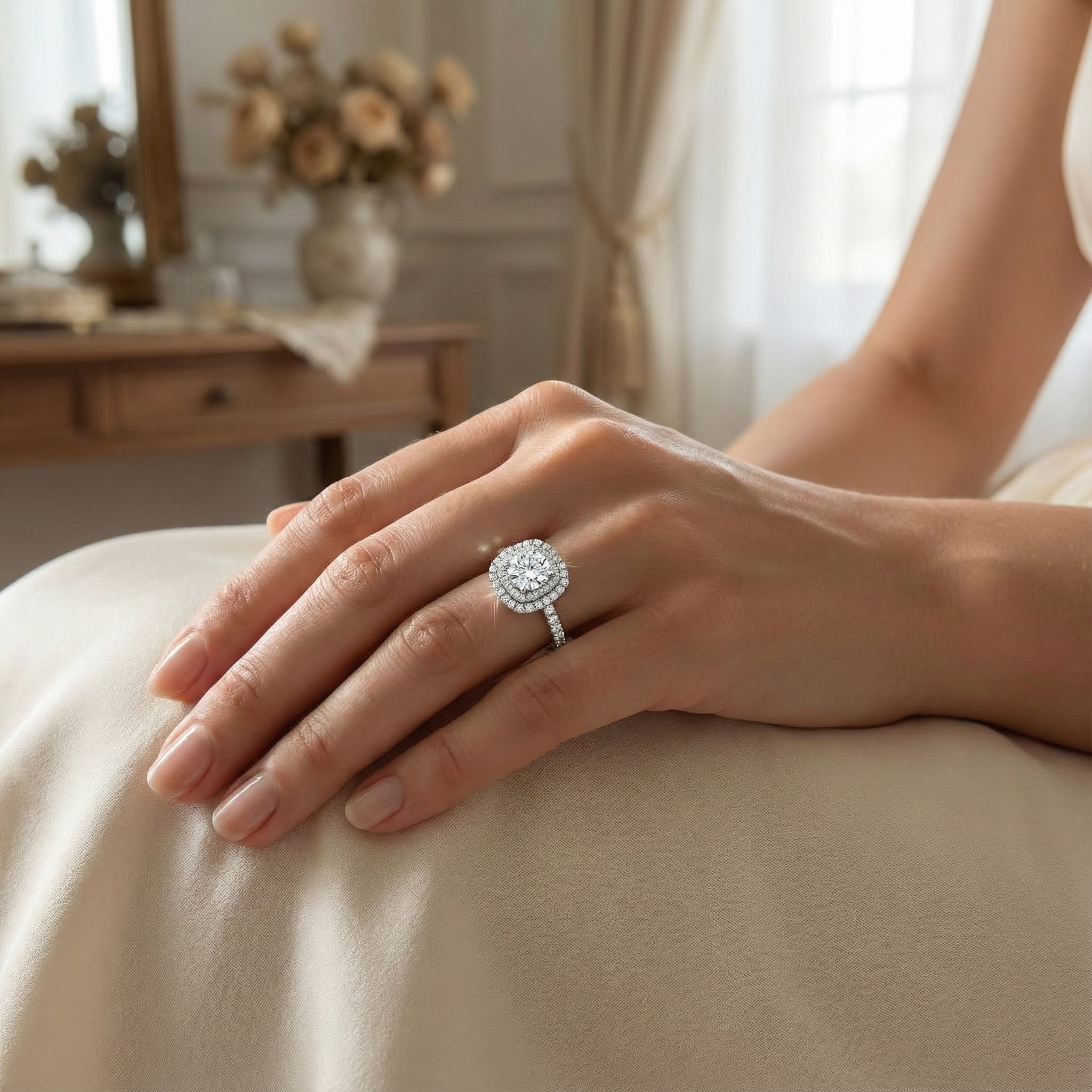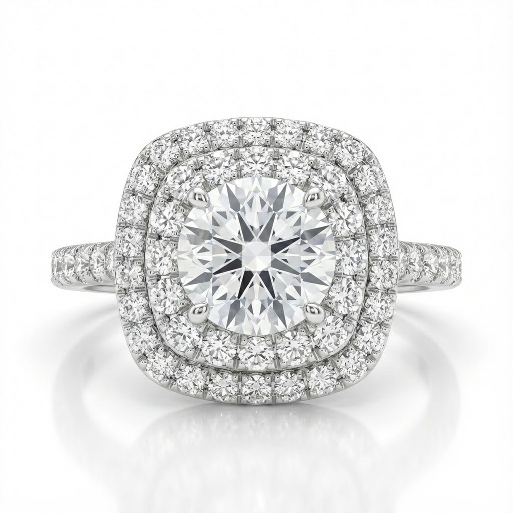 אליורה היא טבעת אלגנטית ומרשימה בעיצוב מרובע קלאסי עם נוכחות שקשה להתעלם ממנה. במרכזה יהלום עגול נוצץ, מוקף בשלוש מסגרות יהלומים קטנים בצורת האלו – שיוצרים עומק, ברק ועושר ויזואלי עוצר נשימה. הזרוע המשובצת משלימה את המראה עם שורת יהלומים שמוסיפה אור מכל כיוון.