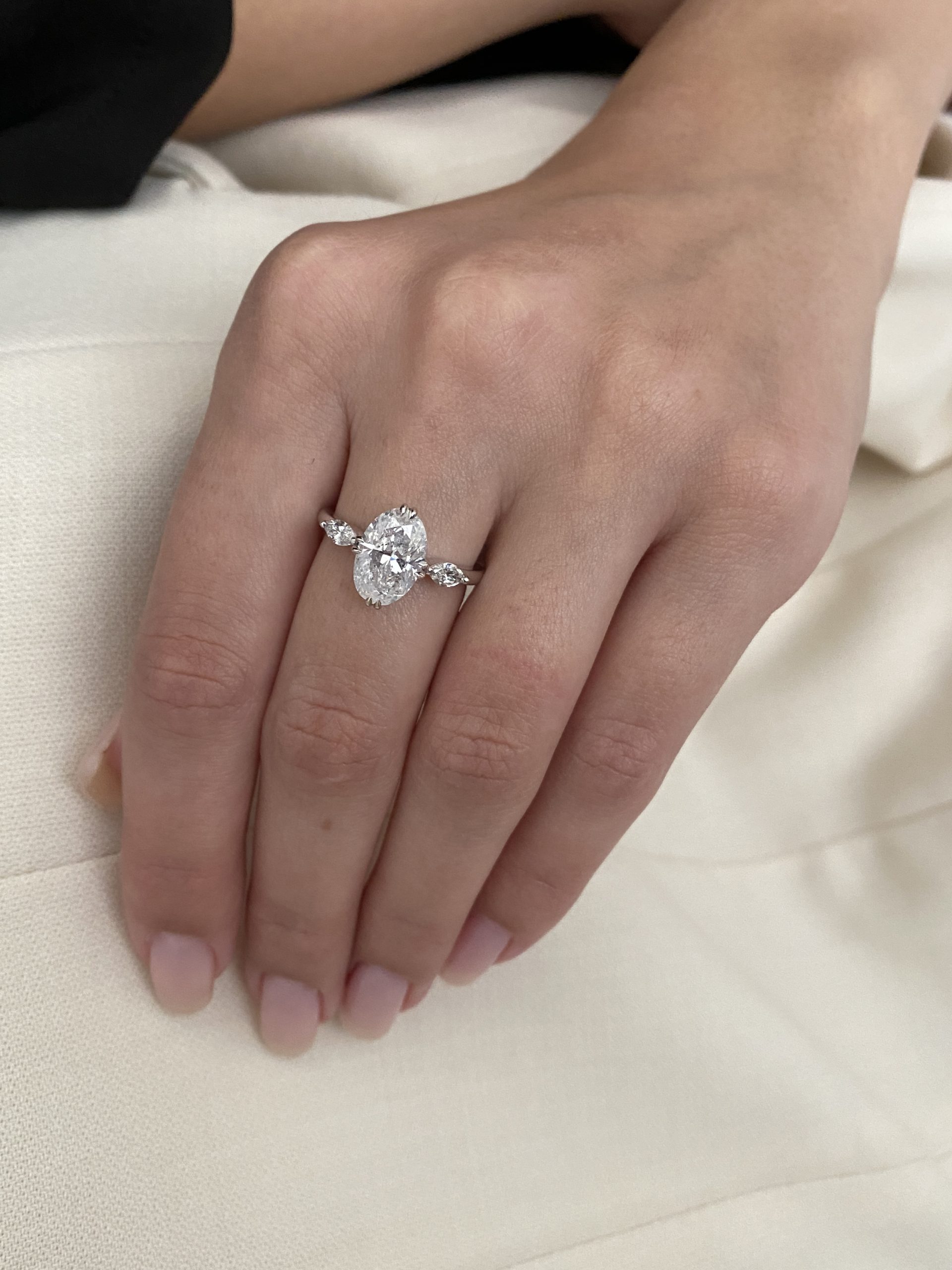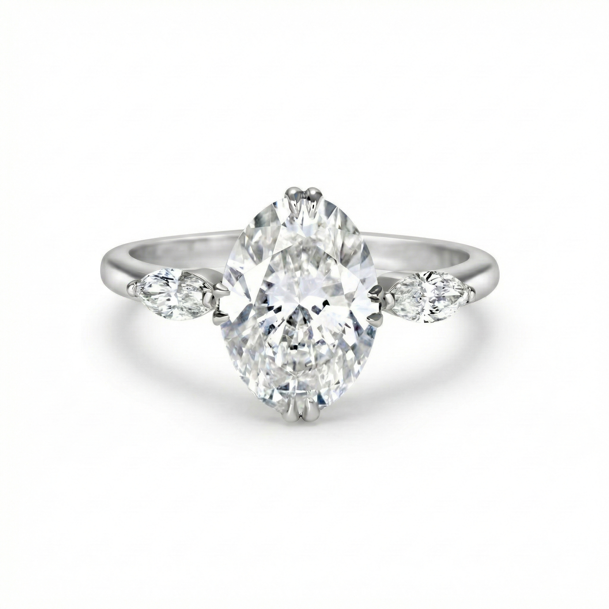 טבעת אלגנטית זהב לבן מוקפד, עם יהלום מרכז חיתוך אובל במשקל מרשים, המשובץ בארבע־שיניים דקות שמעצימות את הברק והגימור שלו. משני הצדדים מלוות שני יהלומים חיתוך מרקיזה, היוצרים קומפוזיציה סימטרית ומאוזנת של אור ותנועה. הלהקה הדקה מדגישה מראה נקי ועדכני, ומאפשרת שילוב מושלם עם טבעות נוספות או לבישה יחידה כפריט דומיננטי.