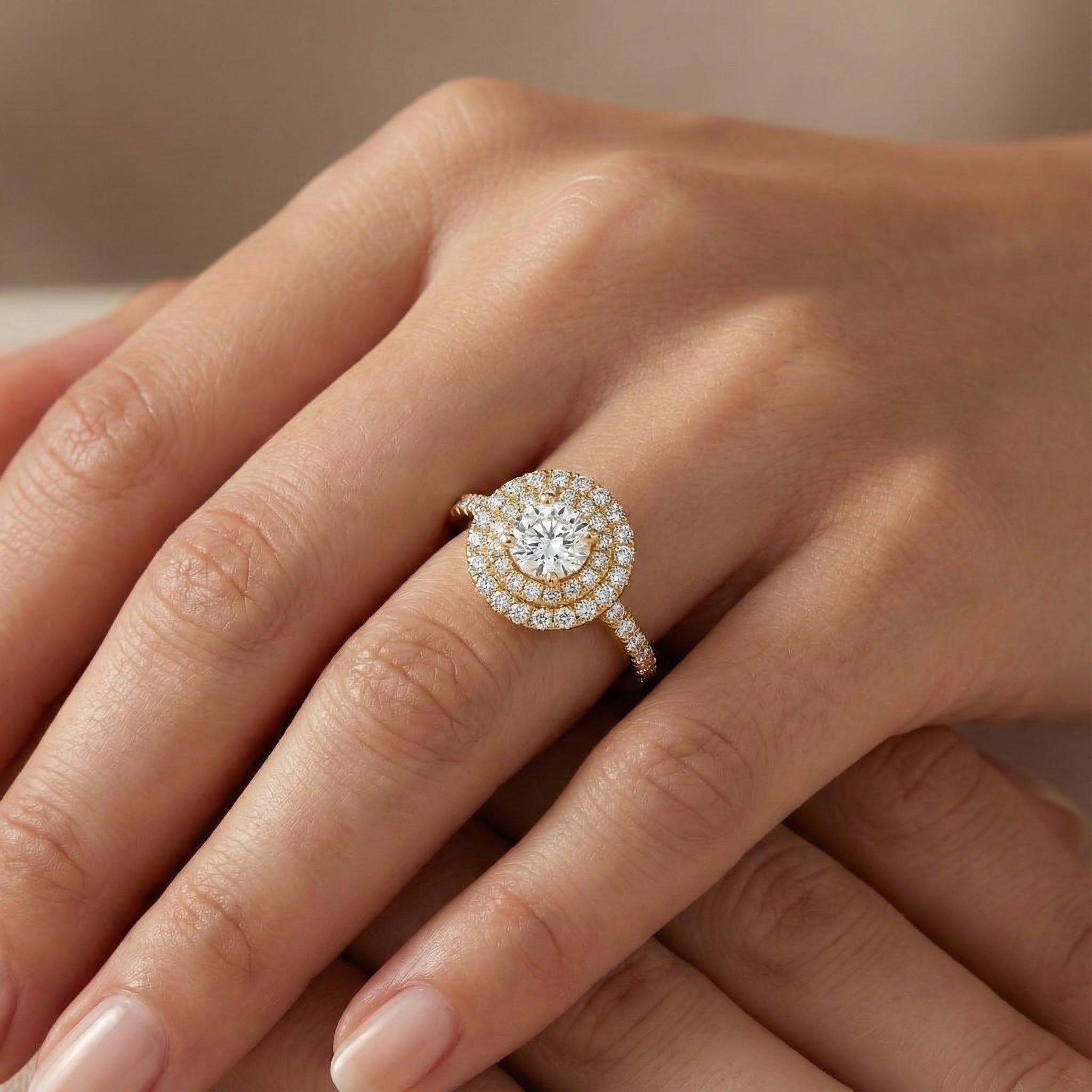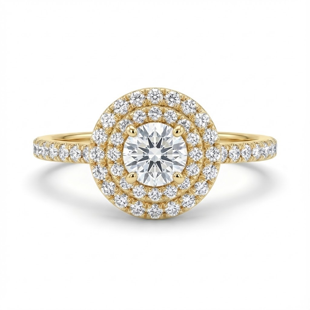 ג'ולייטה היא טבעת עוצמתית ויוקרתית שמשלבת זהב צהוב חמים עם שני מעגלים מרהיבים של יהלומים זוהרים מסביב ליהלום מרכזי עגול. הילה כפולה וסגנון פייב מלא יהלומים על הזרועות יוצרים יחד מראה מרשים, עשיר ובלתי נשכח – טבעת שמשדרת עוצמה, אלגנטיות ואהבה נצחית.