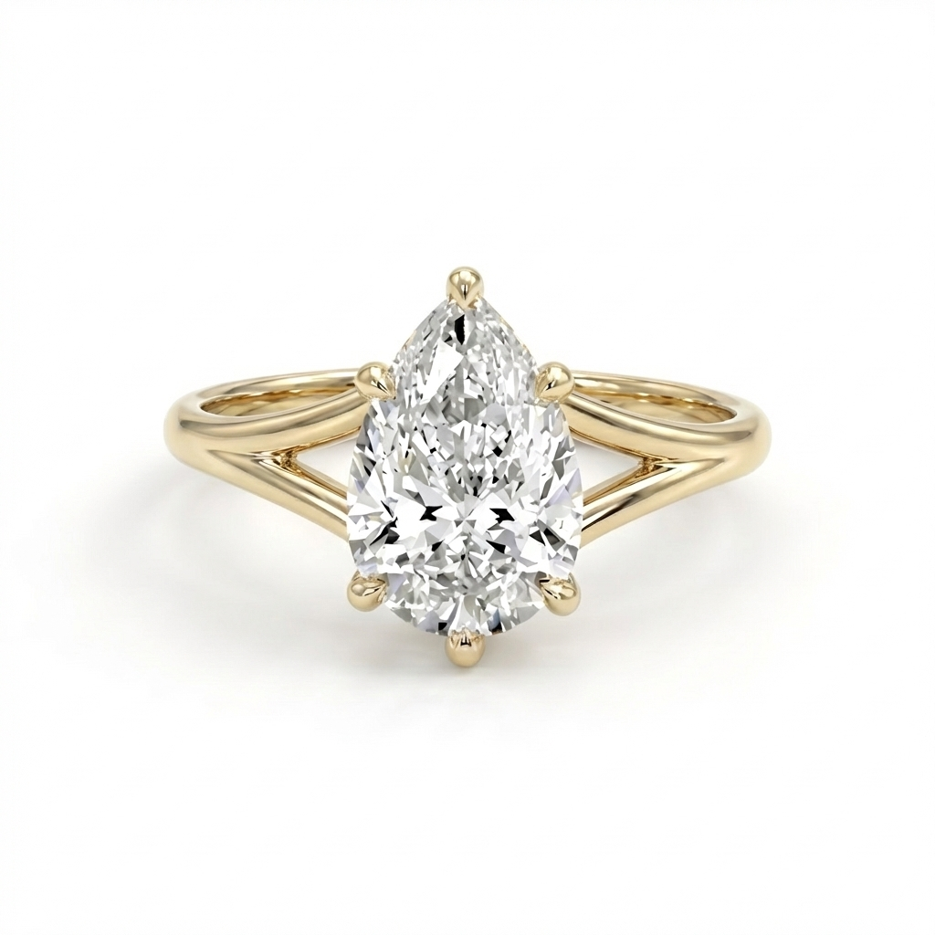 טבעת מרשימה בעיצוב סוליטר, עשויה זהב צהוב מוקפד, המשובצת יהלום מרכז חיתוך טיפה במשקל מרשים. האבן נתפסת בארבע־שיניים דקות שמעצימות את הברק והגימור, ומשתלבת עם טבעת מפוצלת בשני חצאים שמתחברים מתחת לאבן ויוצרים מראה אווירי ומוחצן בו־זמנית. השילוב בין צורת הטיפה המקורית לפרופורציות המודרניות של הטבעת מוסיף נוכחות וקונטור ייחודי על האצבע.