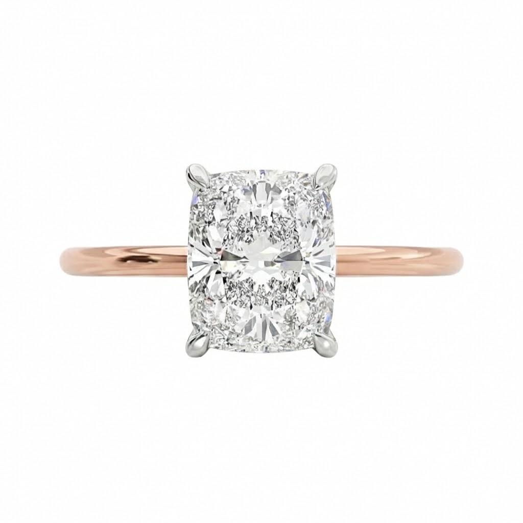 דואטו,טבעת סוליטר מיוחדת במינה, עם יהלום מרכז חיתוך קושן המשובץ במקביל לאצבע בארבע שיניים דקות. זרוע הטבעת עשויה זהב רוז בקראט עוטפת את האבן בחום רך, בעוד שיניים ומיקום ההשיבוץ בגימור לבן המדגישים את הברק הטהור של היהלום ויוצרים ניגוד צבע דו‑גווני רומנטי ומעודן.