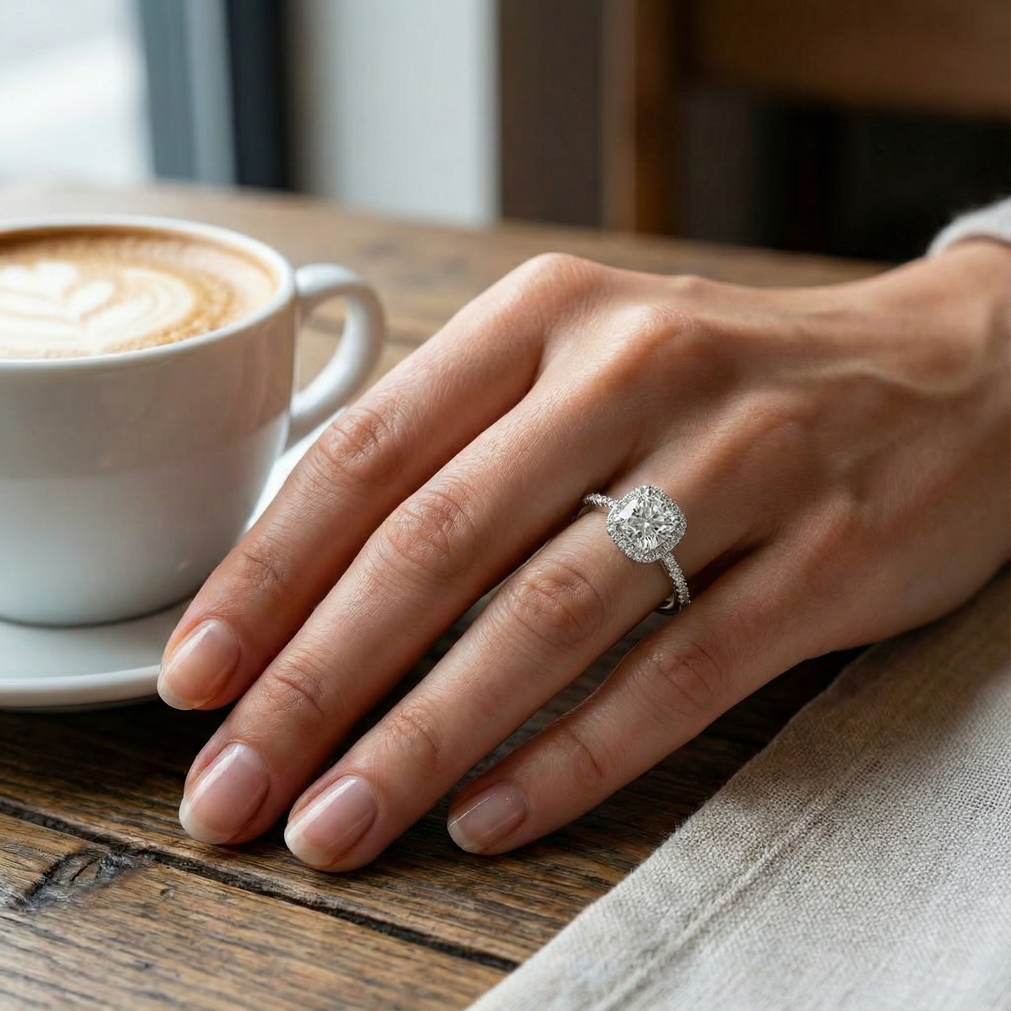 הזרוע הדקיקה משובצת אף היא ביהלומים עגולים נוצצים לכל אורכה, ליצירת מראה עשיר וזוהר במיוחד. מבט אחד בטבעת הזו מגלה שילוב הרמוני בין נוכחות לבין תחכום – בחירה מושלמת לרגעים הבלתי נשכחים של החיים.