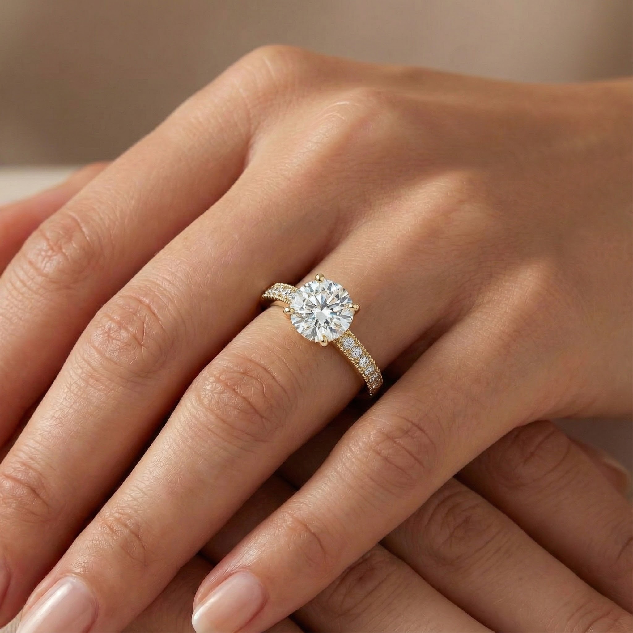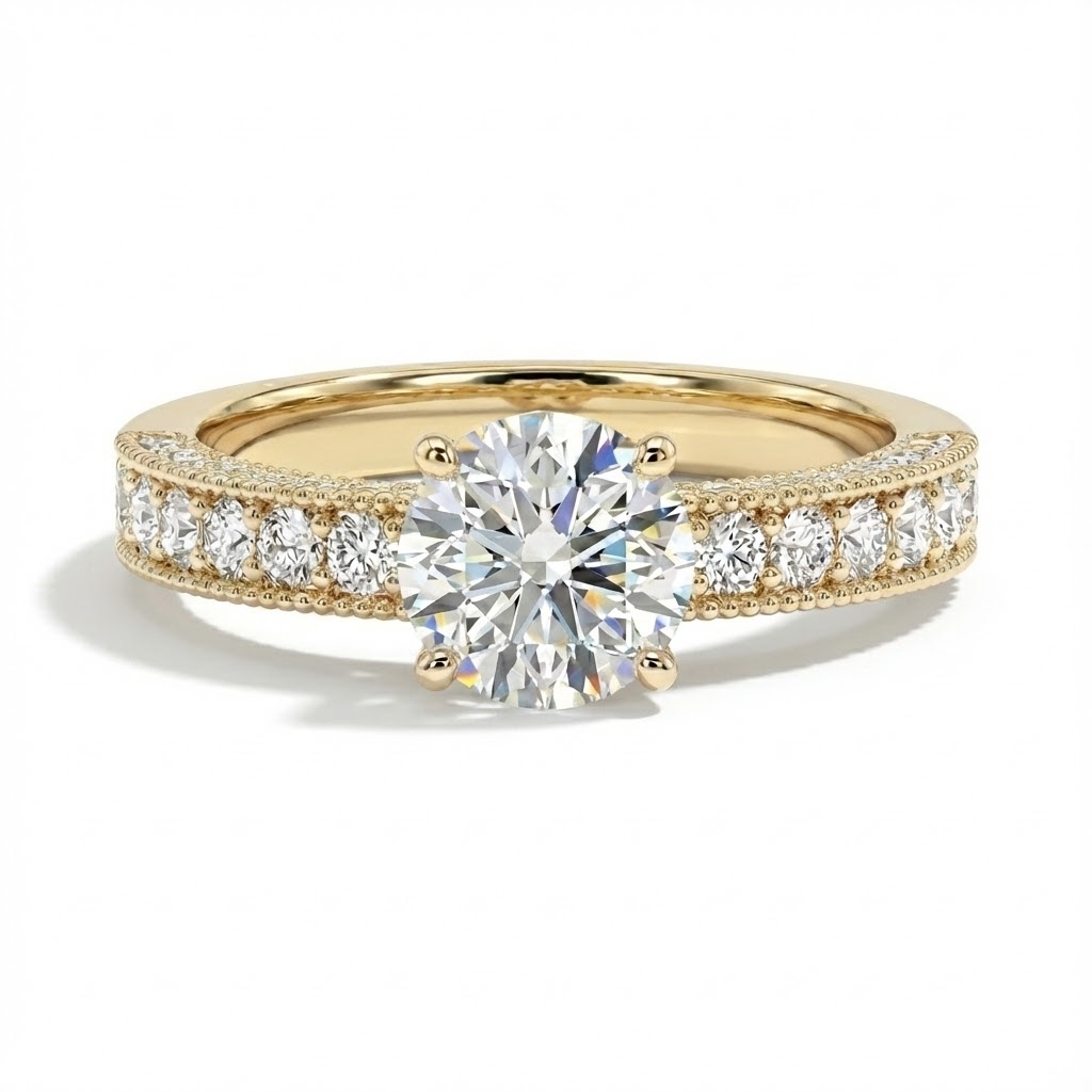 טבעת זהב צהוב בעיצוב קלאסי-וינטג', משובצת יהלום עגול נוצץ במרכז, הנתמך בארבע שיניים בולטות להדגשת האבן המרכזית. הזרועות מעוטרות בשני טורים של יהלומים עגולים בשיבוץ מילגריין מדויק, המעניק לטבעת מראה עשיר ומלכותי, עם ניחוח עתיק. טבעת אלגנטית ומרשימה שמדברת בעד עצמה – מושלמת כטבעת אירוסין או כתכשיט הצהרתי.