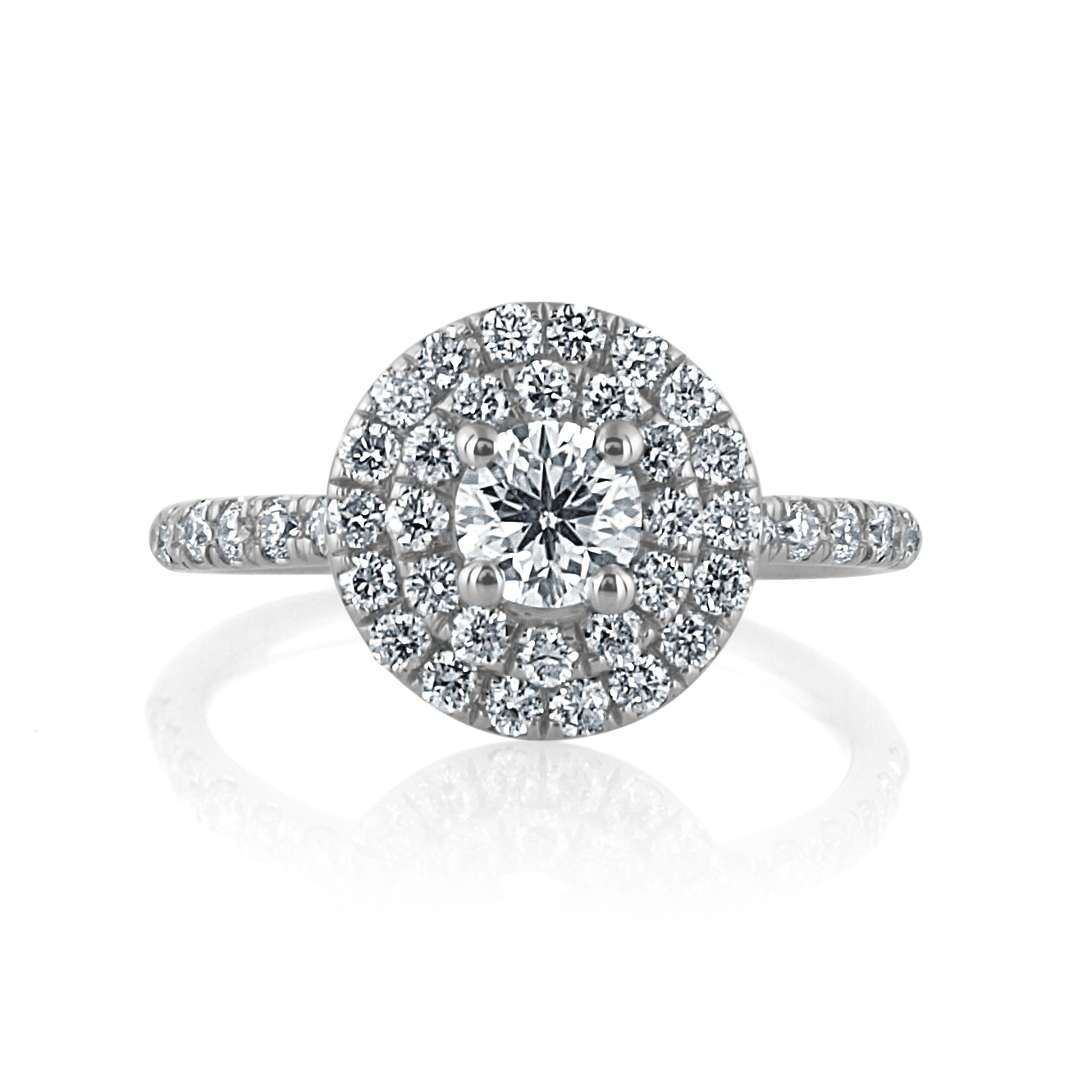 טבעת עוצרת נשימה בעיצוב עגול קלאסי עם טוויסט מודרני – יהלום עגול מרכזי נתון בין שתי הילות צפופות של יהלומים מנצנצים, שמעניקים לטבעת מראה דרמטי ומלא ברק מכל זווית. הזרועות משובצות אף הן ביהלומים, להשלמת מראה מרהיב ומוקפד. טבעת חלומית למי שמחפשת נוכחות של ממש.