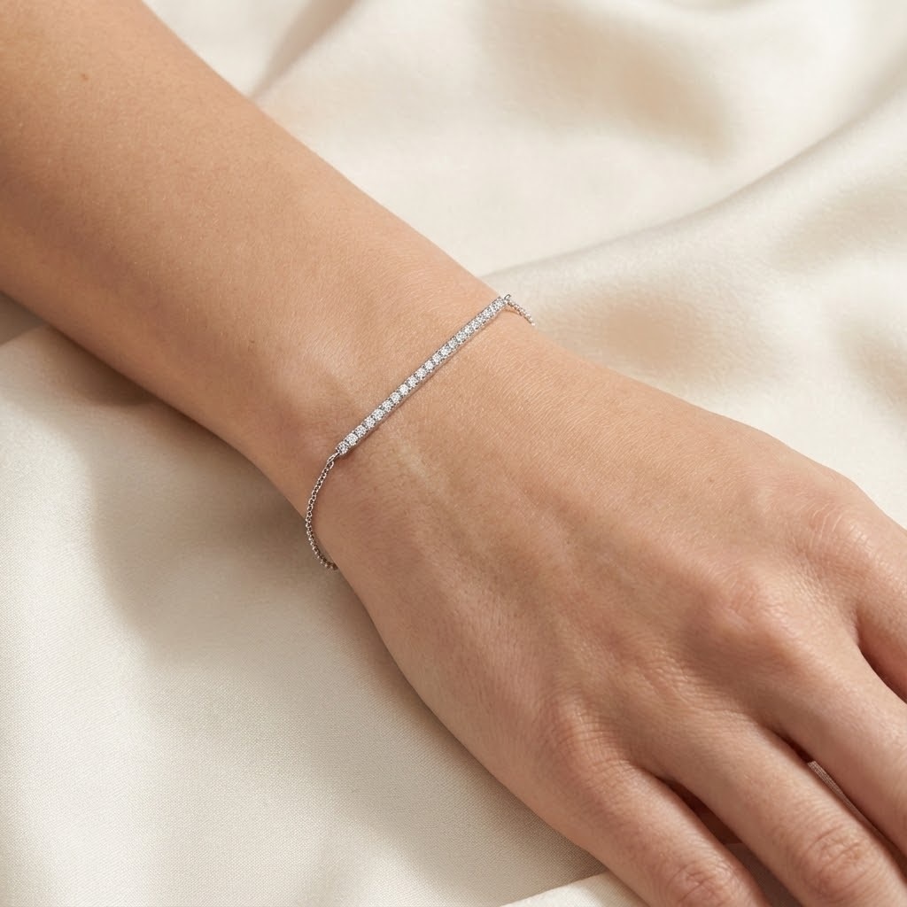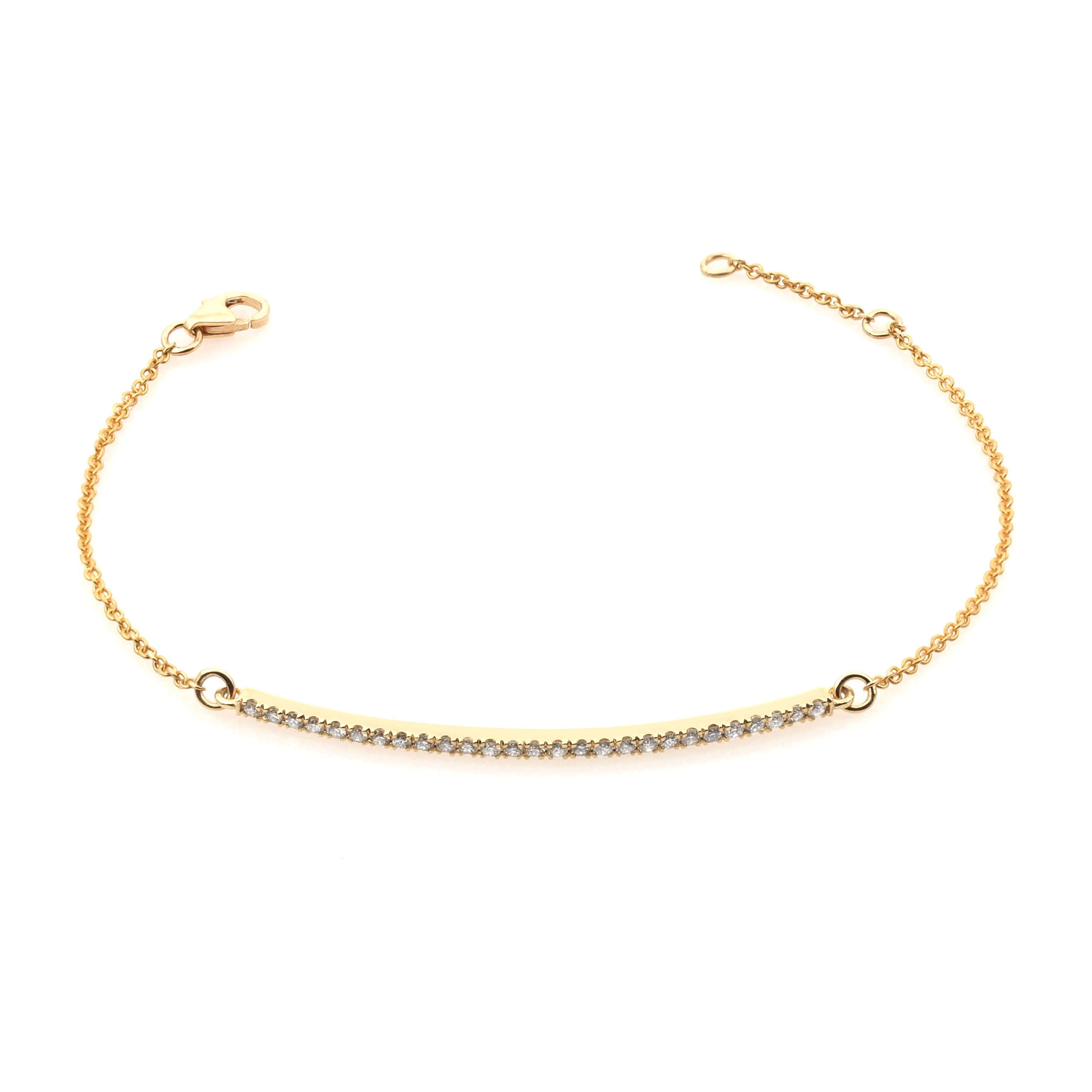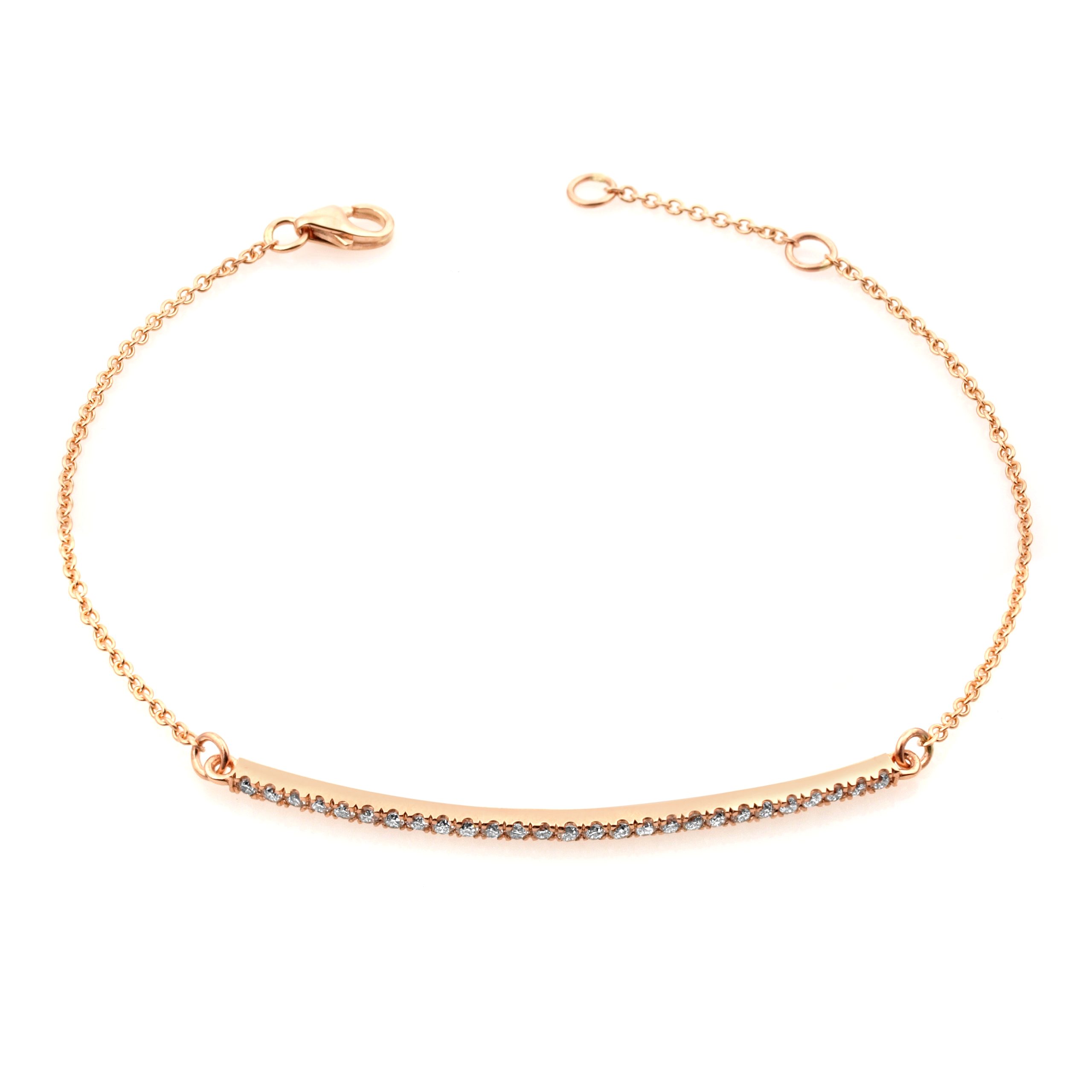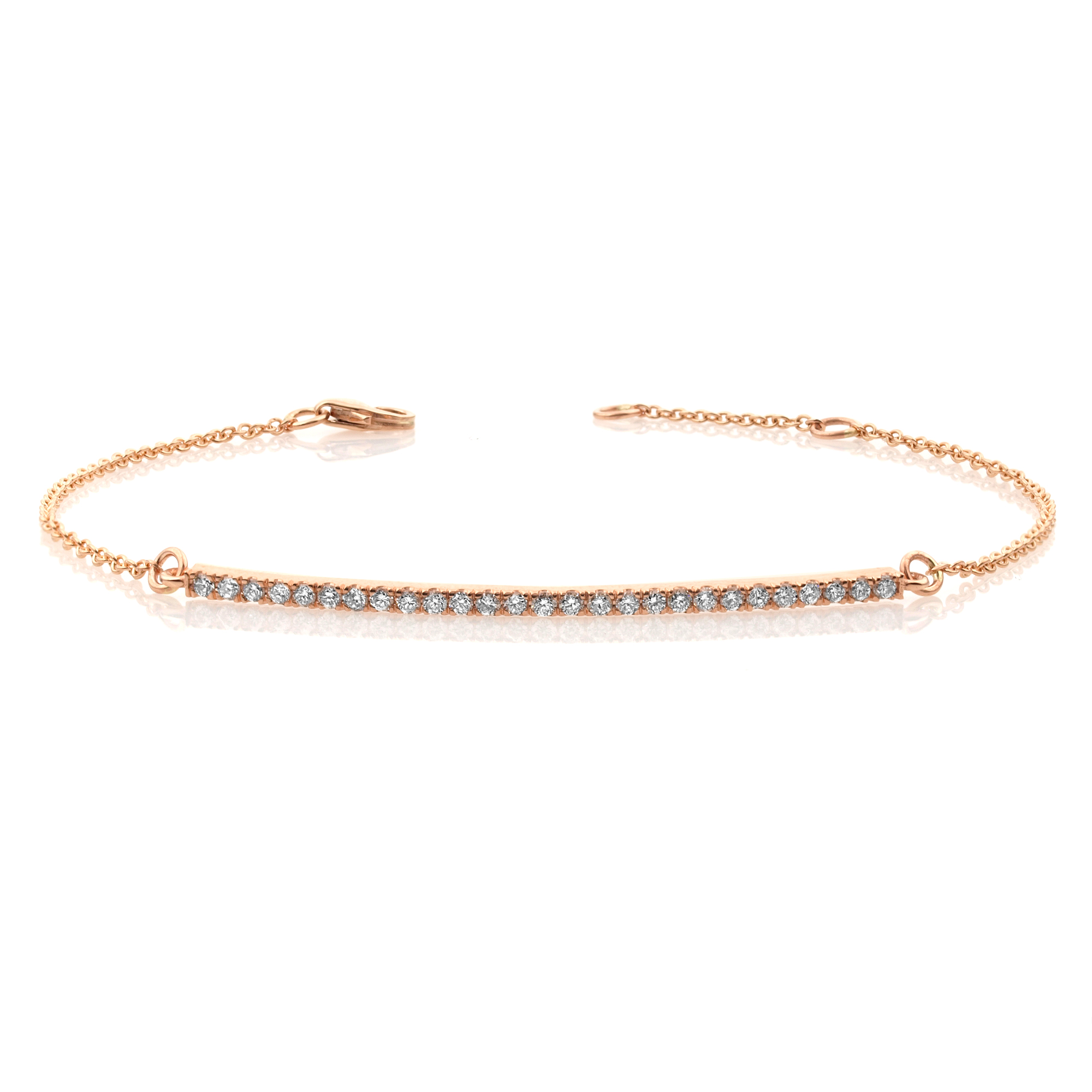 צמיד זיו מציג בר אופקי דק העטוף בשורה מדויקת של אבני יהלום נוצצות כל תנועה מלווה בגל אור רך השרשרת העדינה יוצרת תחושת קלילות על פרק היד והמתכת החמה של זהב ורוד מדגישה את הברק הקריסטלי של האבנים עיצוב זה מתאים לשילוב עם תכשיטים אחרים או ללבישה בפני עצמה