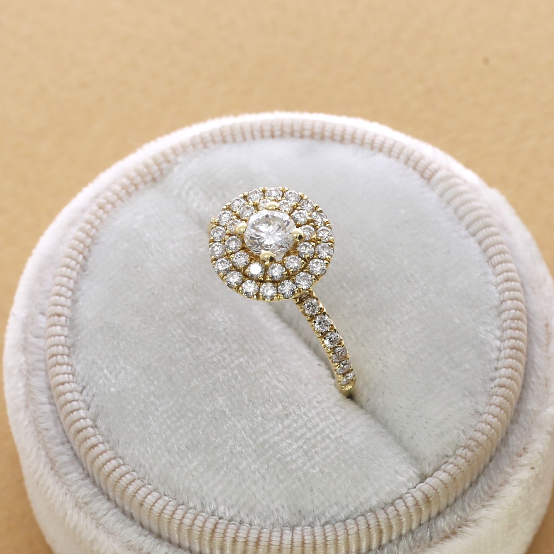 אוריאל היא טבעת יוקרתית בעיצוב עגול מרהיב, שמפגישה בין סימטריה מושלמת לניצוץ מרהיב. במרכזה שיבוץ יהלום עגול מלוטש, מוקף בשתי מסגרות Halo צפופות ויוקרתיות המשובצות בעשרות יהלומים קטנים – ליצירת עומק וקסם בלתי נשכח.