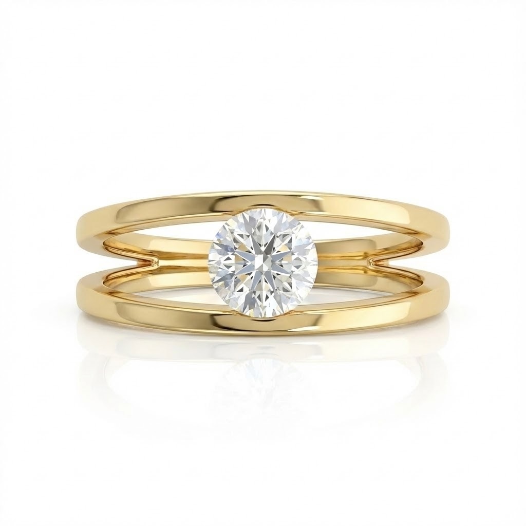 סולרה היא טבעת בעיצוב פתוח, חדשני ונקי שמזמן מבט שני. במרכזה יהלום עגול מבריק התלוי בין שני פסי זהב – כאילו מרחף באוויר.