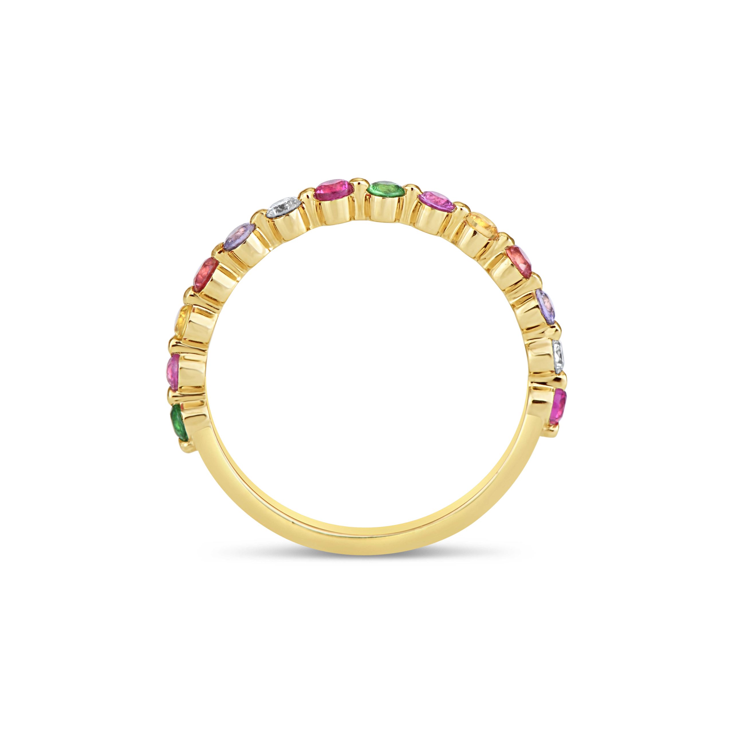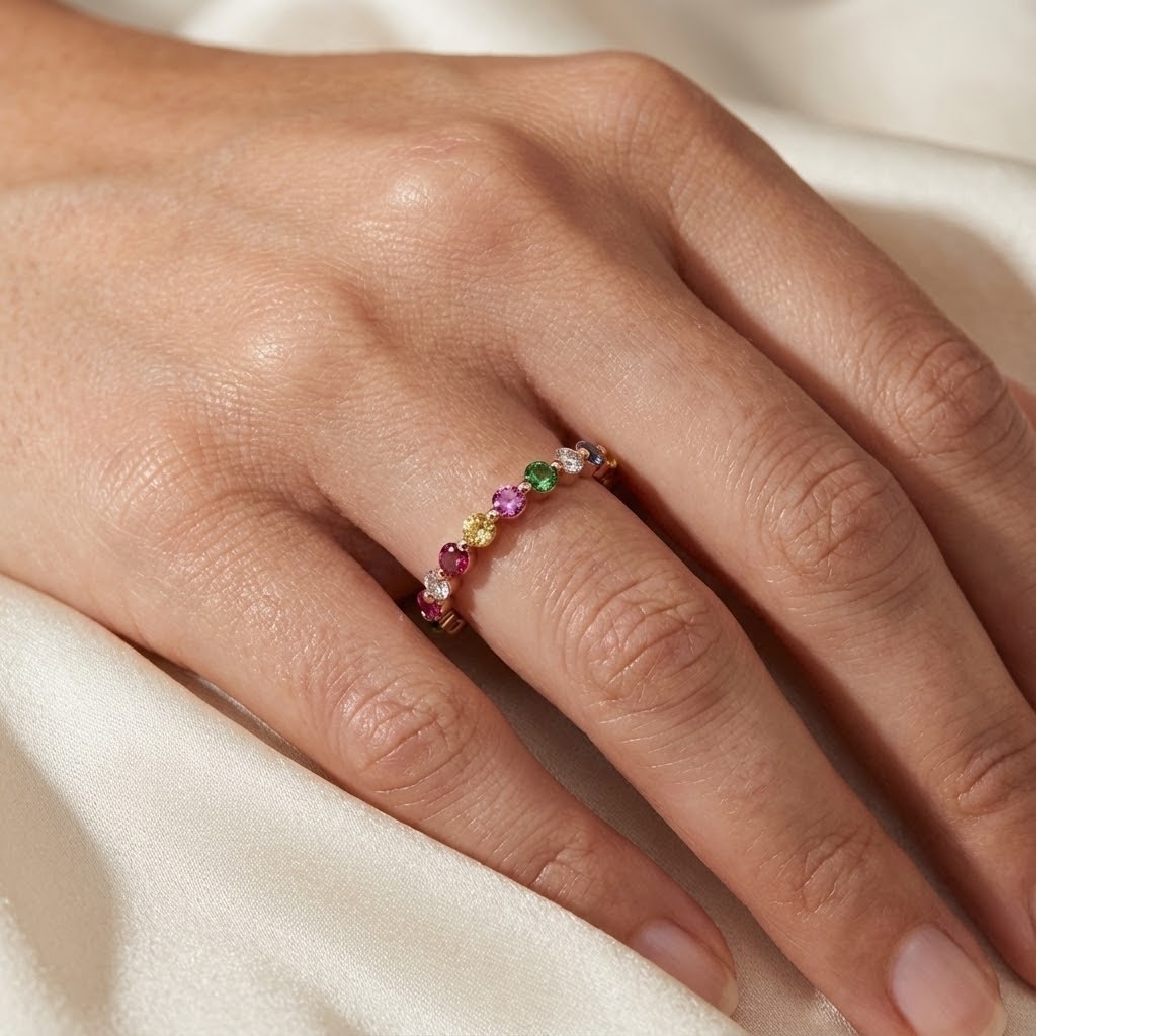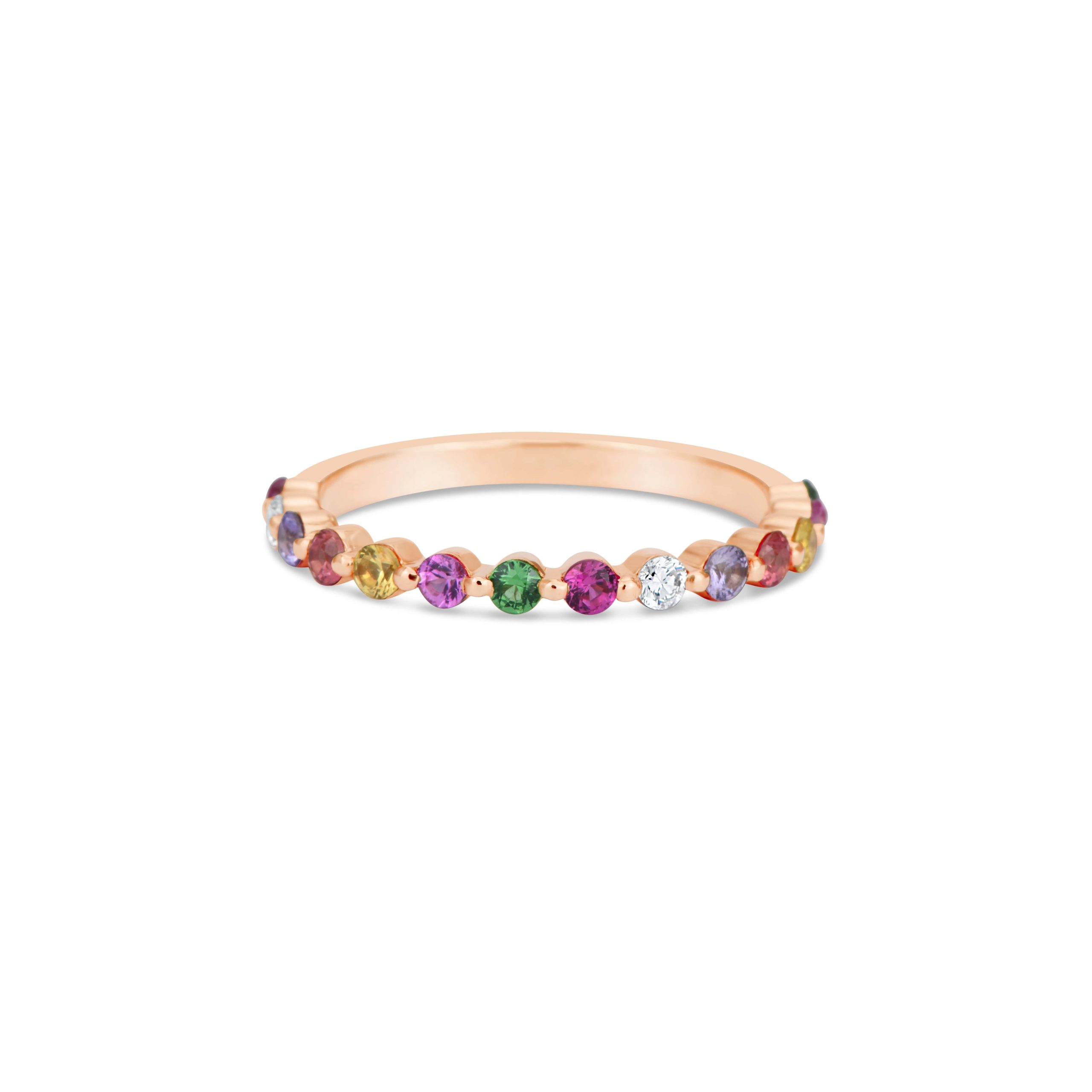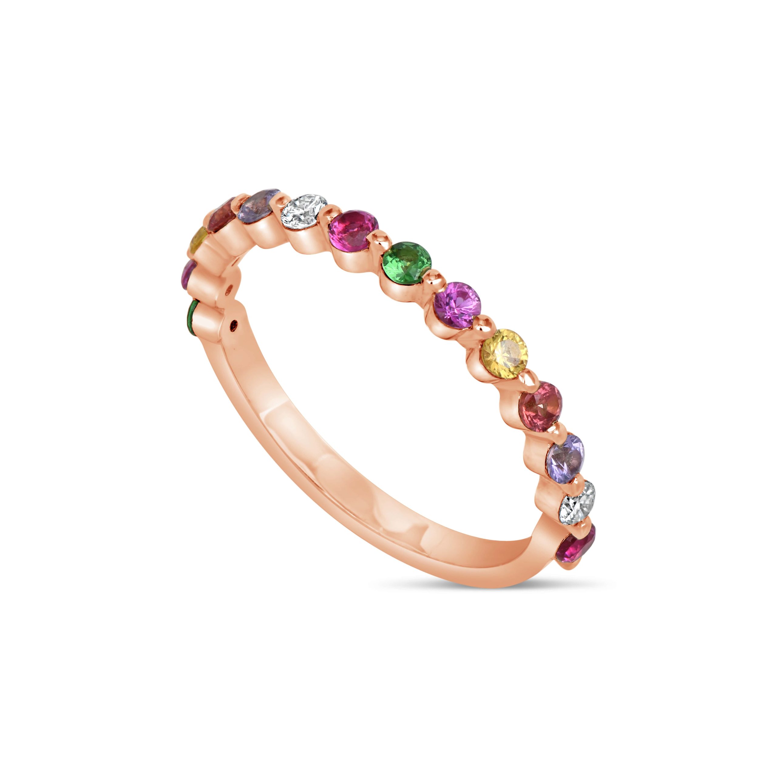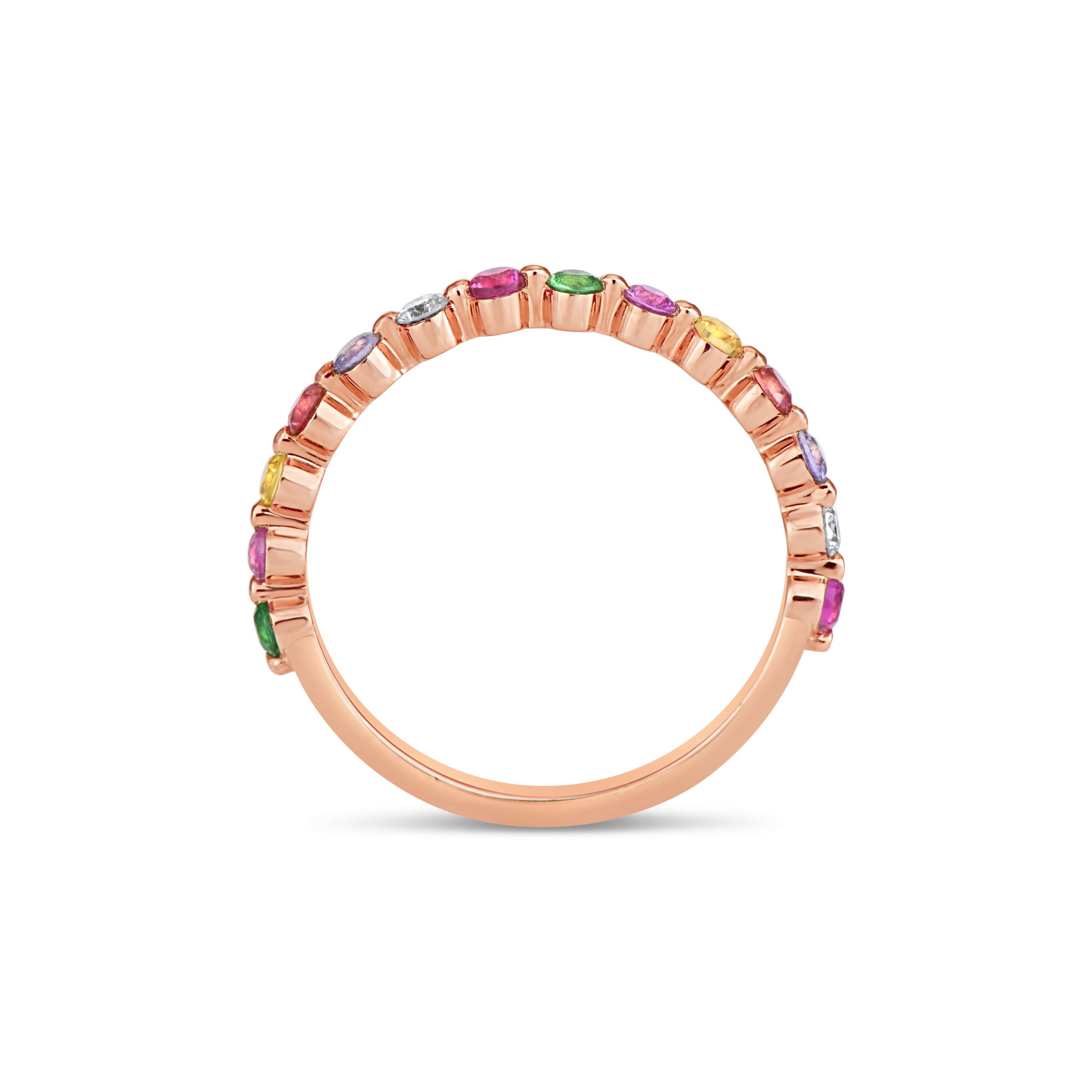 טבעת עדינה עשויה זהב ורוד מוקפד, שעל זרוע הטבעת משובצות אבני חן עגולות בשלל גוונים – ורוד, סגול, ירוק, צהוב ולובן – שחונקות את האצבע בקשת נצנצת של צבע ושמחה. כל אבן נתפסת בשיבוץ בזל דק שמדגיש את הגוון הטבעי שלה ומעניק מראה נעים לעין, בעוד הזרוע החלקה והמחודדת מחזקת את הפרופורציות ומבטיחה נוחות יומיומית.