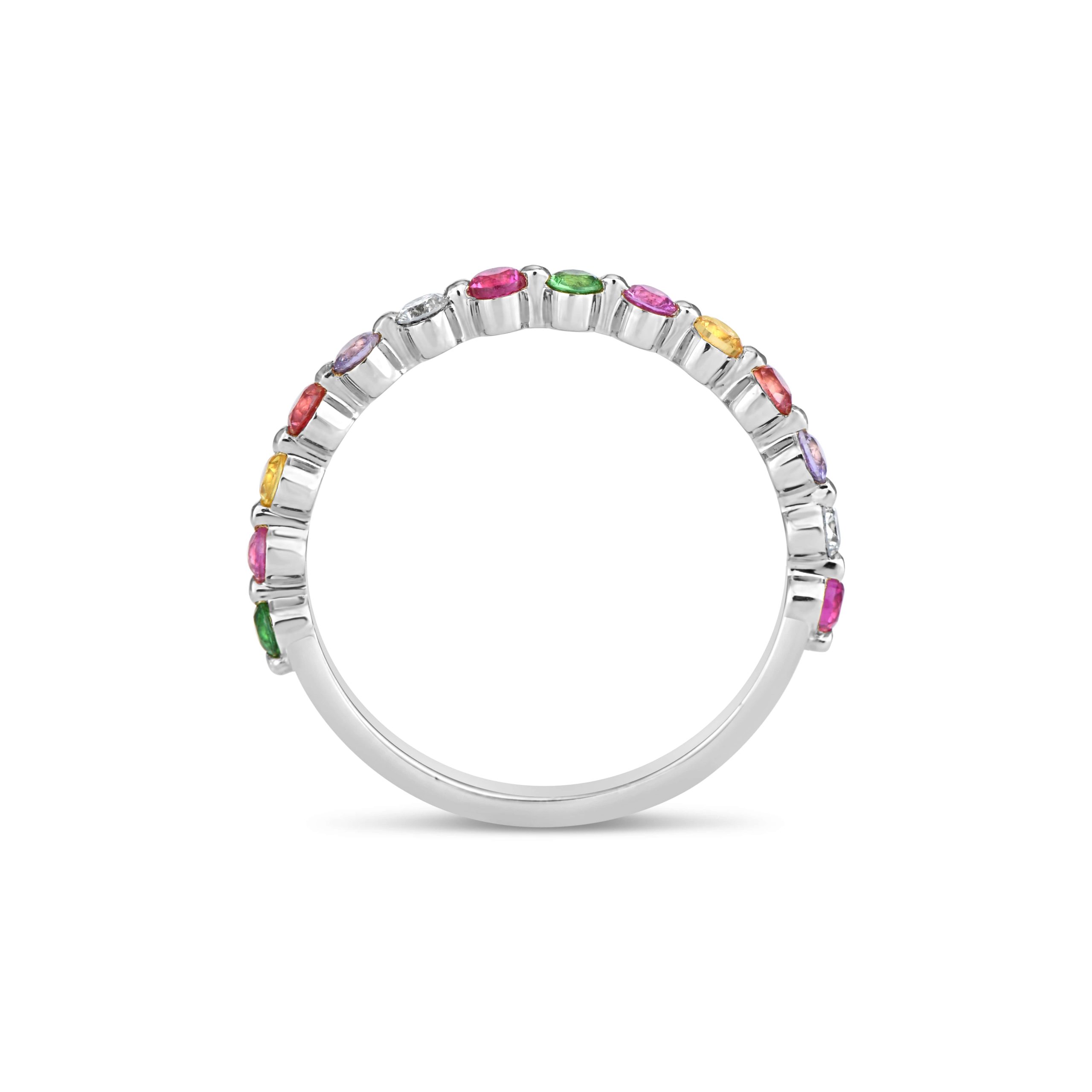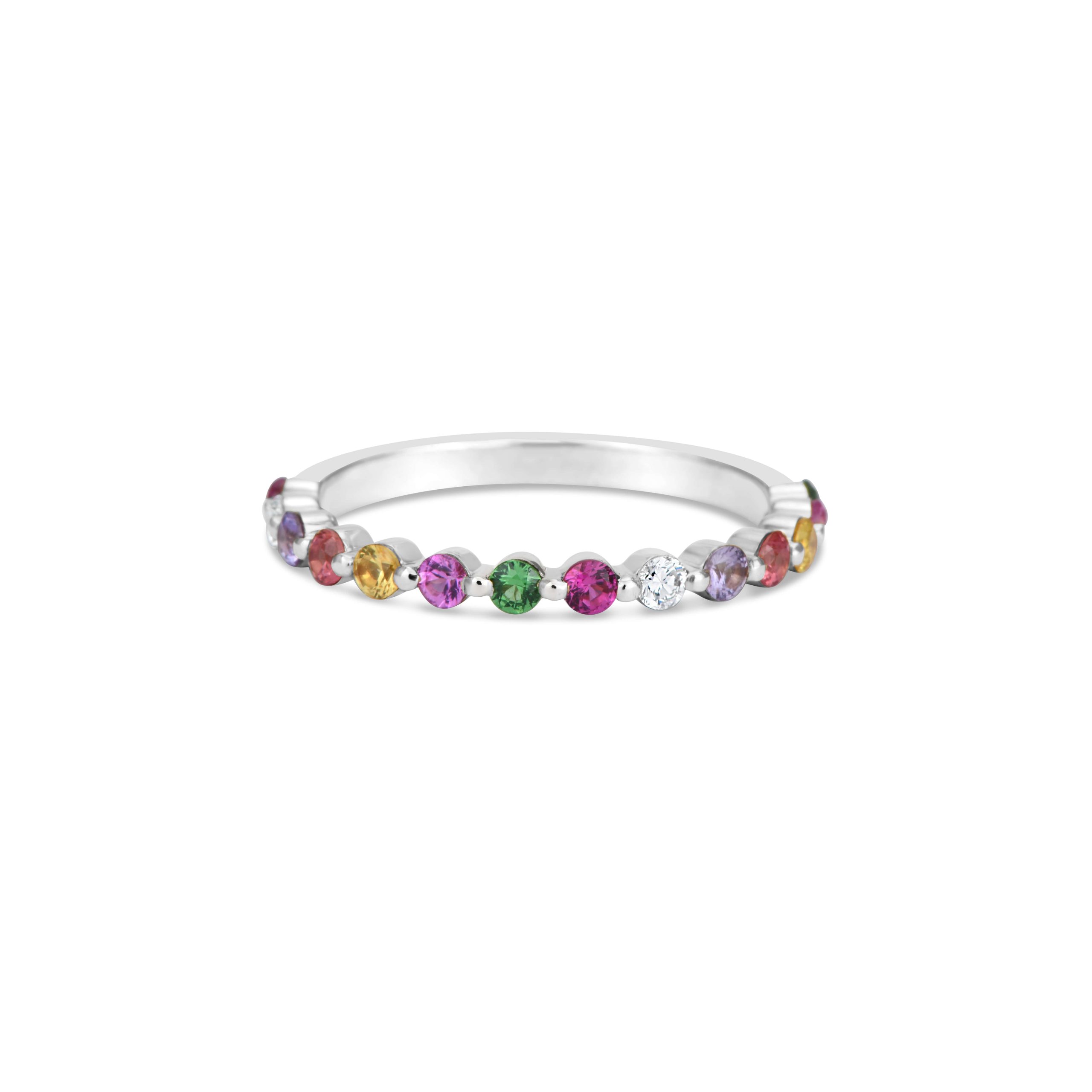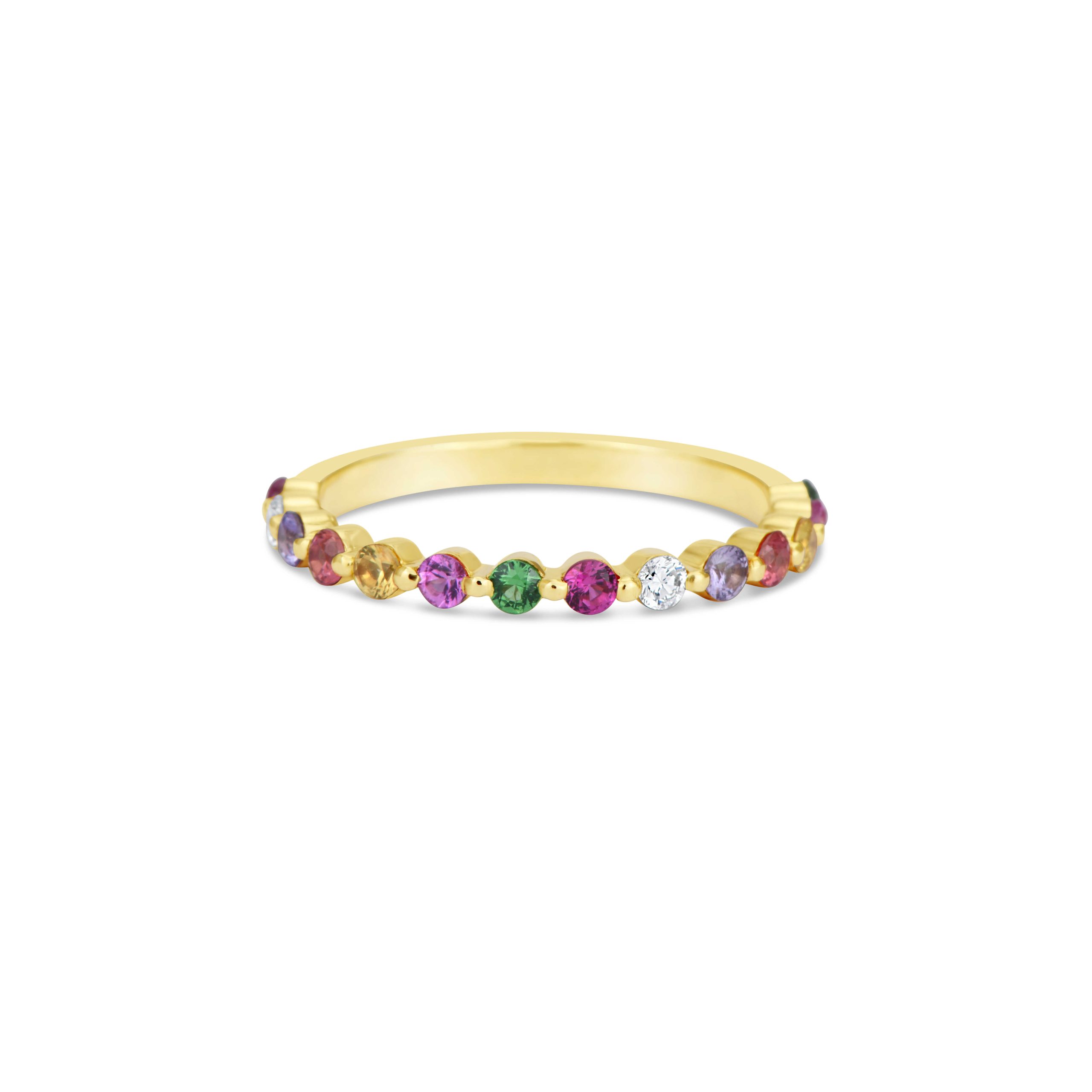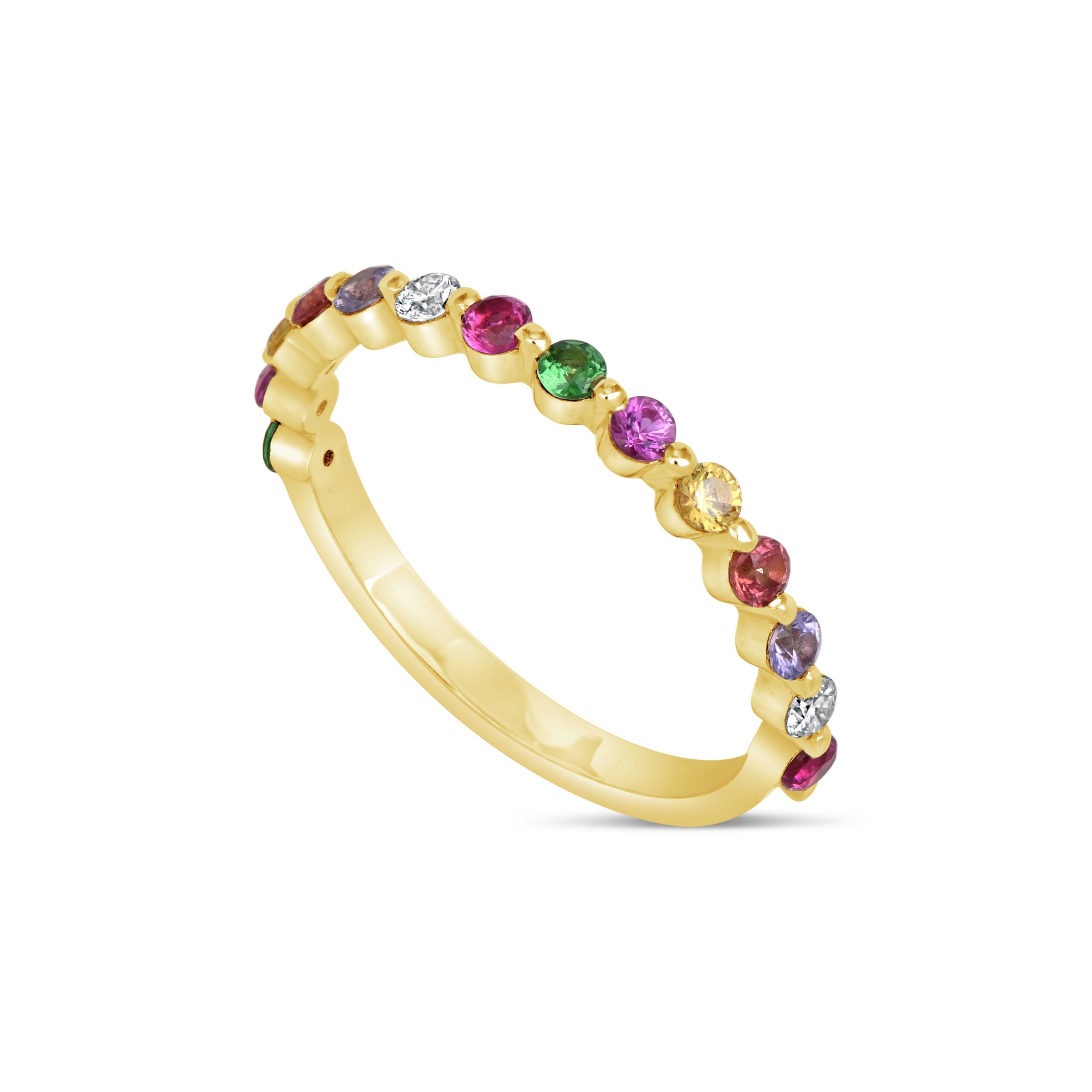 טבעת עדינה עשויה זהב ורוד מוקפד, שעל זרוע הטבעת משובצות אבני חן עגולות בשלל גוונים – ורוד, סגול, ירוק, צהוב ולובן – שחונקות את האצבע בקשת נצנצת של צבע ושמחה. כל אבן נתפסת בשיבוץ בזל דק שמדגיש את הגוון הטבעי שלה ומעניק מראה נעים לעין, בעוד הזרוע החלקה והמחודדת מחזקת את הפרופורציות ומבטיחה נוחות יומיומית.
