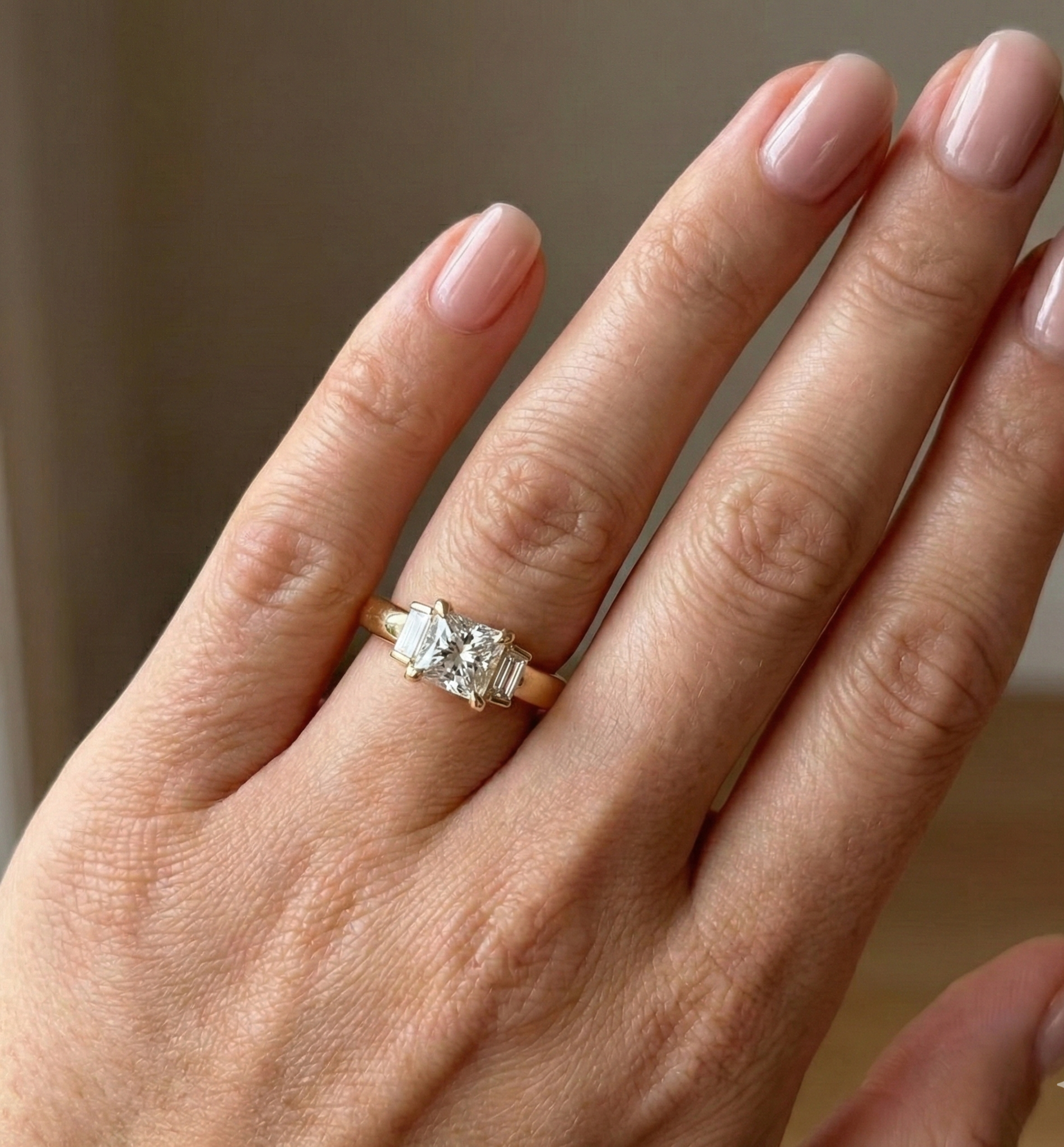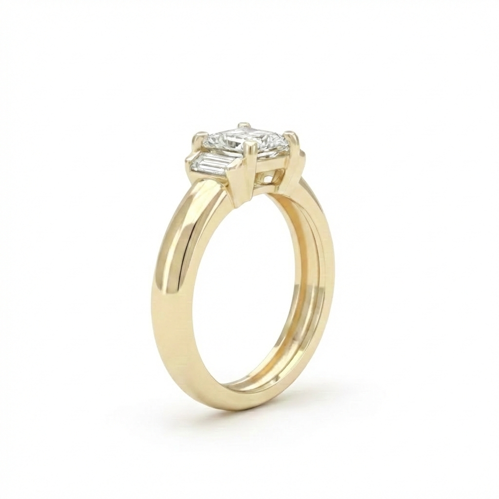 • עיצוב הטרילוגיה: לצד היהלום המרכזי משובצים שני יהלומים מלבניים (Baguette/Emerald side stones) המדגישים את רוחב הטבעת ויוצרים זרימה מושלמת על האצבע.