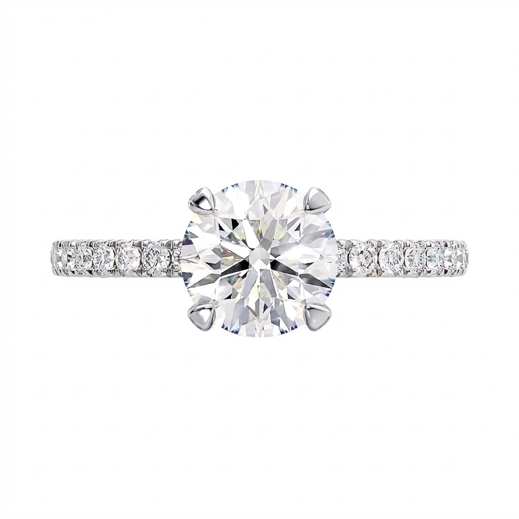 במרכזה משובץ יהלום עגול בולט בארבע שיניים, הנתמך בשיבוץ צד של יהלומים קטנים הממשיכים את הברק לכל אורך הטבעת.