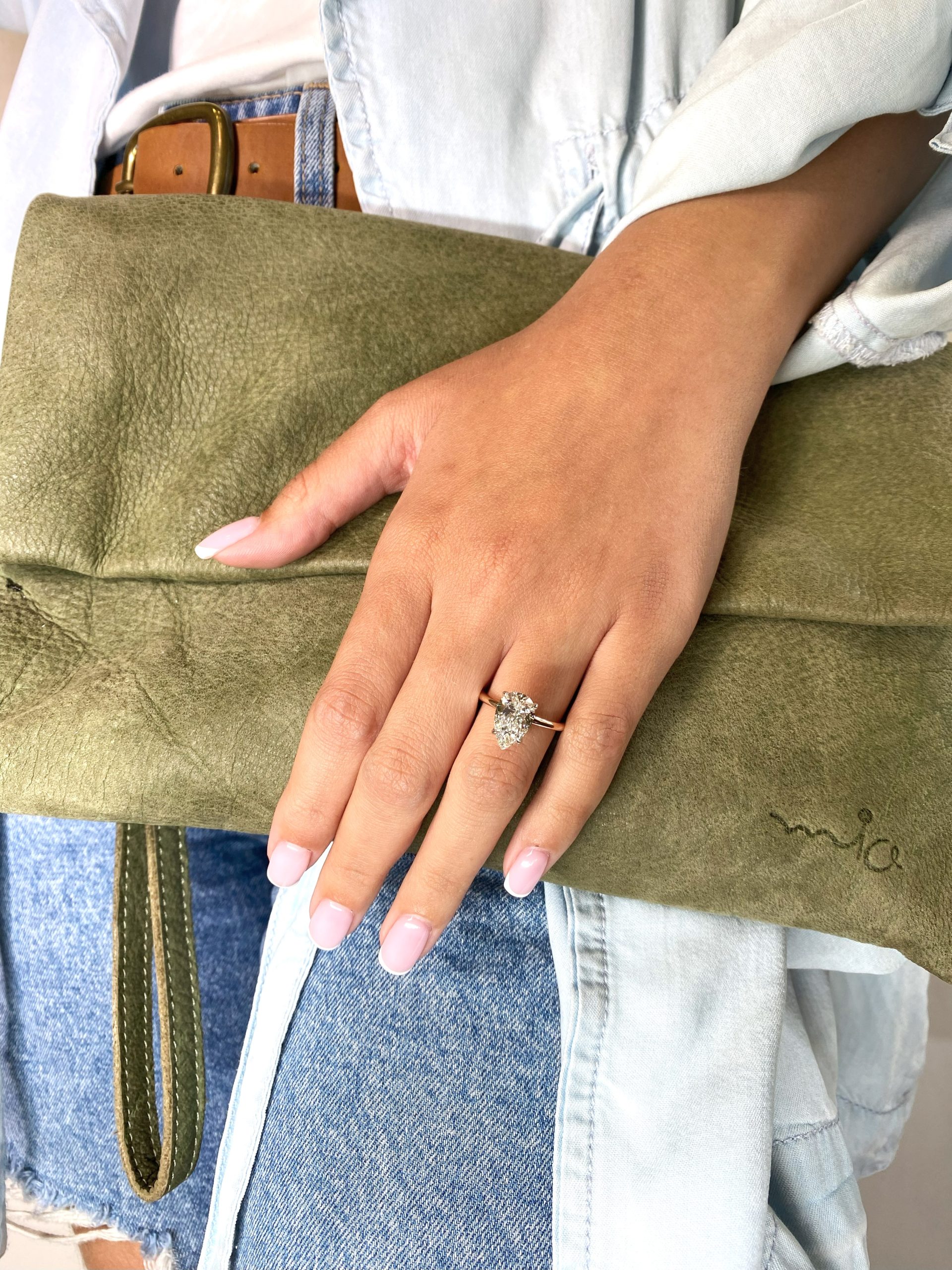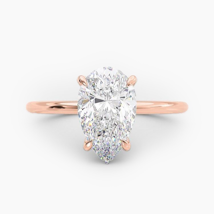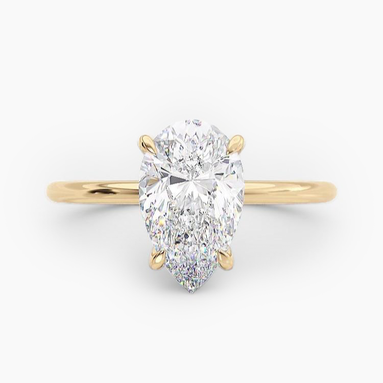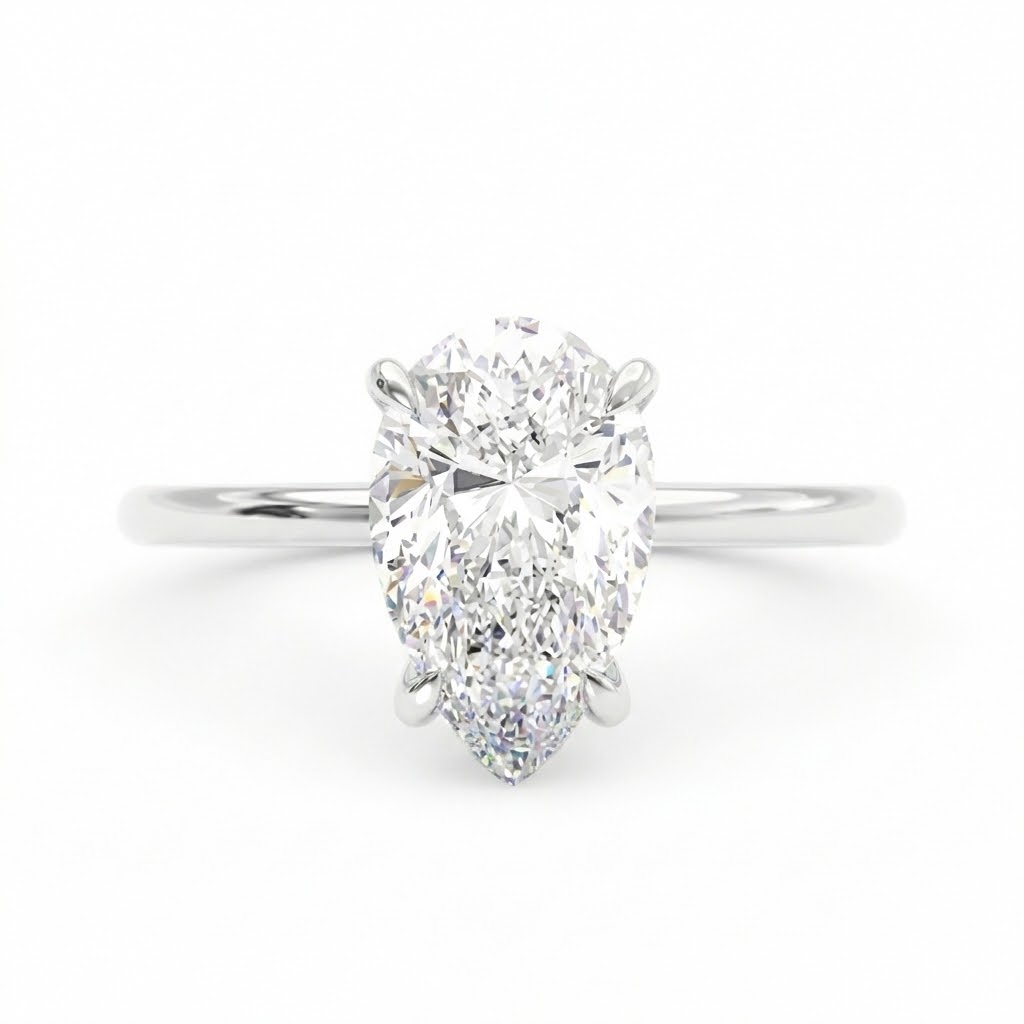 במרכזה יהלום בחיתוך טיפה – אבן נשית וייחודית, המשובצת בשלוש שיניים דקות שמאפשרות לה לבלוט ולהאיר מכל כיוון. הזרוע החלקה והנקייה מדגישה את צורת הטיפה ויוצרת מראה מינימליסטי אך מרשים.