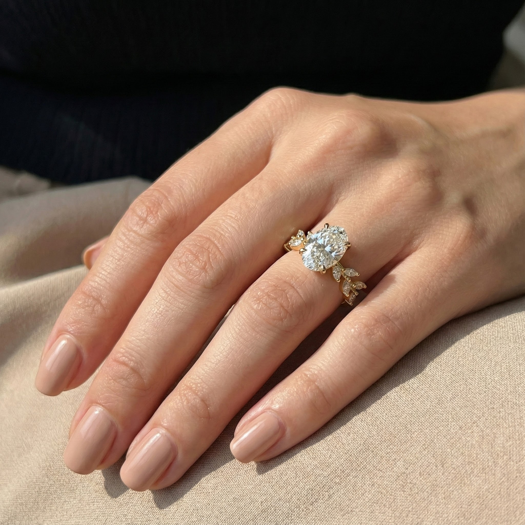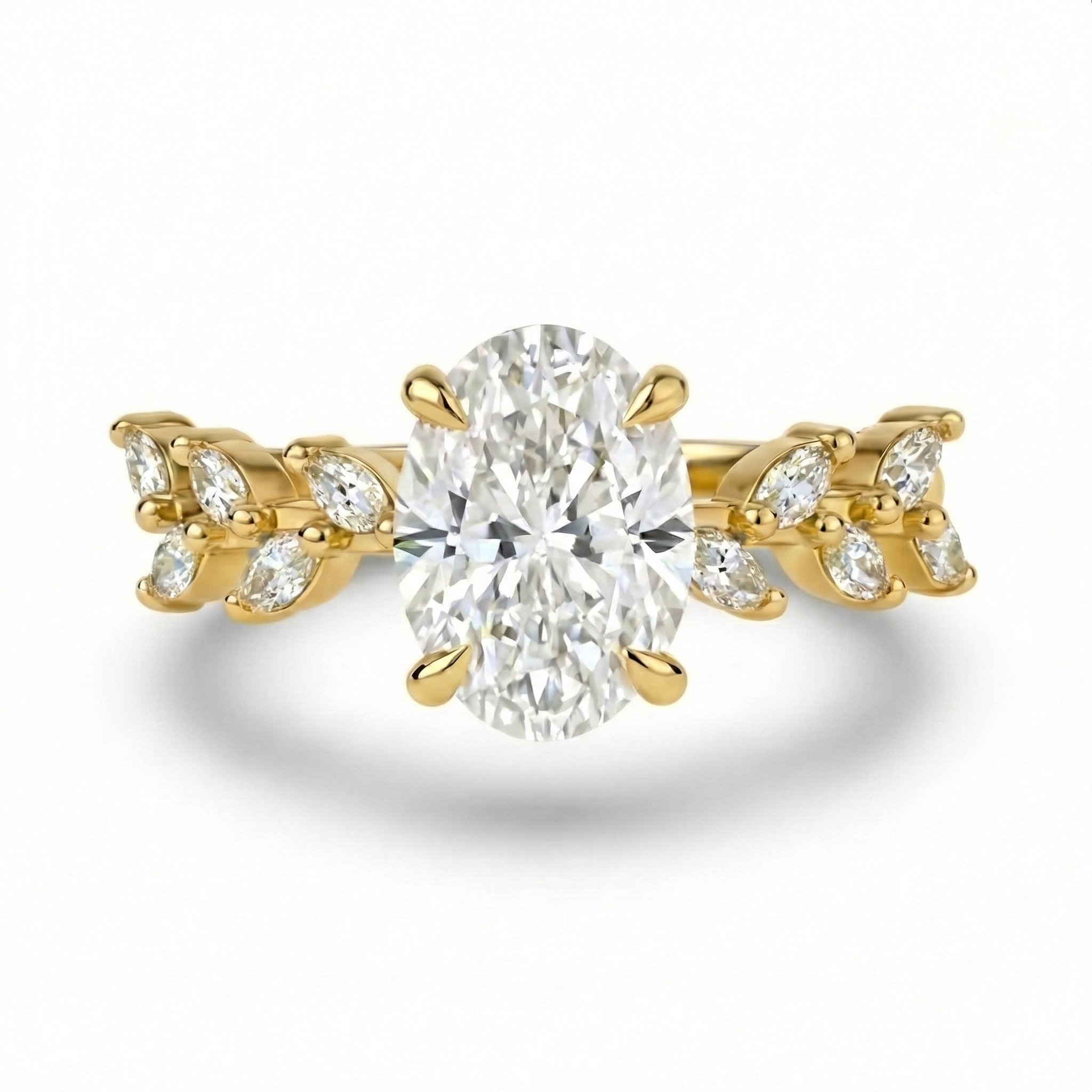 במרכזה משובץ יהלום מרכזי מרשים בחיתוך אובל, הנתפס ב-4 שיניים בעיצוב קלאסי. משני צידי היהלום, זרועות הטבעת מקושטות באלמנטים בצורת עלים משובצים יהלומים בחיתוך מרקיזה ועדינים עגולים, היוצרים מראה הרמוני וייחודי במיוחד.