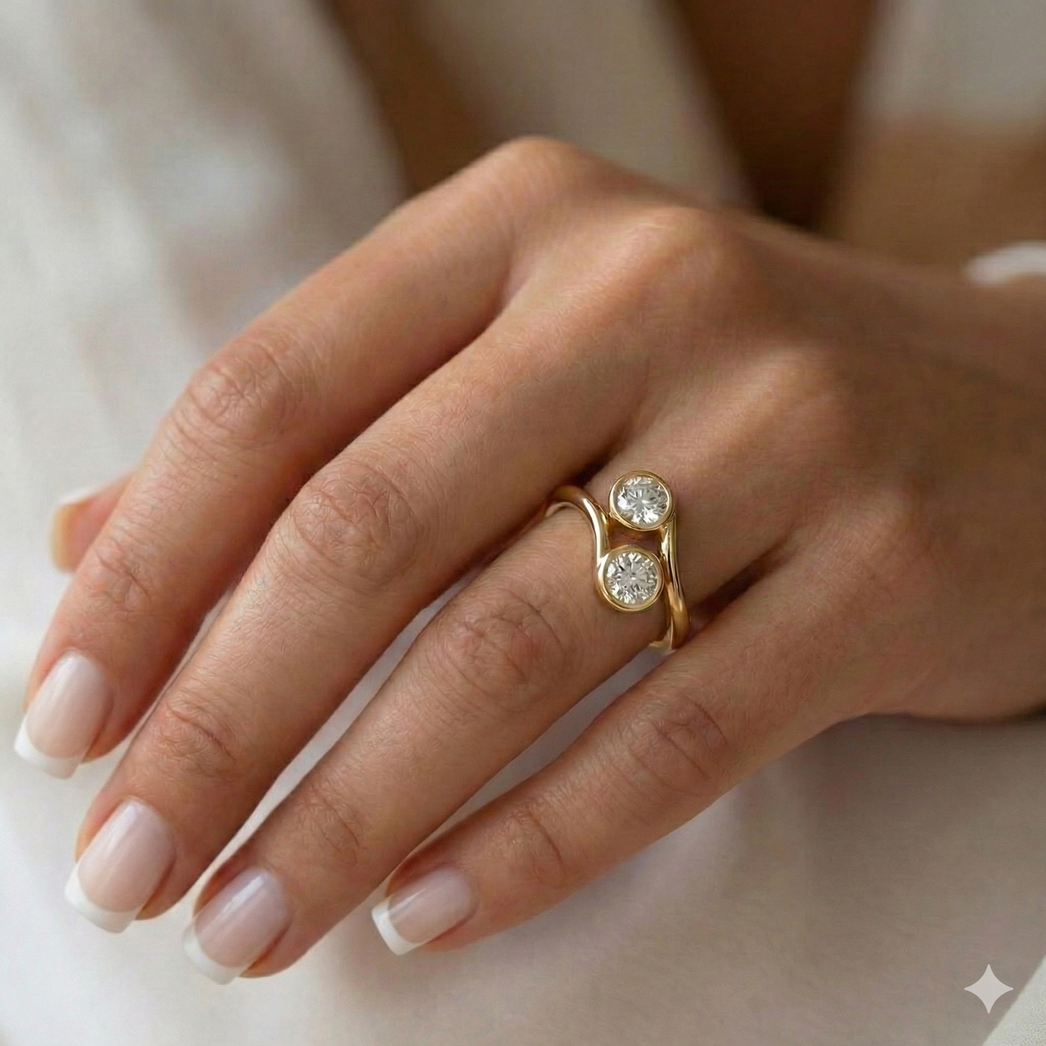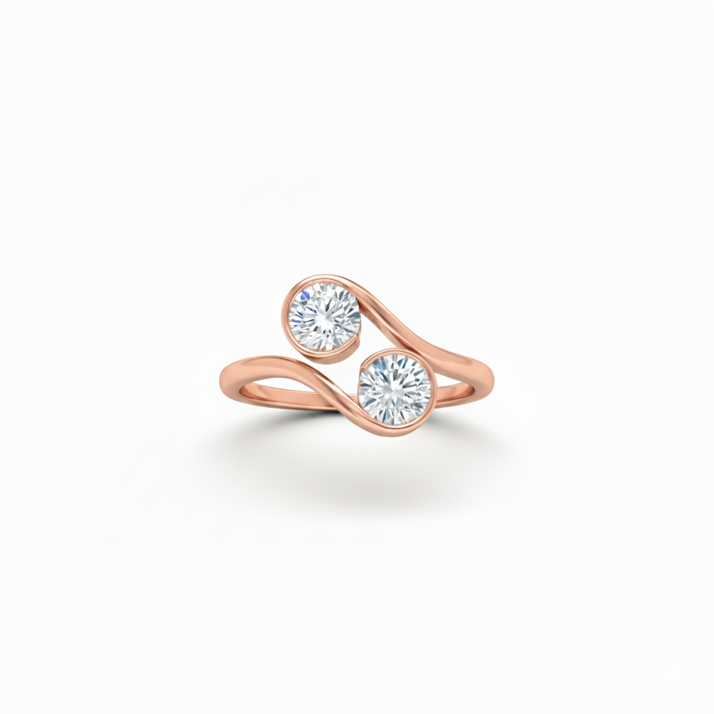טבעת עדינה ומעודנת עשויה זהב 14k, משובצת בזוג יהלומים עגולים מנצנצים. כל יהלום נתפס בשיבוץ חצי מריחה היוצר מראה של ברק מתמשך, ריקוד טנגו של 2 יהלומים. הטבעת מדגישה מראה נשי ועדכני, ומעניקה תחושה של קלילות ויוקרה גם כשנערמת על גבי טבעות נוספות.
