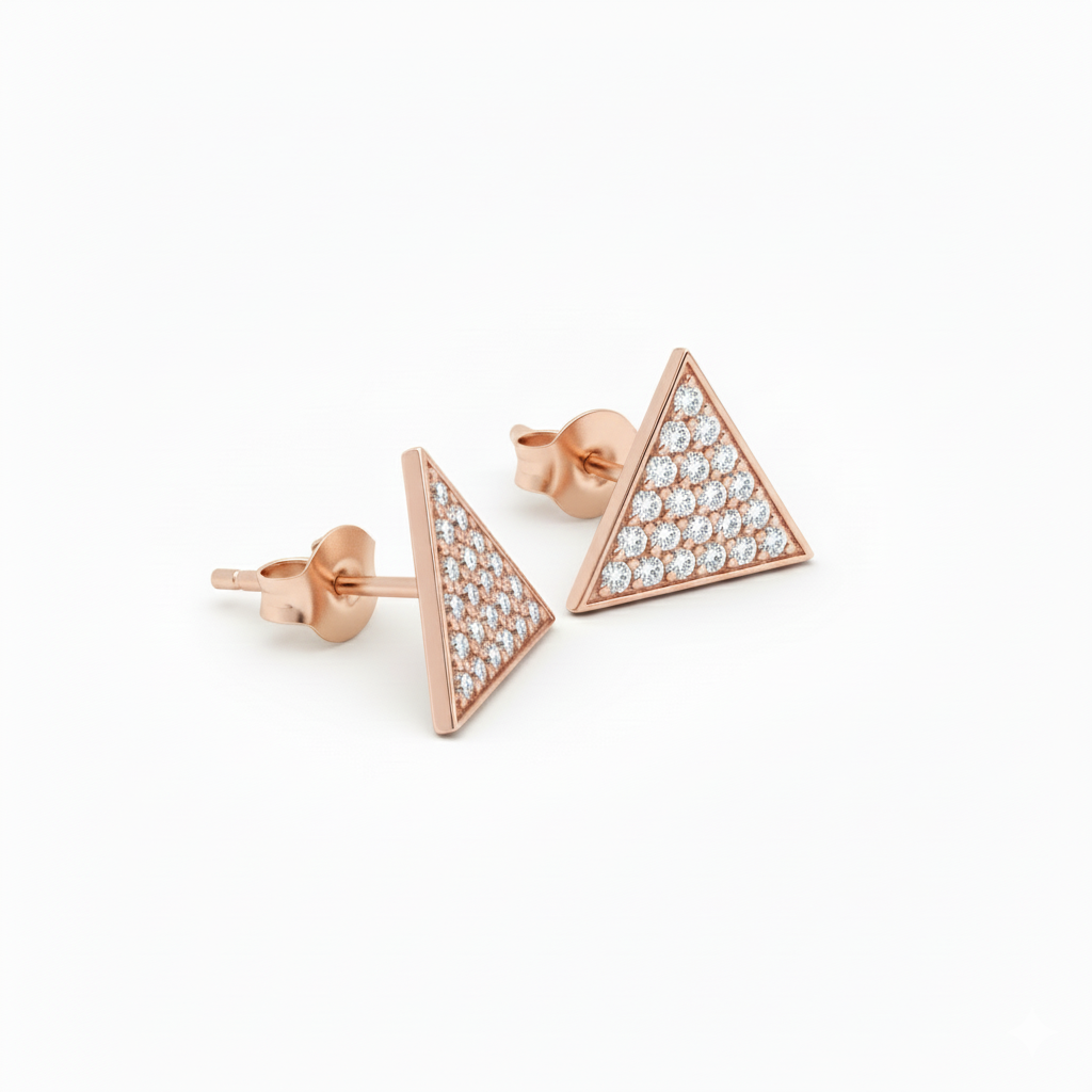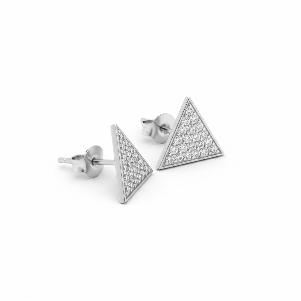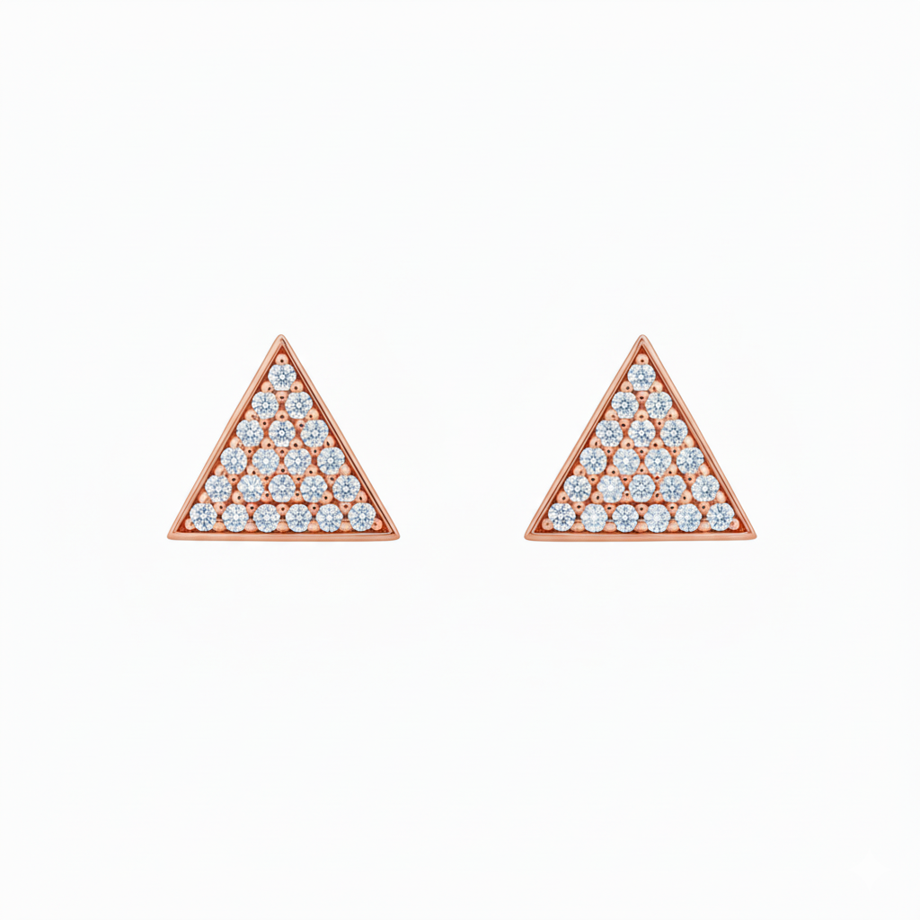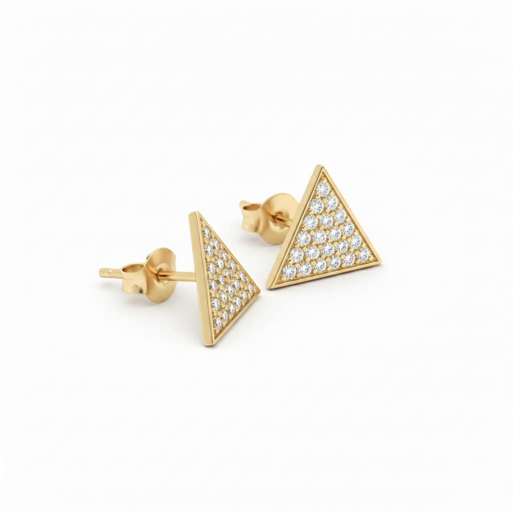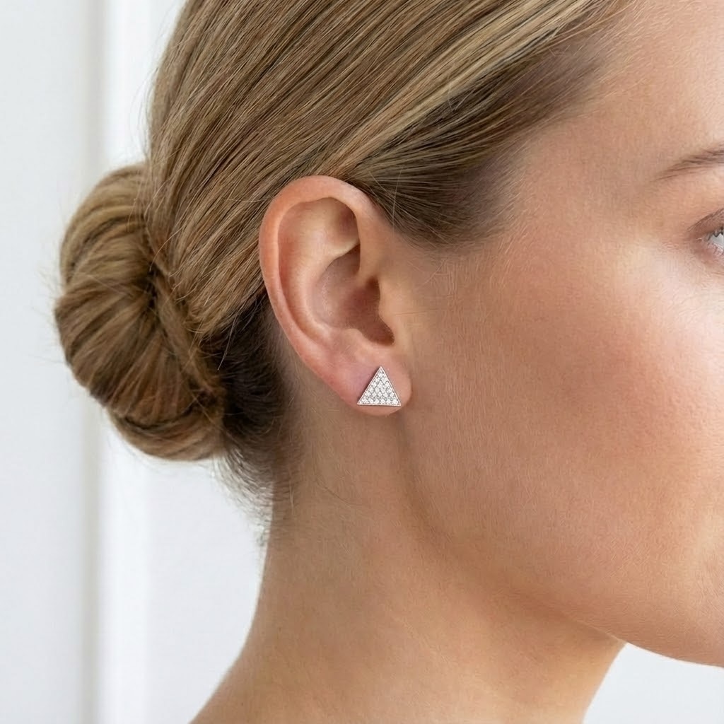 טריי , עגילי סטד משולש‑שייפ משובצים יהלומים קטנטנים בשורה צפופה ויוצרים משטח מלוטש ונוצץ. כל עגיל מעוצב כמשולש, בשיבוץ pave מלא שמבטיח ברק אחיד מכל זווית. עובי קל והדגש על פני השטח המשובץ הופכים אותם לעגילים יומיומיים אלגנטיים שמתאימים לכל אוזן ולכל מראה, מהקז’ואל ועד הערבי.