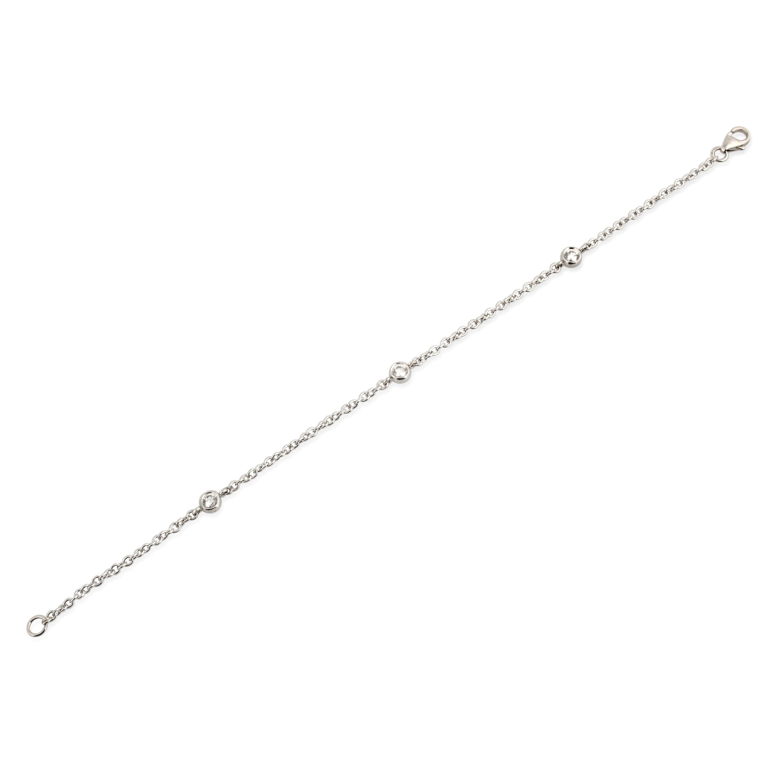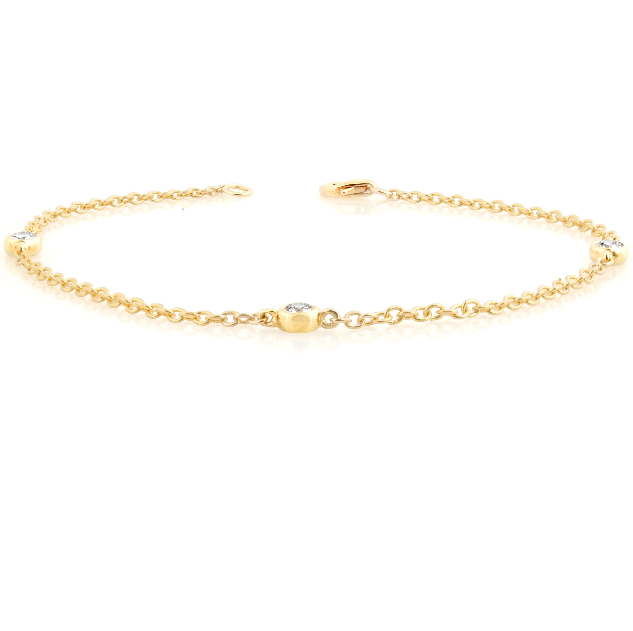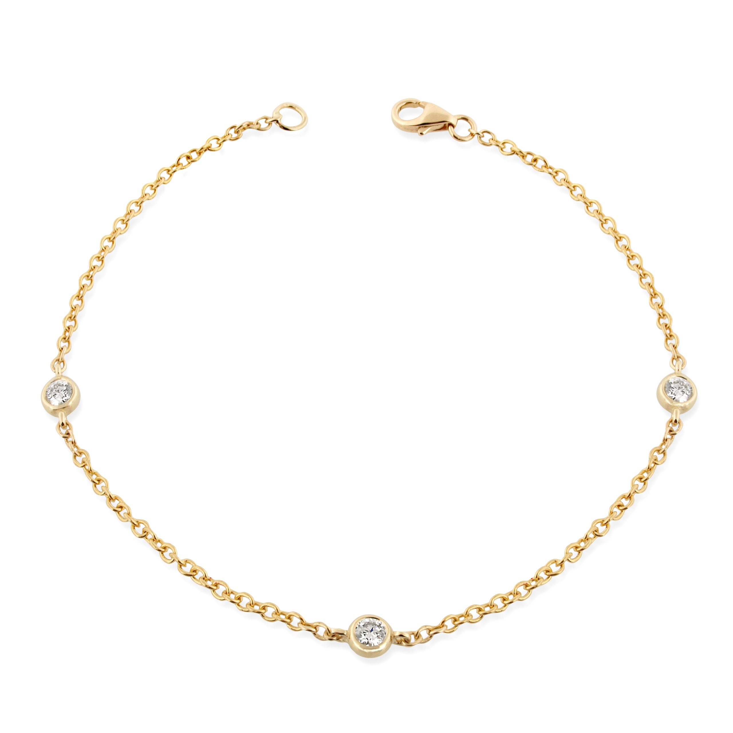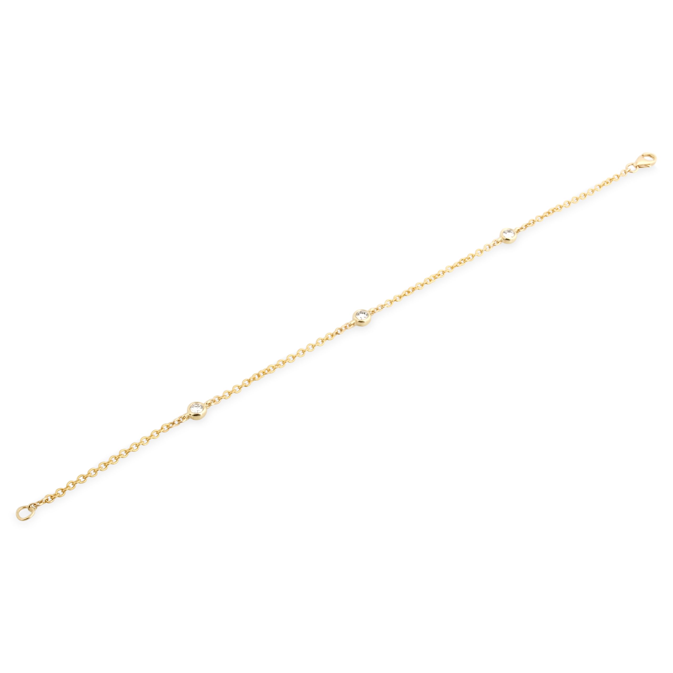 צמיד אלגנטי ומעודן עשוי זהב צהוב קלאסי, המתהדר בשלושה יהלומים עגולים משובצים בסגנון בזל, המפוזרים באופן סימטרי לאורך שרשרת עדינה. כל יהלום נתפס במסגרת מתכתית דקה שמדגישה את זוהרו ומעניקה לו עומק ייחודי, בעוד השרשרת המינימליסטית מעניקה תחושה של קלילות ונוחות מרבית ליום‑יום ולערב יוצא דופן.