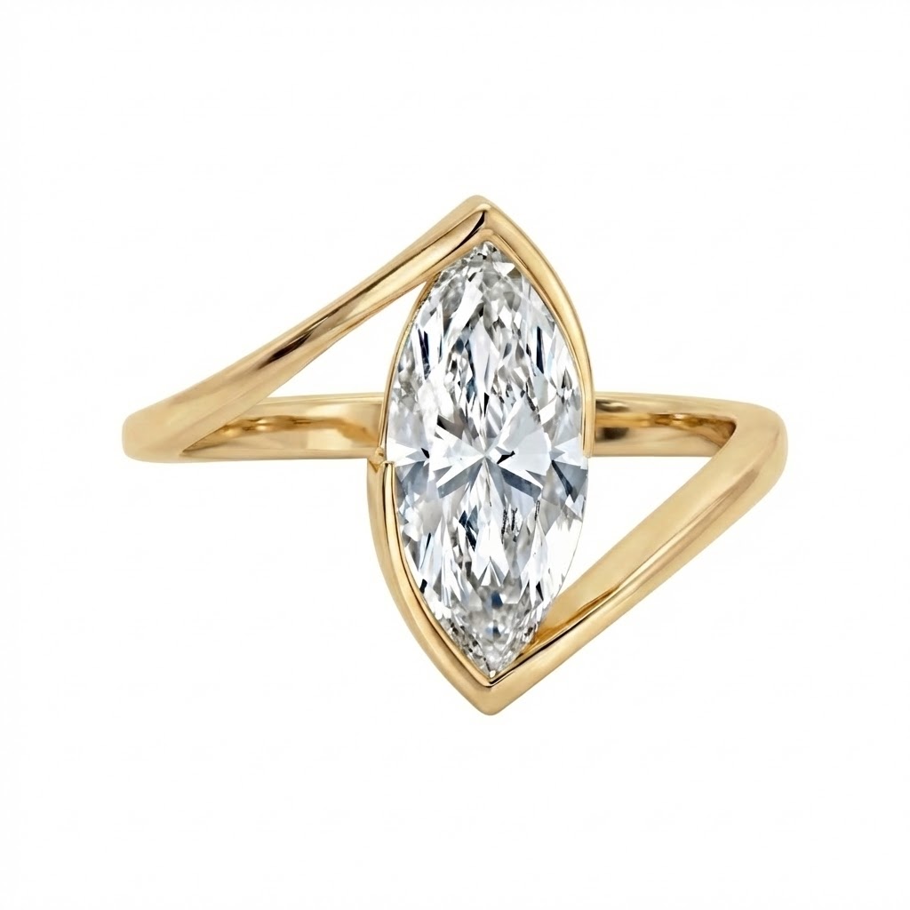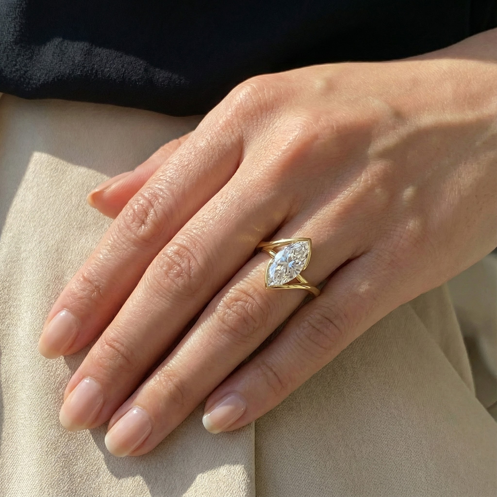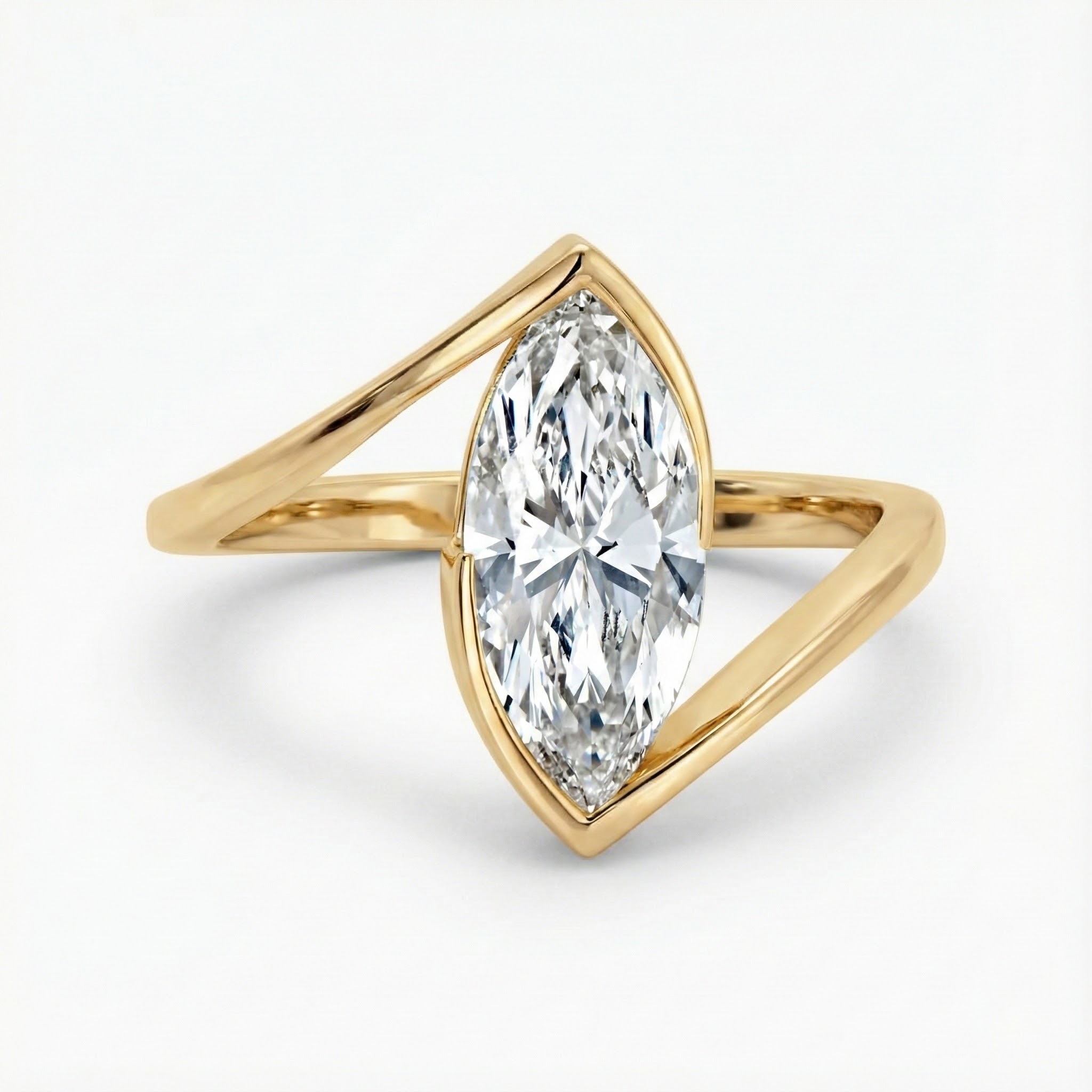 טבעת סוליטר חדשנית ועוצמתית יחדיו, עשויה זהב צהוב מוקפד, המשובצת יהלום מרכז חיתוך מרקיזה במשקל מרשים. היהלום נתפס בשיבוץ בזל (מריחה) חצי פתוח שמעצים את היהלום ומאפשר לטבעת להיות קלאסית חדשנים ווינטיג' בו זמנית. זרוע הטבעת בנויה בפרופורציה מאוזנת לקבלת מראה מושלם, ומקבלת צורה חלקה ונקייה המשלבת תחכום ונוחות לבישה יומיומית.