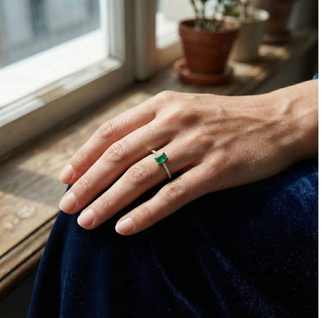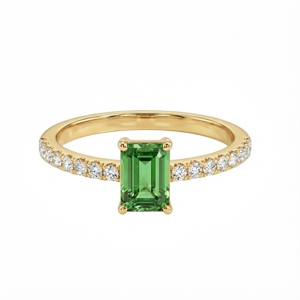 טבעת מושלמת בעיצוב עכשווי, עשויה זהב צהוב מוקפד, אבן חן טורמלין ירוקה במרכז לאורך הטבעת וזרוע משובצת יהלומים קטנים עגולים ולבנים היוצרת קומפוזיציה של תנועה ואיזון. הזרוע משובצת בשיבוץ Pavé של יהלומים היוצרים ברק חי ועשיר בכל סיבוב של האצבע. טבעת בעלת מראה אוורירי וקליל.
