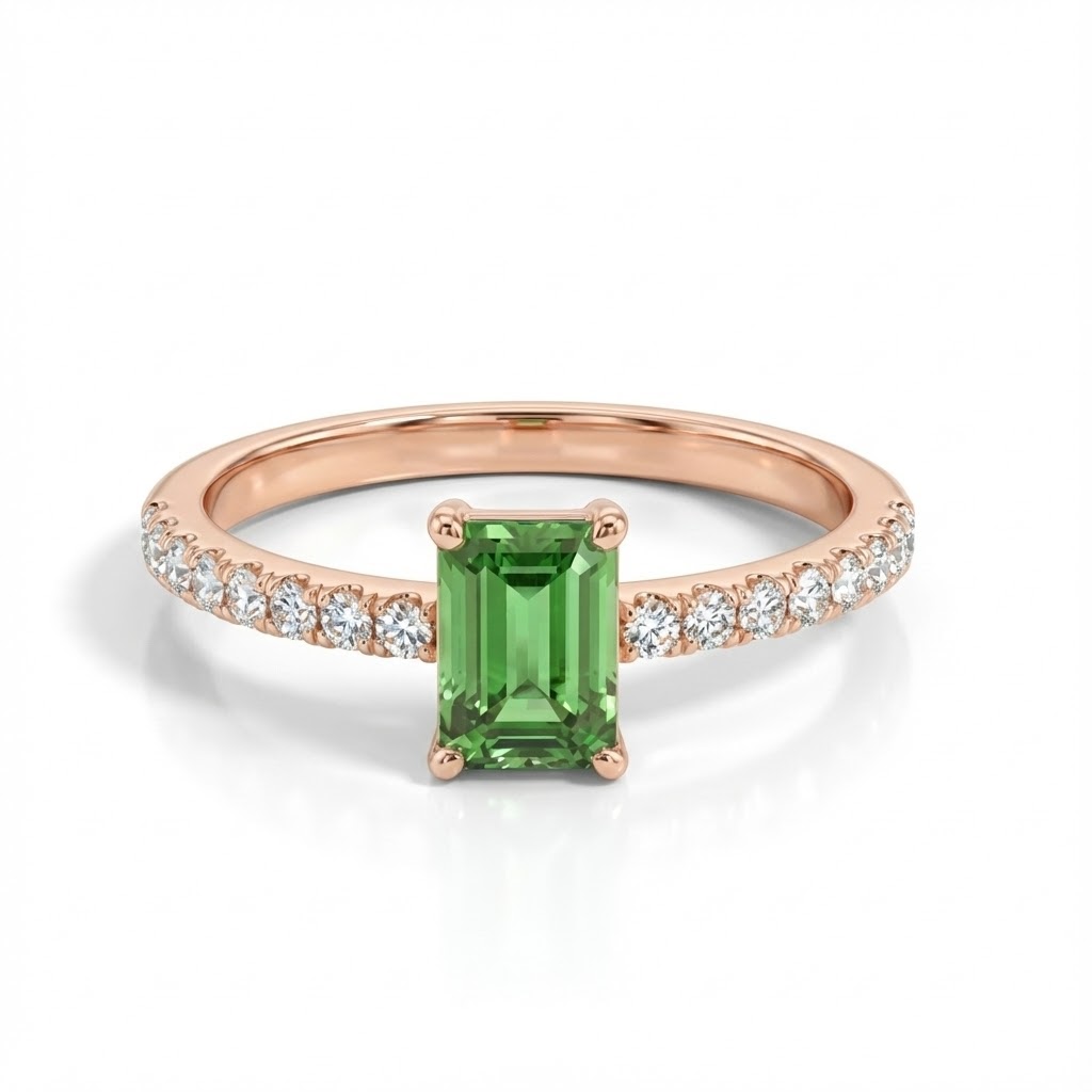 טבעת מושלמת בעיצוב עכשווי, עשויה זהב אדום מוקפד, אבן חן טורמלין ירוק במרכז לאורך הטבעת וזרוע משובצת יהלומים קטנים עגולים ולבנים היוצרת קומפוזיציה של תנועה ואיזון. הזרוע משובצת בשיבוץ Pavé של יהלומים היוצרים ברק חי ועשיר בכל סיבוב של האצבע. טבעת בעלת מראה אוורירי וקליל.