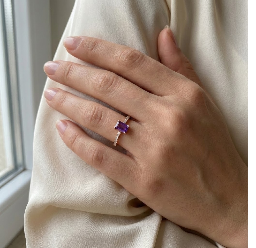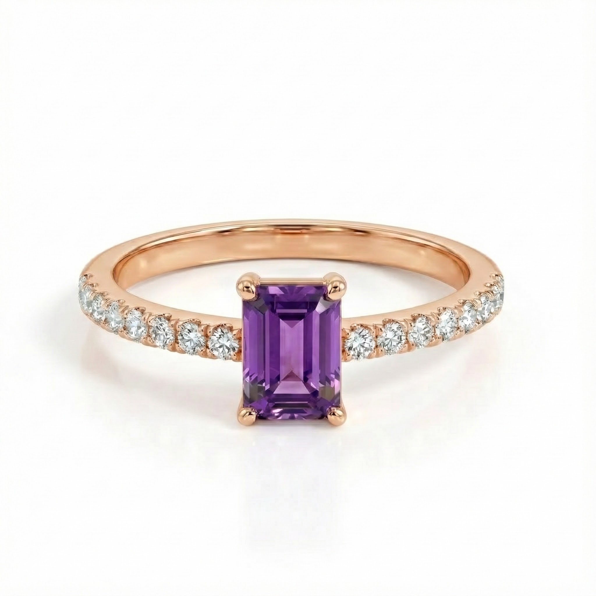 טבעת מושלמת בעיצוב עכשווי, עשויה זהב אדום מוקפד, אבן חן ספיר סגולה במרכז לאורך הטבעת וזרוע משובצת יהלומים קטנים עגולים ולבנים היוצרת קומפוזיציה של תנועה ואיזון. הזרוע משובצת בשיבוץ Pavé של יהלומים היוצרים ברק חי ועשיר בכל סיבוב של האצבע. טבעת בעלת מראה אוורירי וקליל.