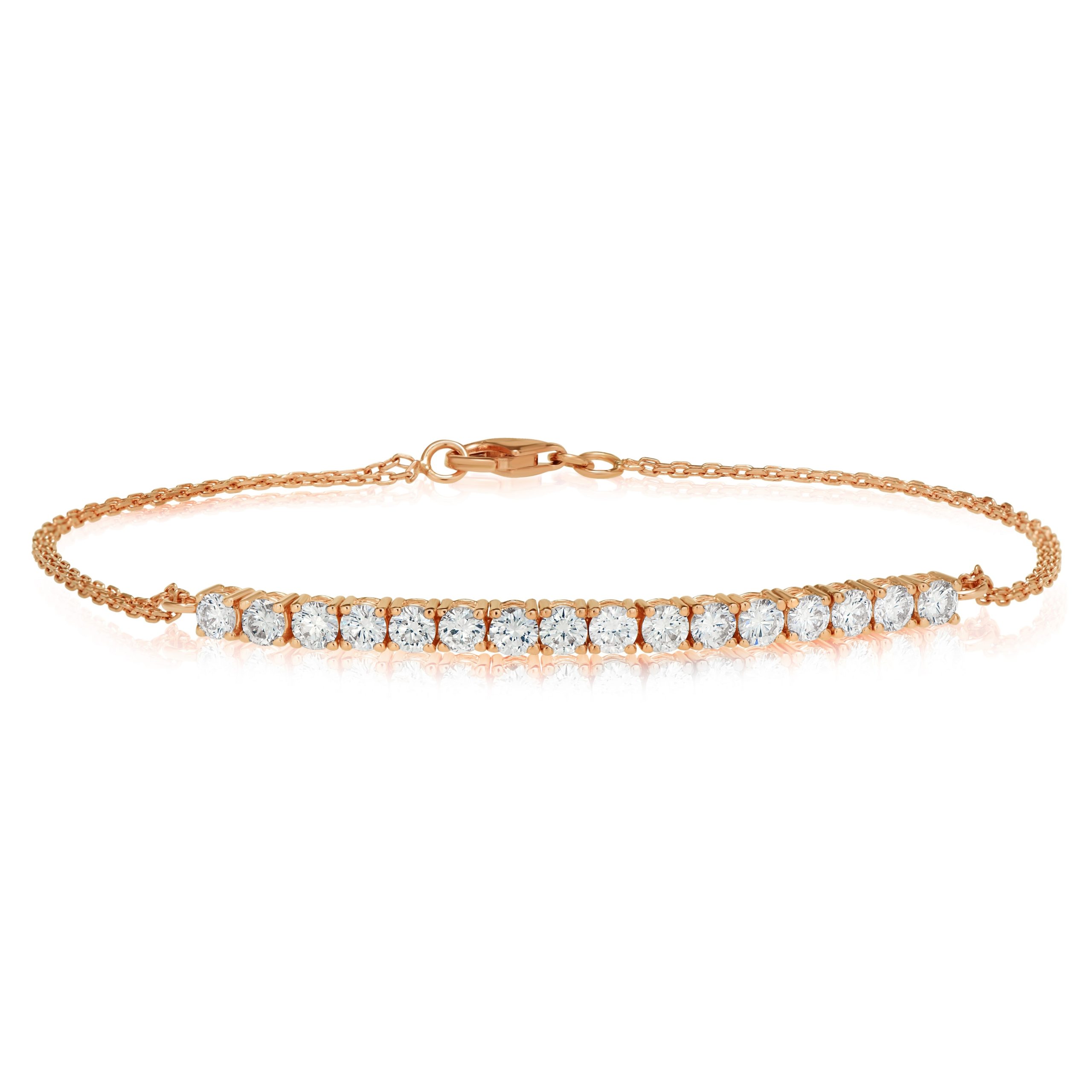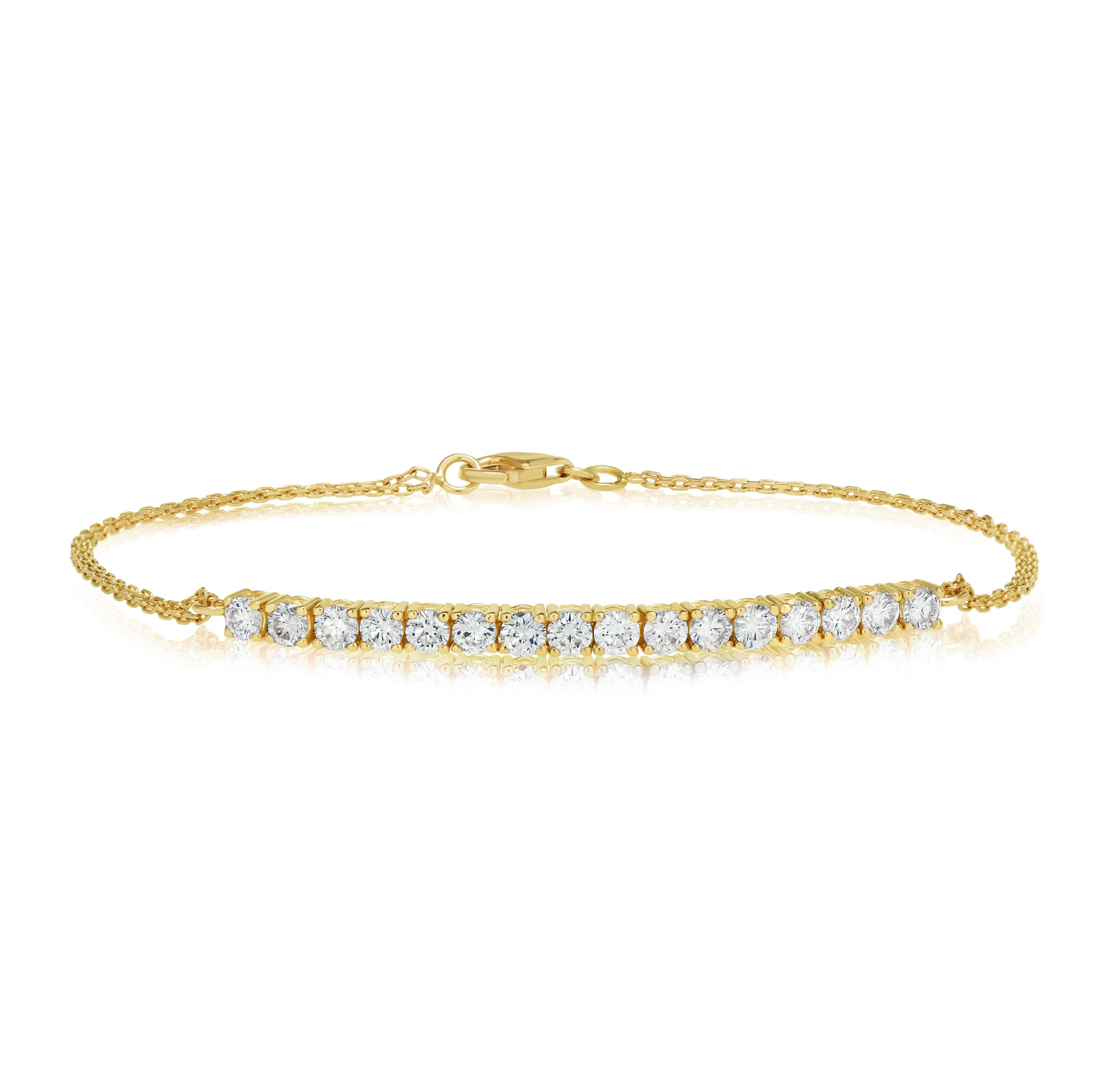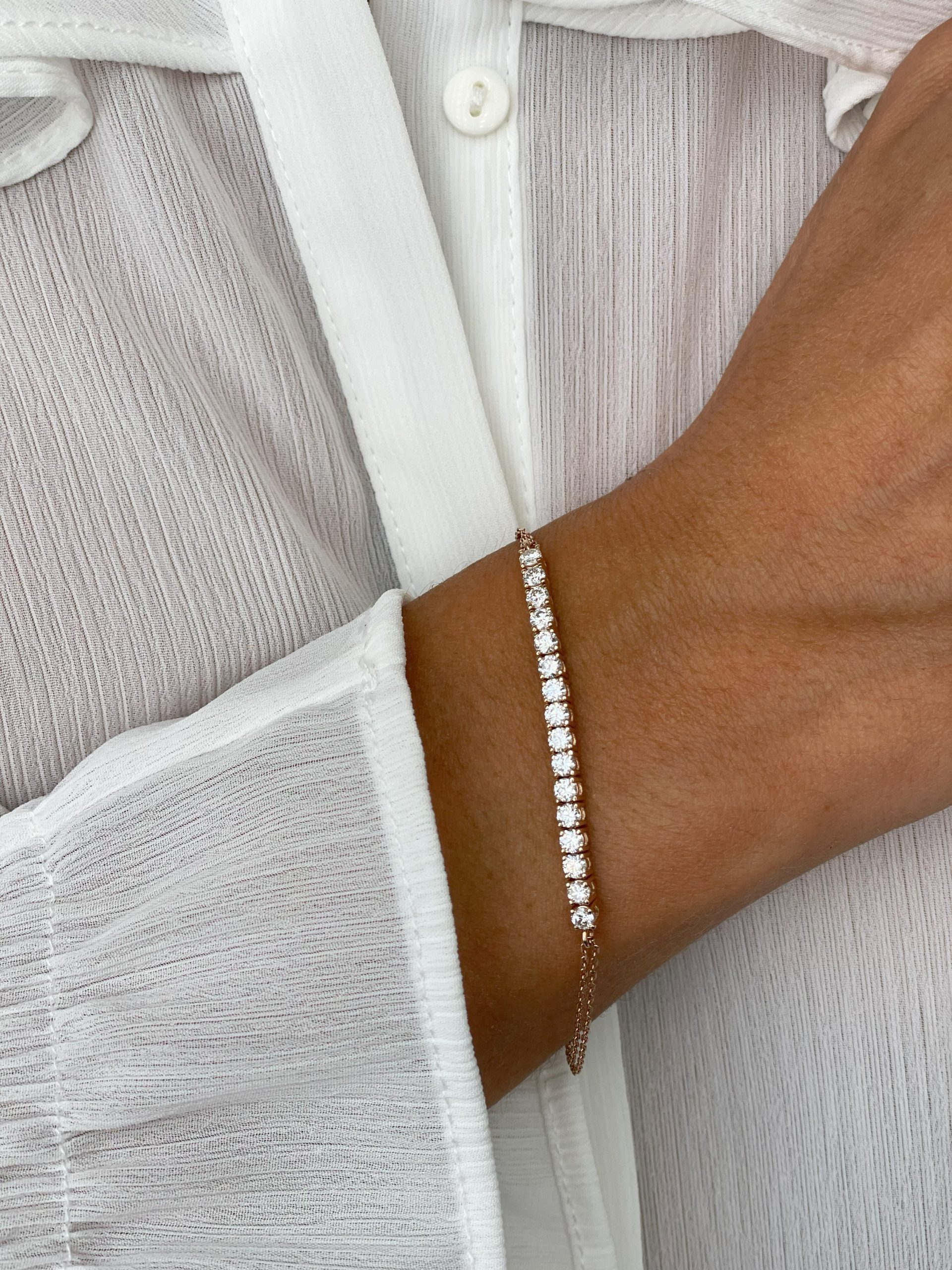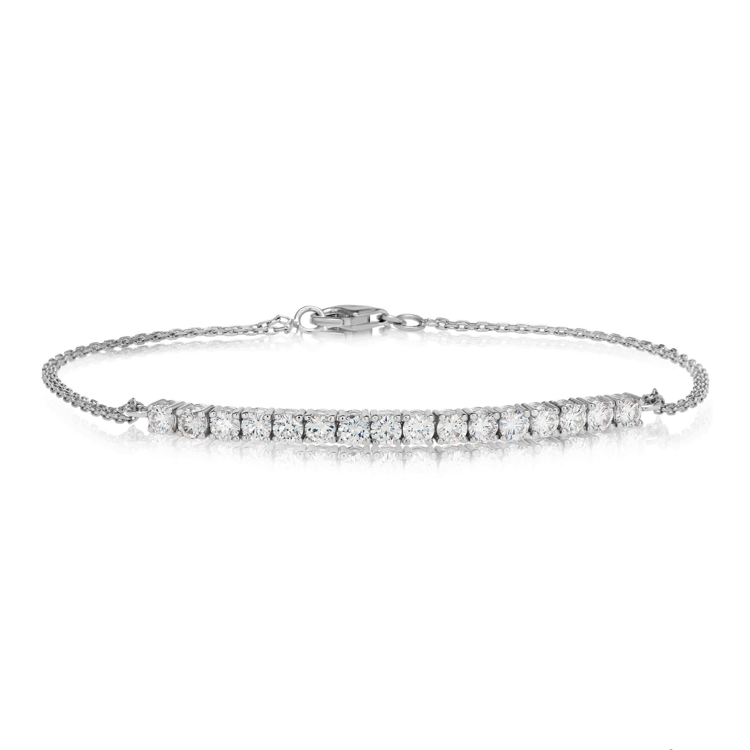 צמיד עשוי זהב לבן מוקפד, המשובץ בשורת יהלומים עגולים בוהקים לאורך קטע מרכזי דקיק, כאשר כל יהלום נתפס בארבע־שיניים (four‑prong) המדגישות את ניצוצו ומאפשרות חדירת אור מרבית. השרשרת הדקה היוצאת משני צידי השורה יוצרת מראה של צף עדין על פרק היד, והמחבר עם עמדות הגדלה מבטיח התאמה מדויקת ונוחה לאורך כל היום.