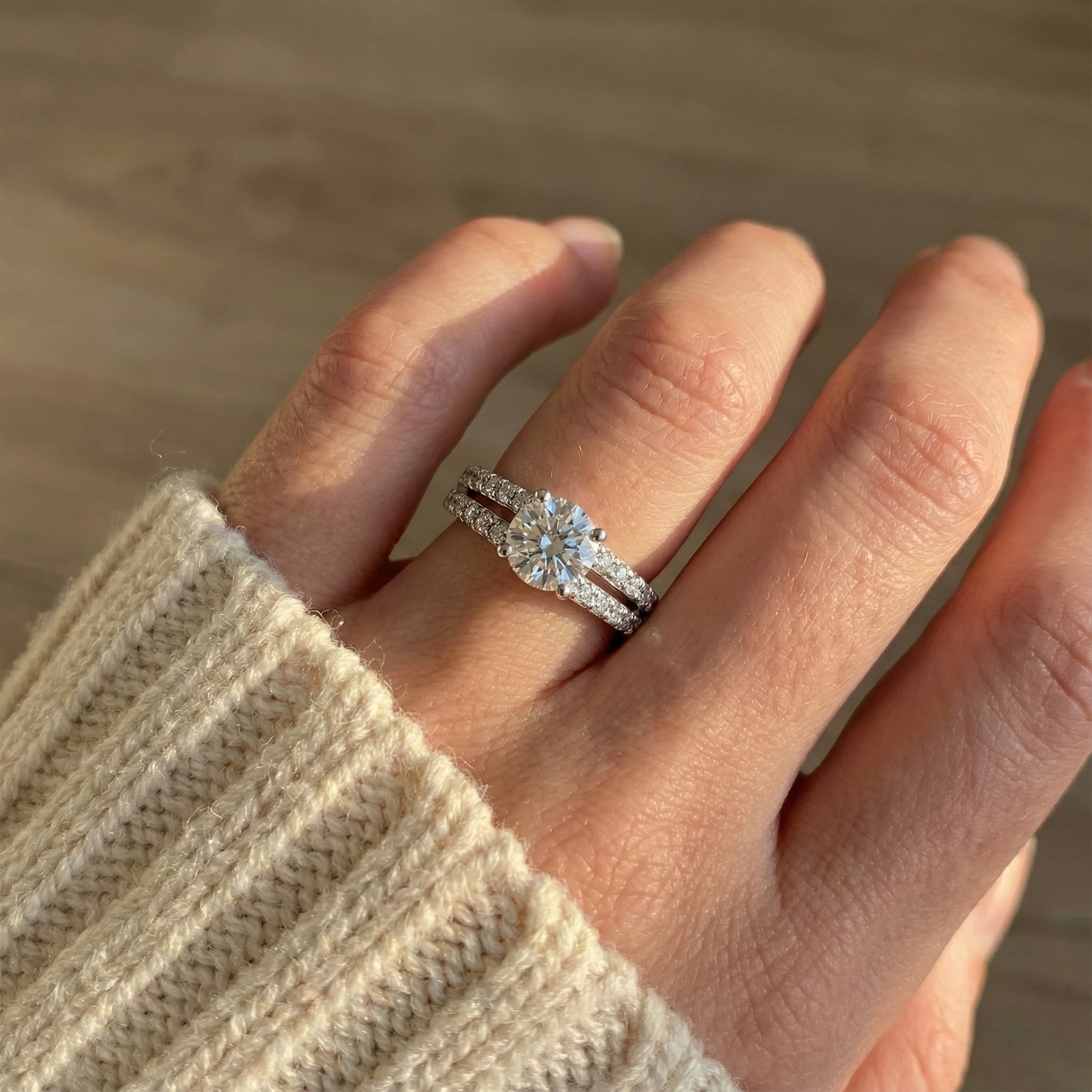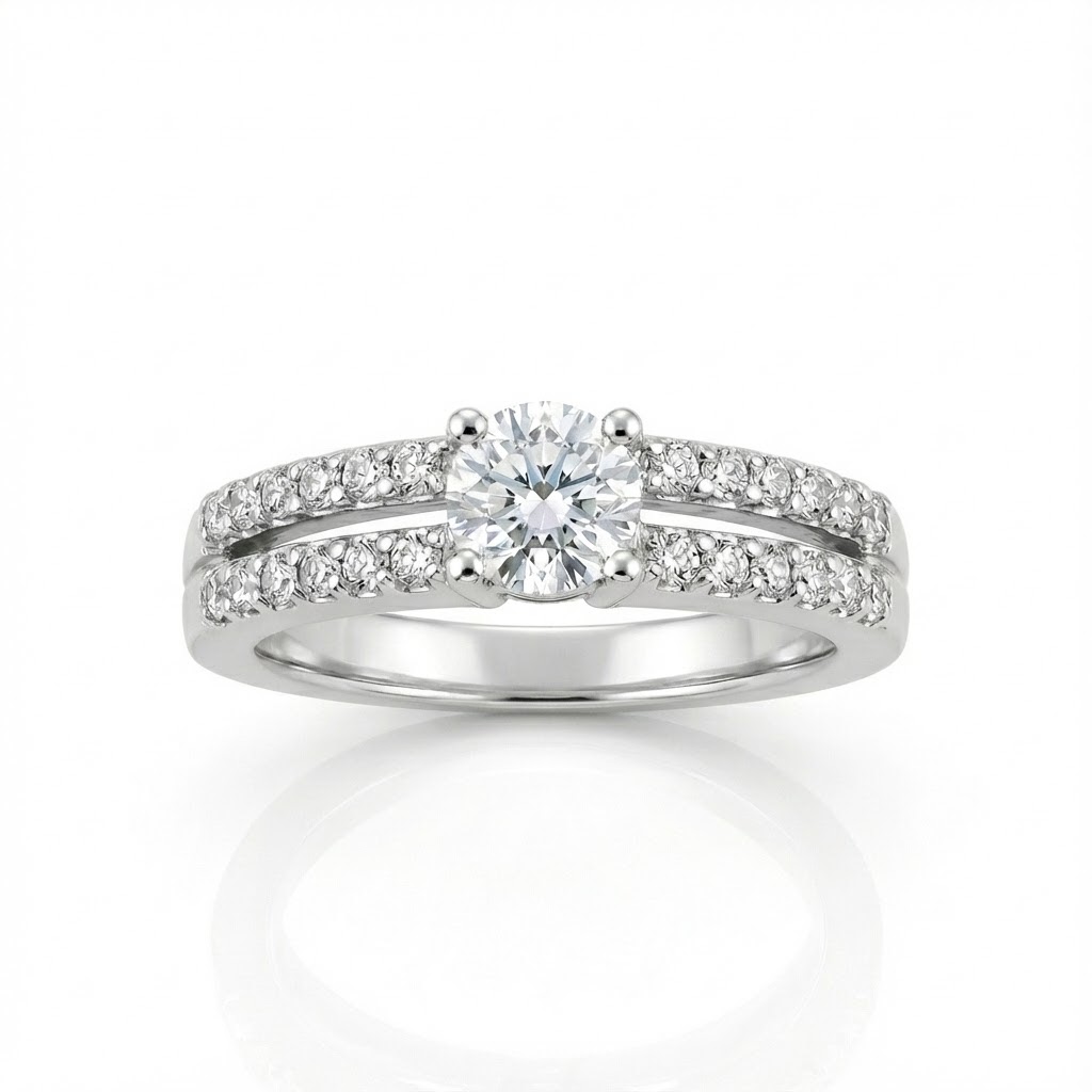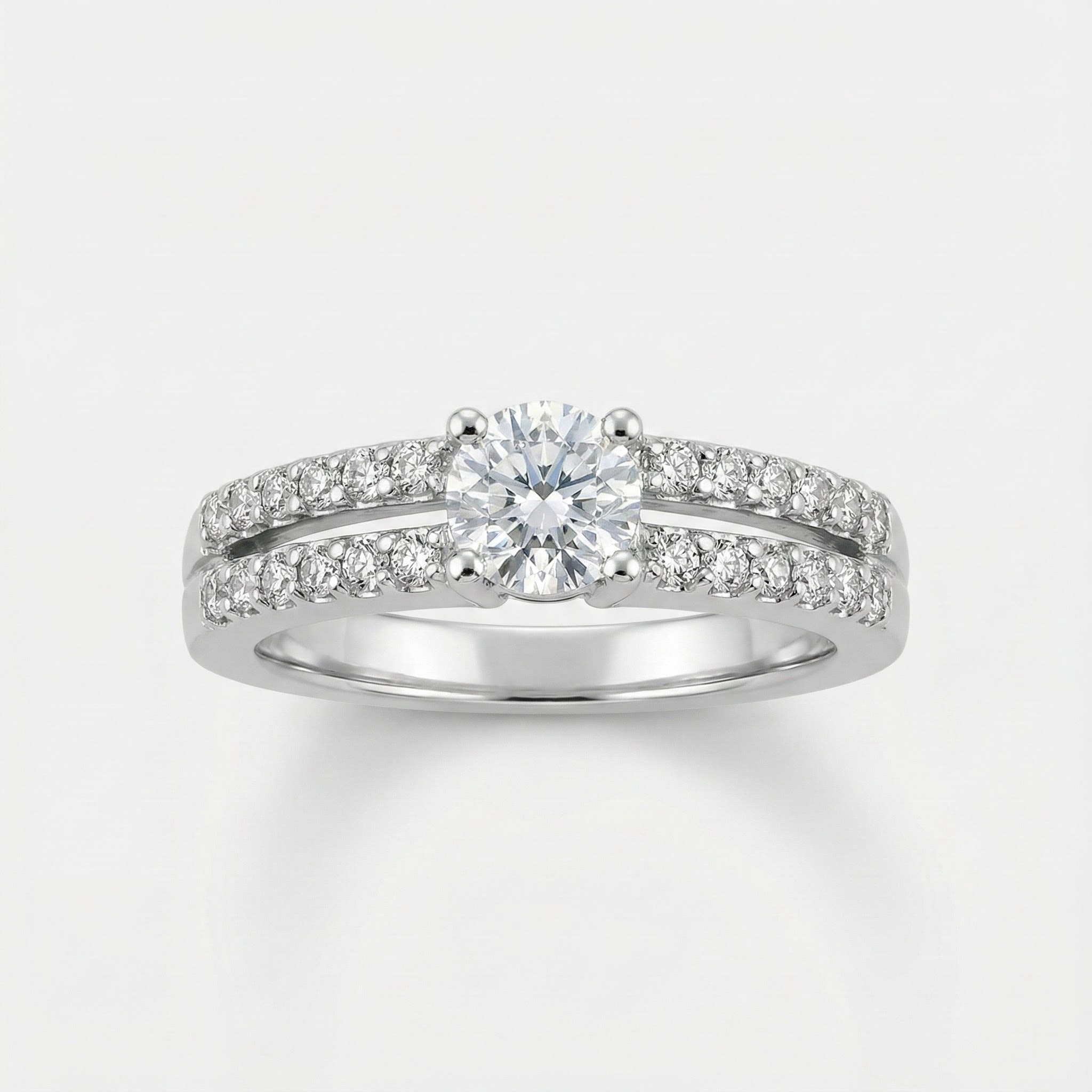 השיבוץ הכפול יוצר מראה מלא ועשיר שמעצים את נוכחות היהלום המרכזי ומוסיף ברק מכל זווית. הבחירה בעיצוב סימטרי וקווי מתאר נקיים יוצרת טבעת על-זמנית שמתאימה גם להצעת נישואין וגם כמתנה רומנטית.