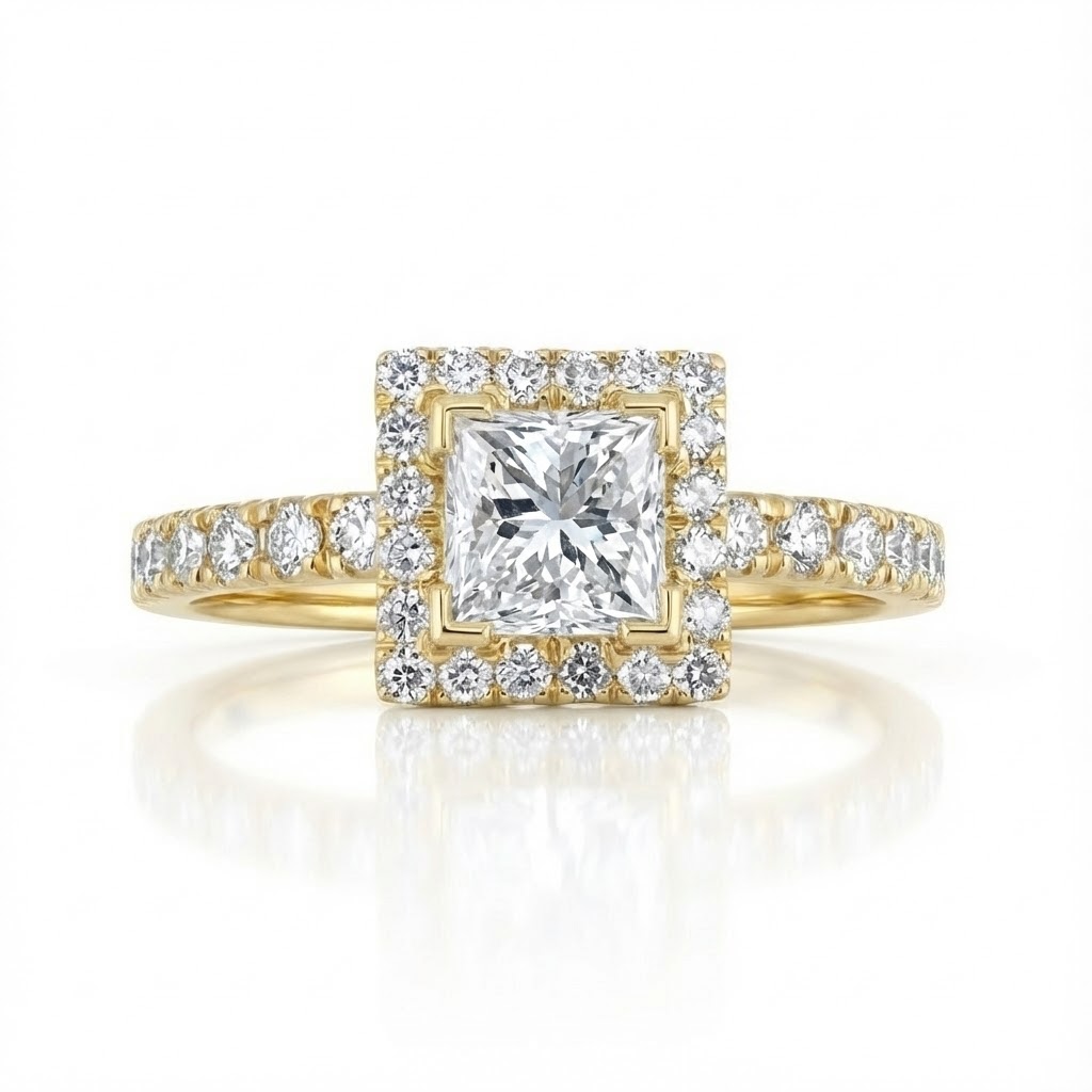 לוצ'יאנה היא טבעת זהב צהוב אלגנטית עם ניחוח יוקרתי שמרגישים כבר במבט ראשון. במרכזה משובץ יהלום פרינסס מרובע בעל נוכחות מרשימה, מוקף במסגרת היילו צפופה של יהלומים מנצנצים, הממשיכה אל תוך חישוק הטבעת כולו.