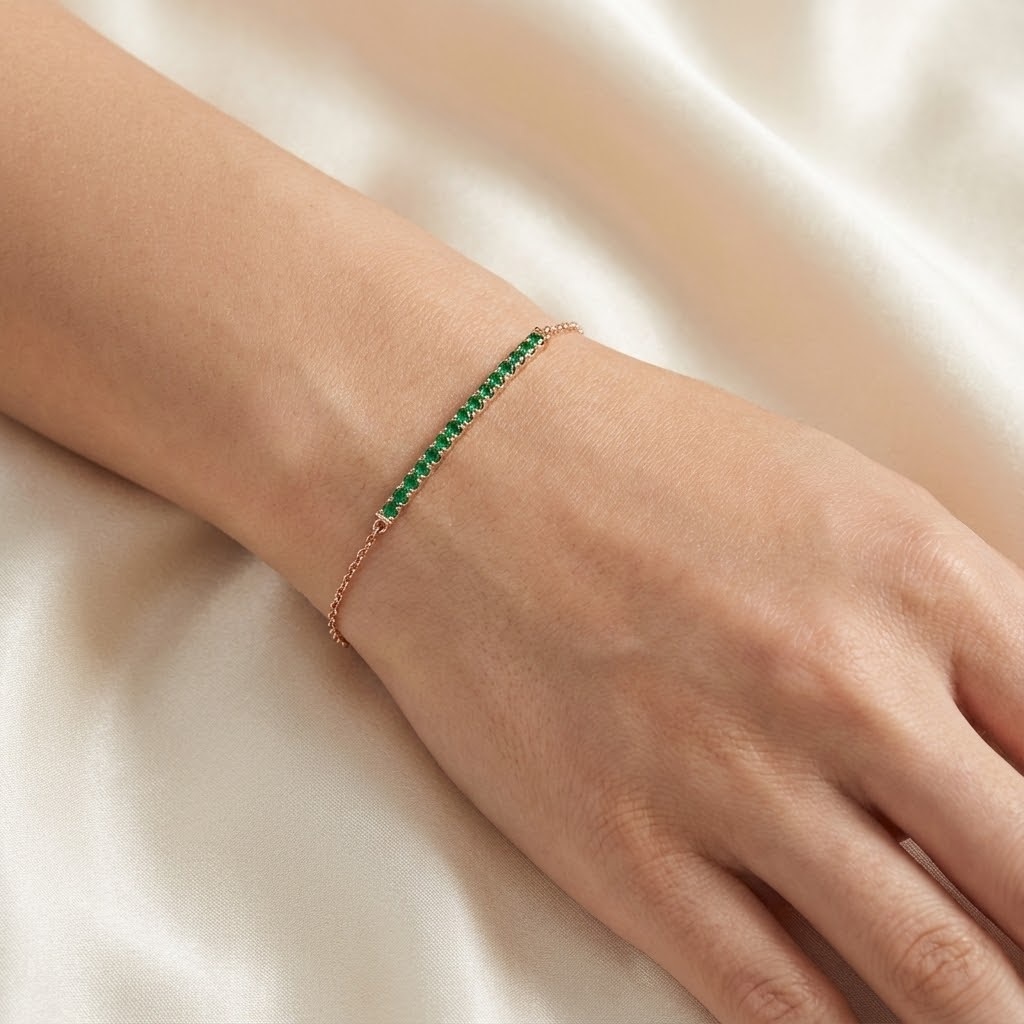 לינט,צמיד זהב אדום עם שורת אבני טורמלין ירוקות זוהרות – שילוב הרמוני של צבע וטבע. הצמיד מקנה מראה ייחודי, נעים לעין אך מרשים, ומתאים הן לשגרה היומיומית והן לערב חגיגי. הבחירה המושלמת למי שמחפשת תכשיט עם נוכחות טבעית וייחודית.