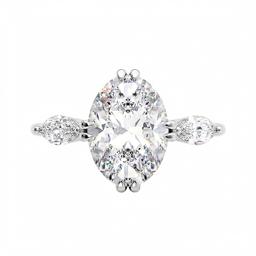 טבעת קלאסית עם טוויסט אלגנטי – יהלום אובלי בשילוב יהלומי מרקיזה צדדיים