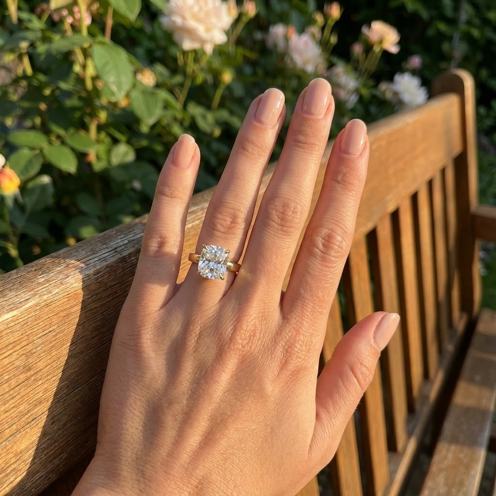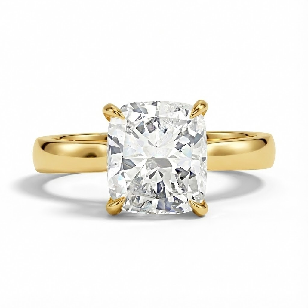 טבעת סוליטר עדינה ועוצמתית יחדיו,עשויה זהב צהוב מוקפד, המשובצת יהלום מרכז חיתוך קושן במשקל מרשים. היהלום נתפס בארבע־שיניים דקות שמעצימות את הברק ומאפשרות חדירת אור מרבית מכל זווית. זרוע הטבעת הדקה מתעבה בעדינות מתחת לאבן כדי לתמוך במשקל ולהבטיח פרופורציה מאוזנת, ומקבלת צורה חלקה ונקייה המשלבת תחכום ונוחות לבישה יומיומית.