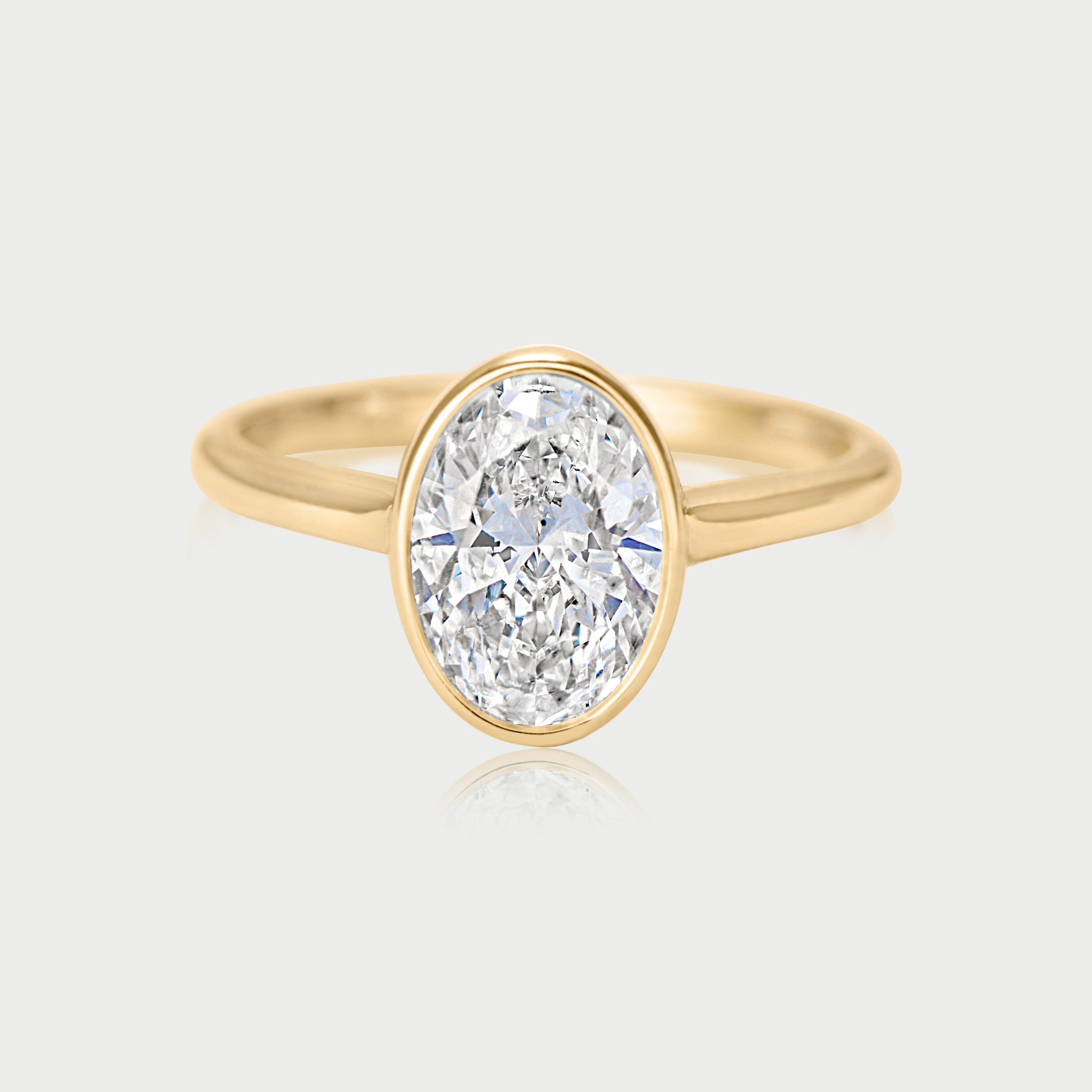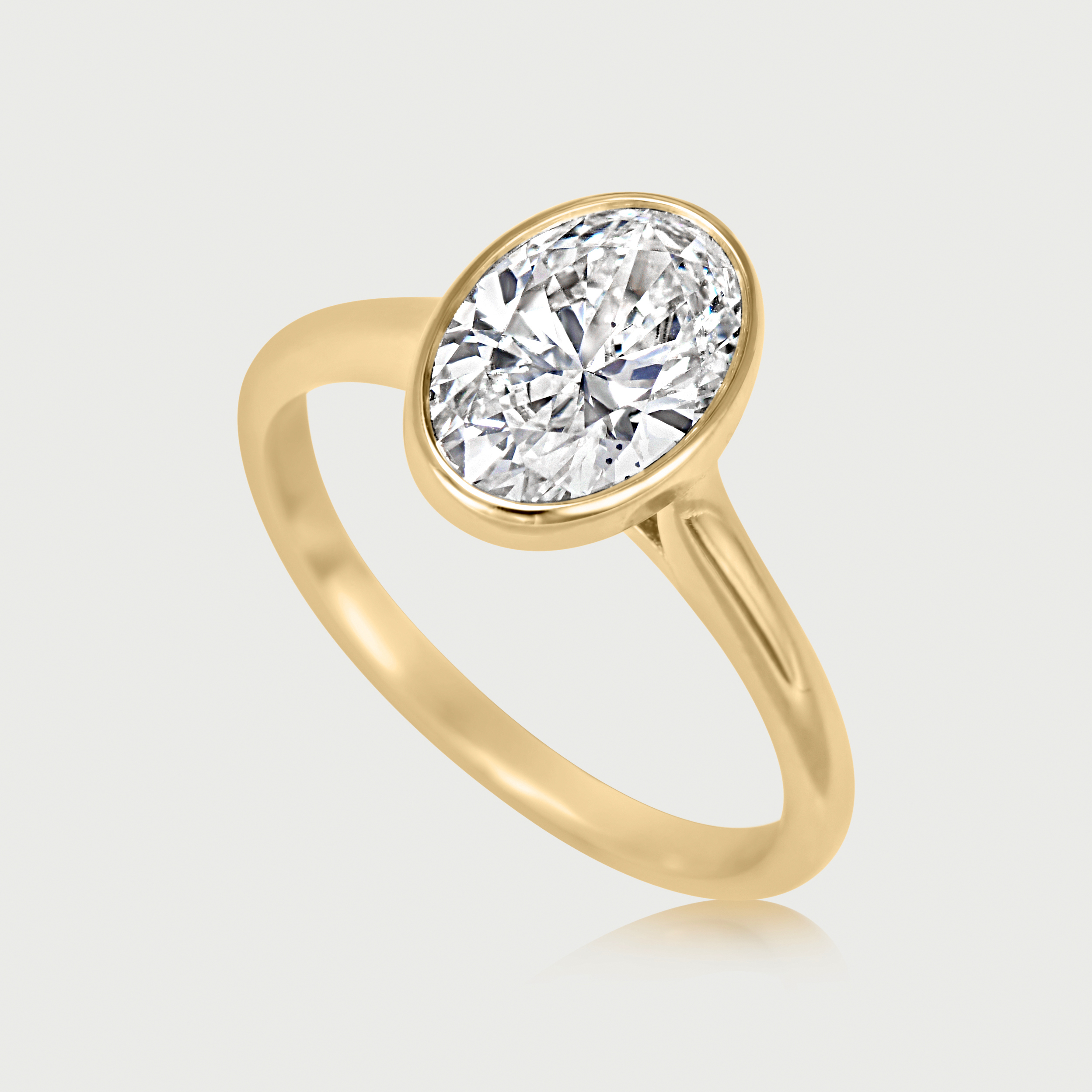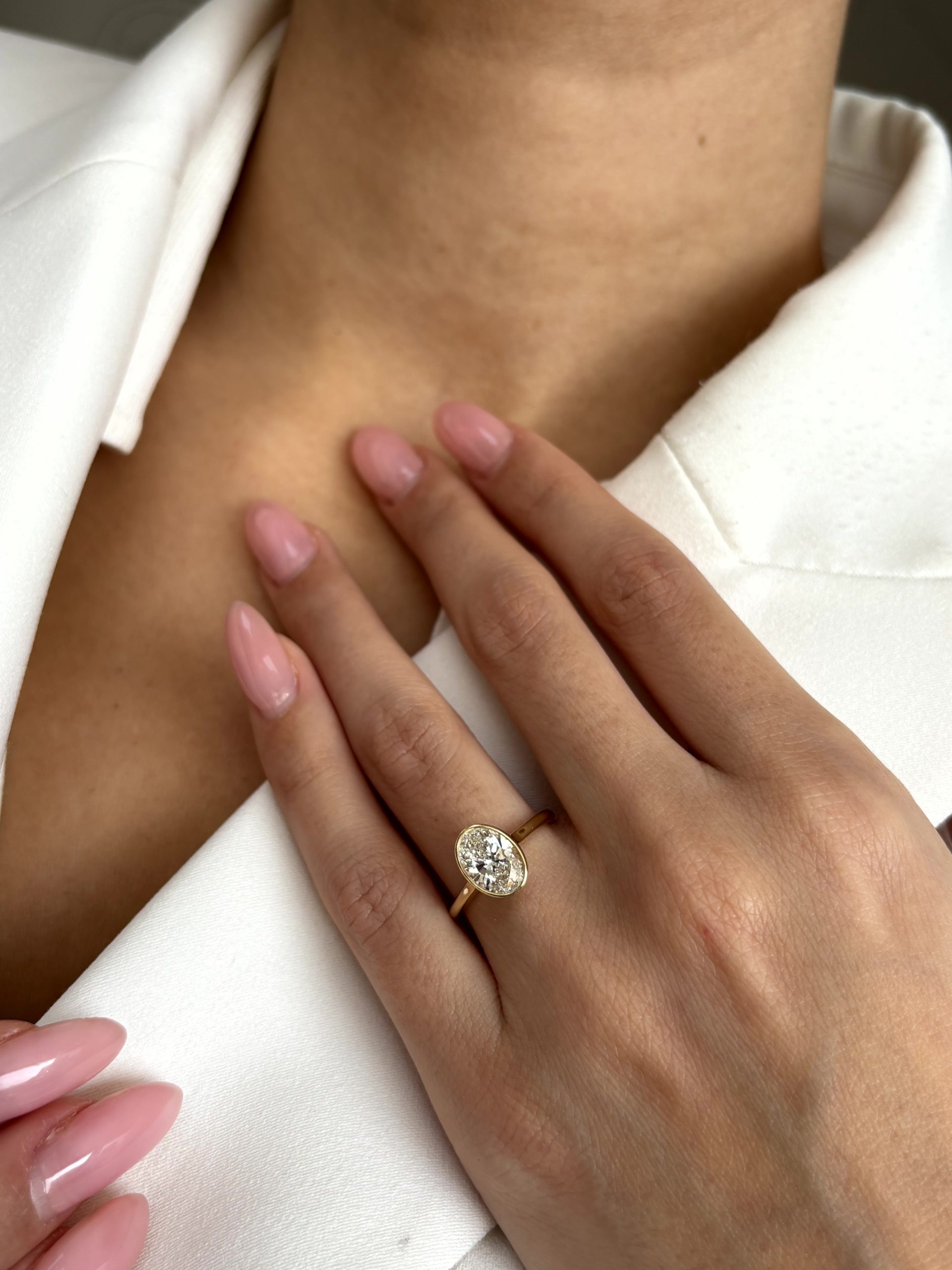 סרנטינה,טבעת עדינה ויוקרתית עשויה זהב צהוב משובח, המשובצת יהלום מרכז חיתוך אובל בשיבוץ בזל מלא המדגיש את קווי המתאר האלגנטיים של האבן ומגן עליה מכל צד. זרוע הטבעת הדקה מתרחבת בעדינות מתחת לאבן ליצירת פרופורציות מאוזנות, ומעניקה מראה אווירי וקל במיוחד. השיבוץ בסגנון בזל אחיד מבליט את הברק הטבעי של היהלום ומבטיח אחיזה מוחלטת בכל מבט.