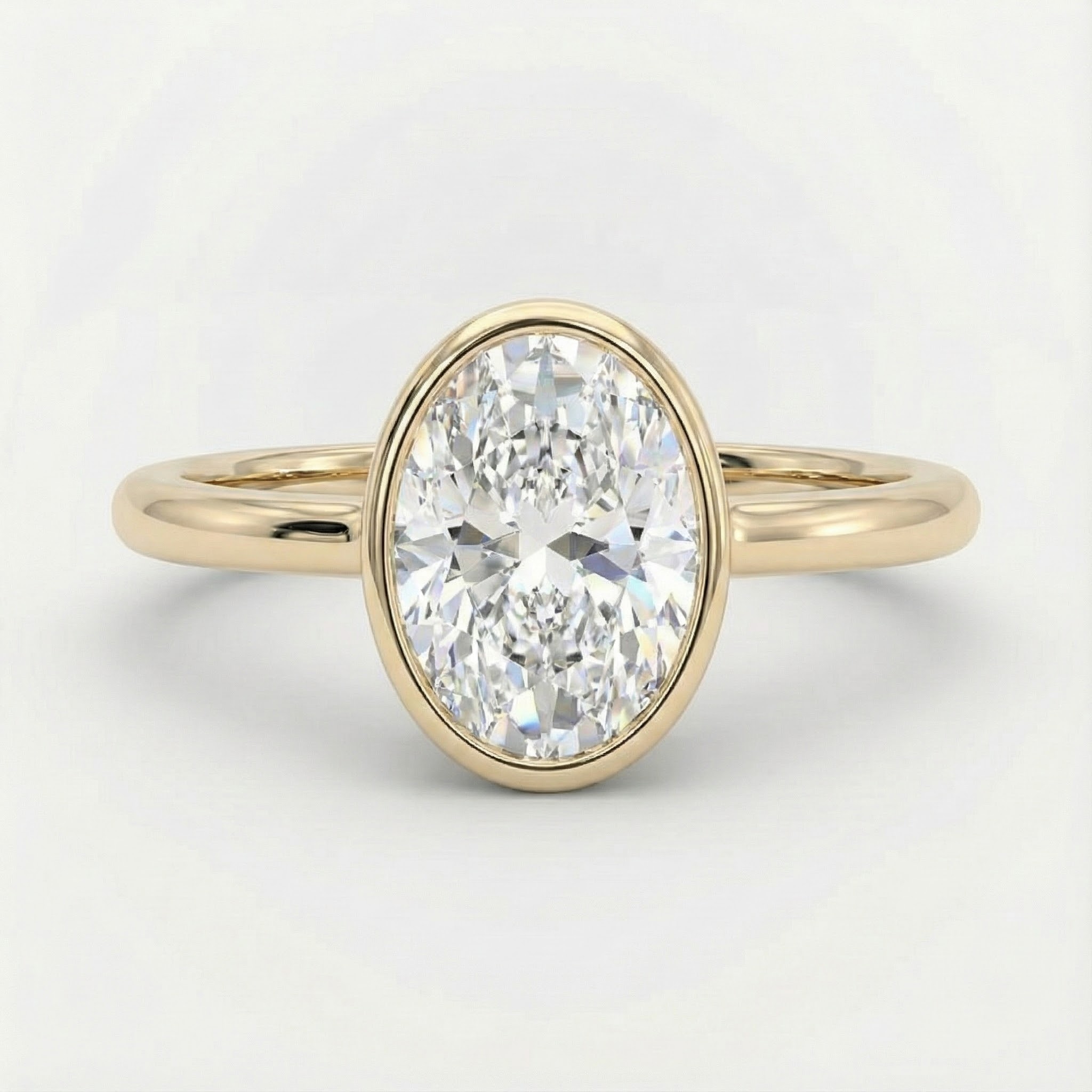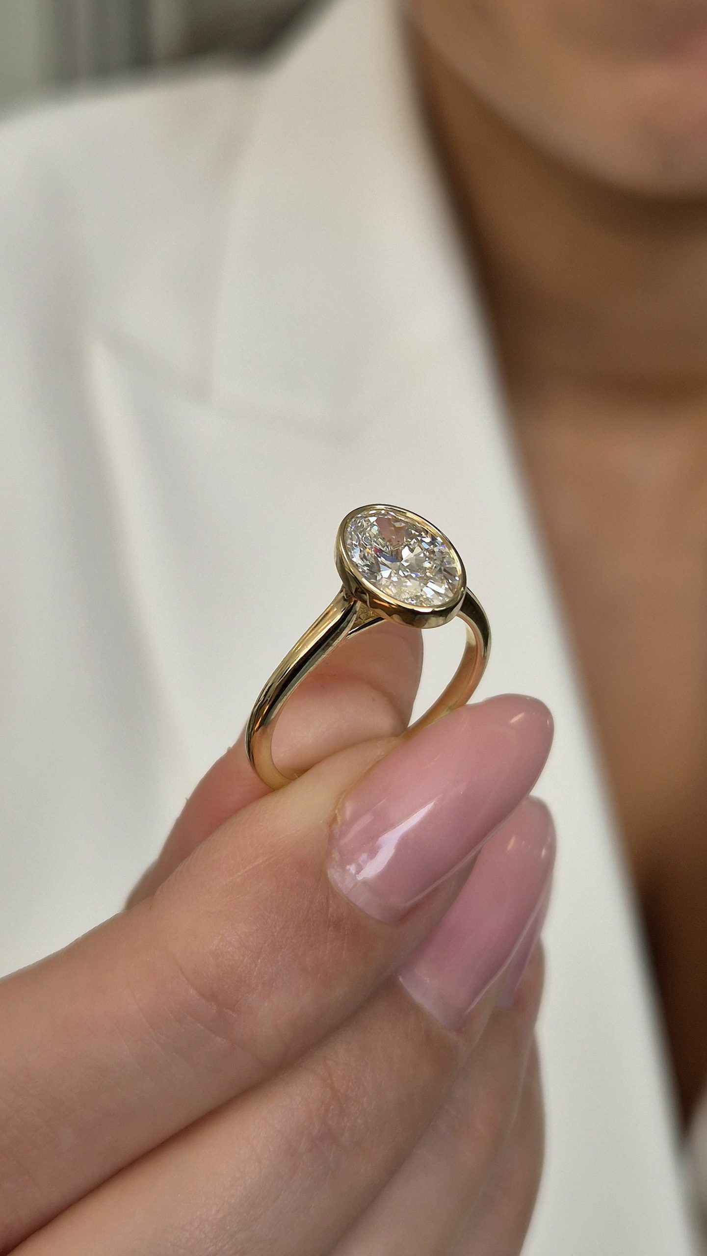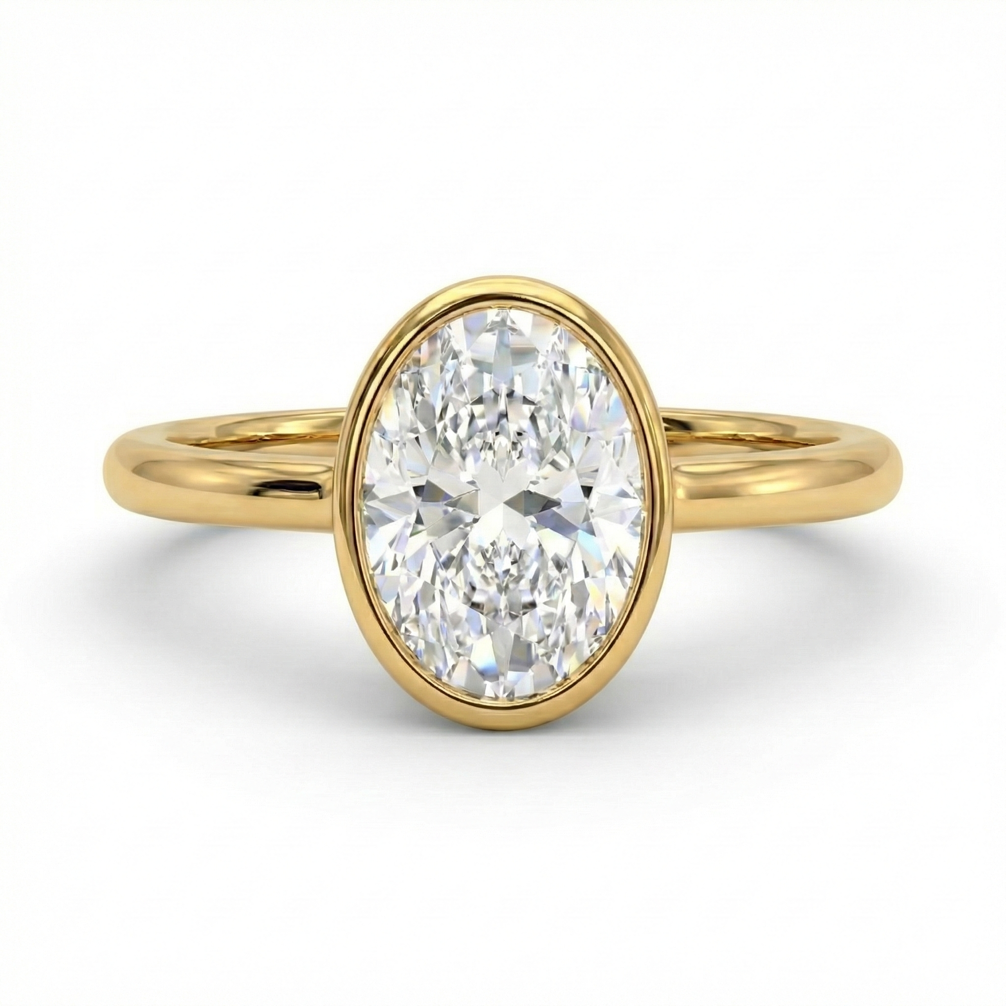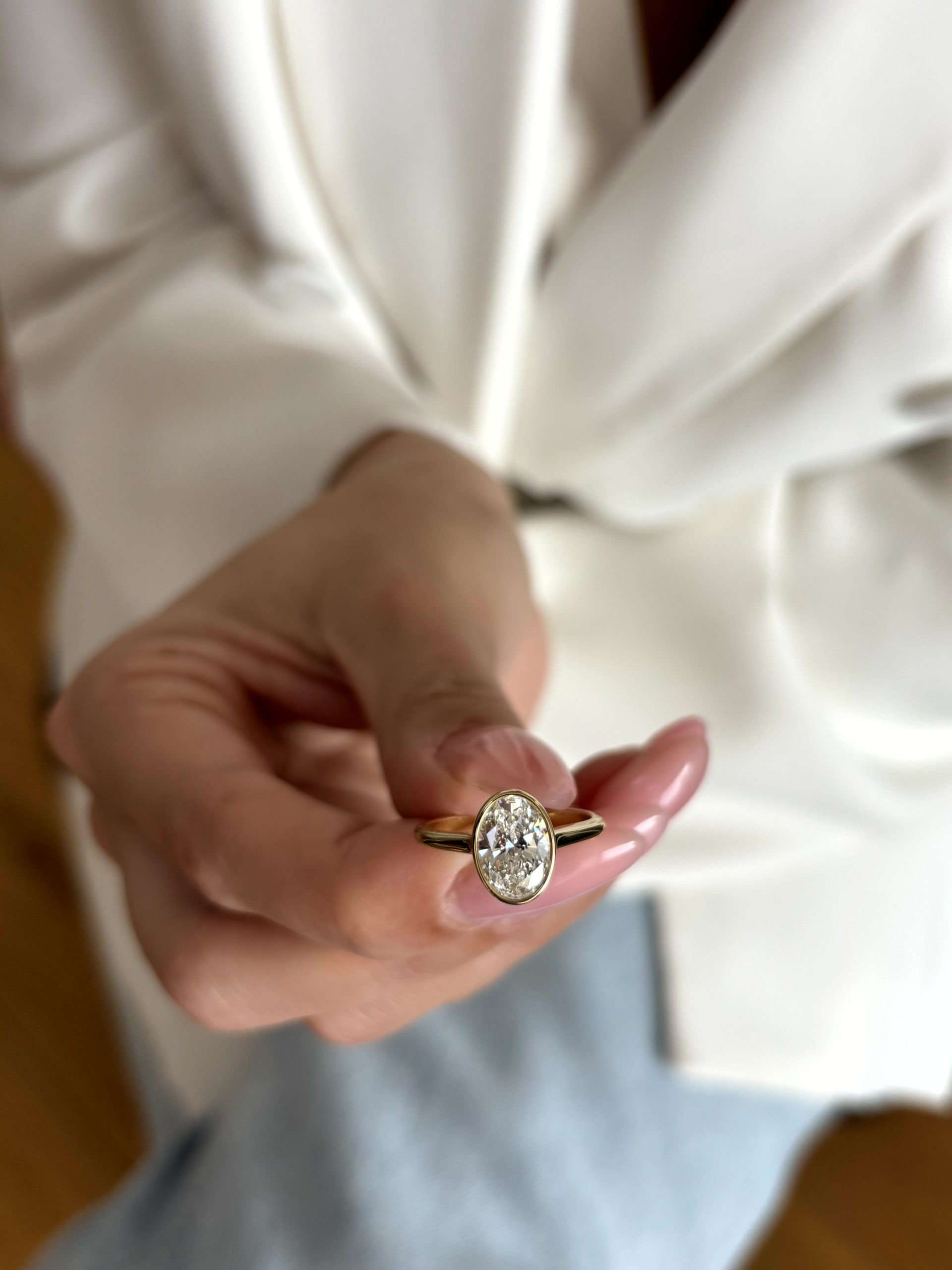 סרנטינה,טבעת עדינה ויוקרתית עשויה זהב צהוב משובח, המשובצת יהלום מרכז חיתוך אובל בשיבוץ בזל מלא המדגיש את קווי המתאר האלגנטיים של האבן ומגן עליה מכל צד. זרוע הטבעת הדקה מתרחבת בעדינות מתחת לאבן ליצירת פרופורציות מאוזנות, ומעניקה מראה אווירי וקל במיוחד. השיבוץ בסגנון בזל אחיד מבליט את הברק הטבעי של היהלום ומבטיח אחיזה מוחלטת בכל מבט.