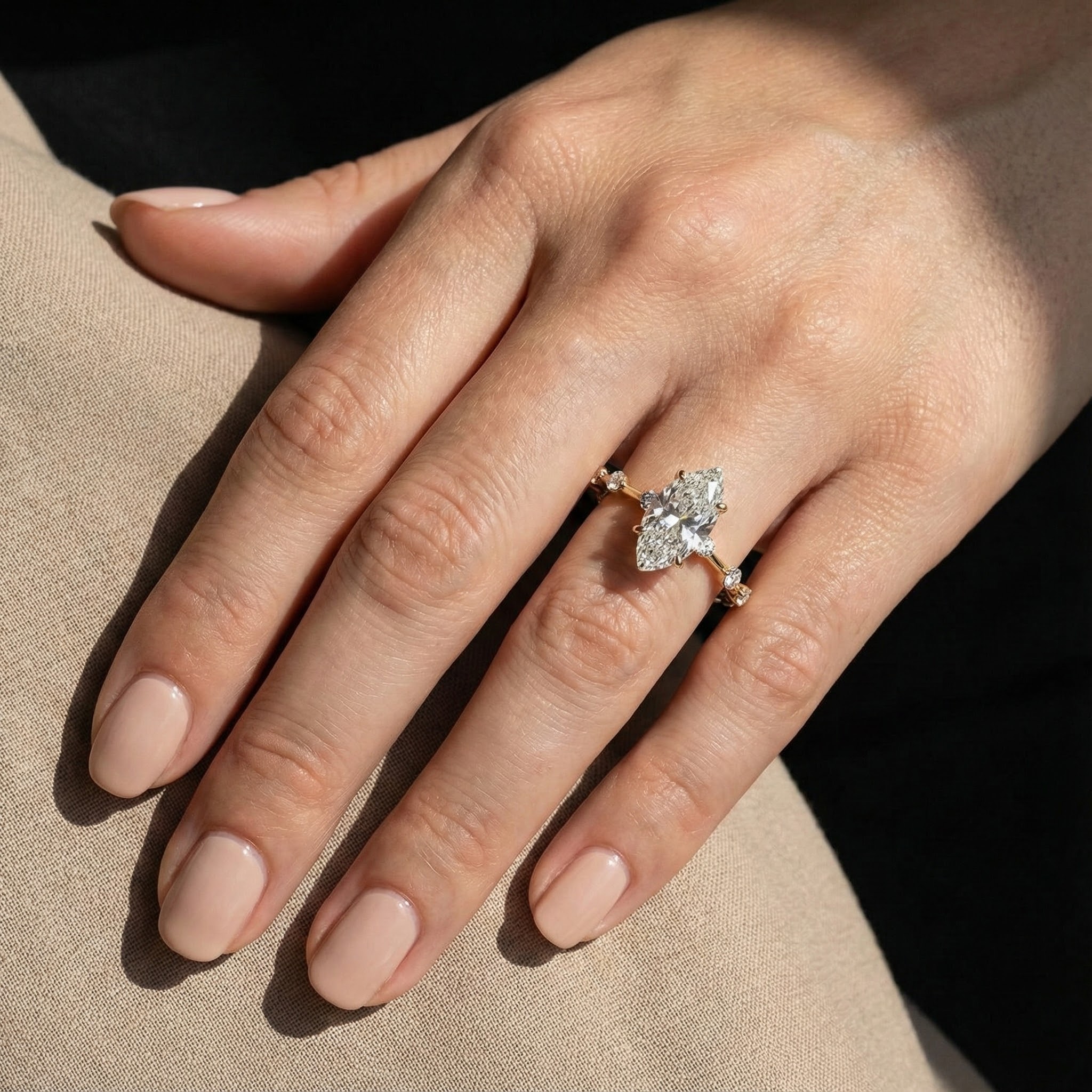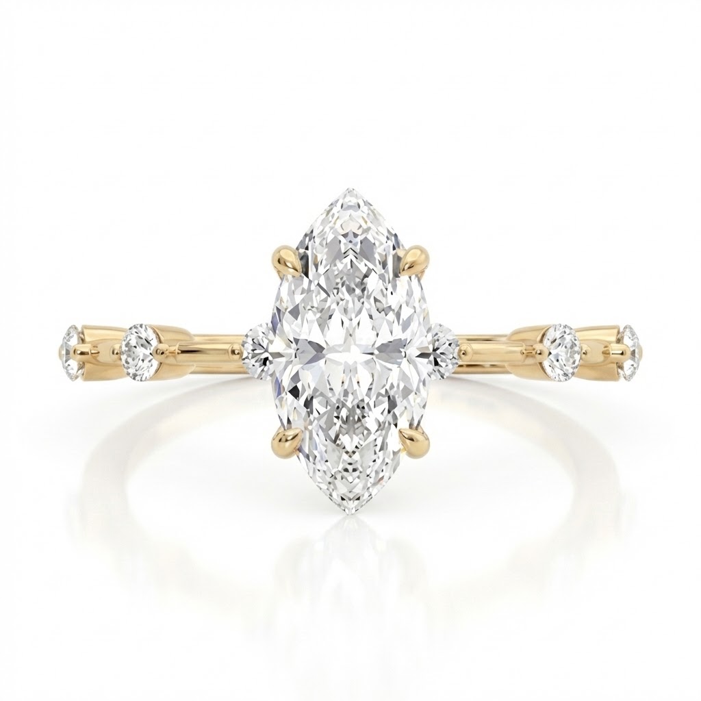 עדינה,היא טבעת בעיצוב ייחודי, שמשלבת קו מינימליסטי עם יהלום מרכזי מרהיב בחיתוך מרקיזה – בחירה לא שגרתית שמבליטה את האצבע ומעניקה תחושת אורך ואלגנטיות.