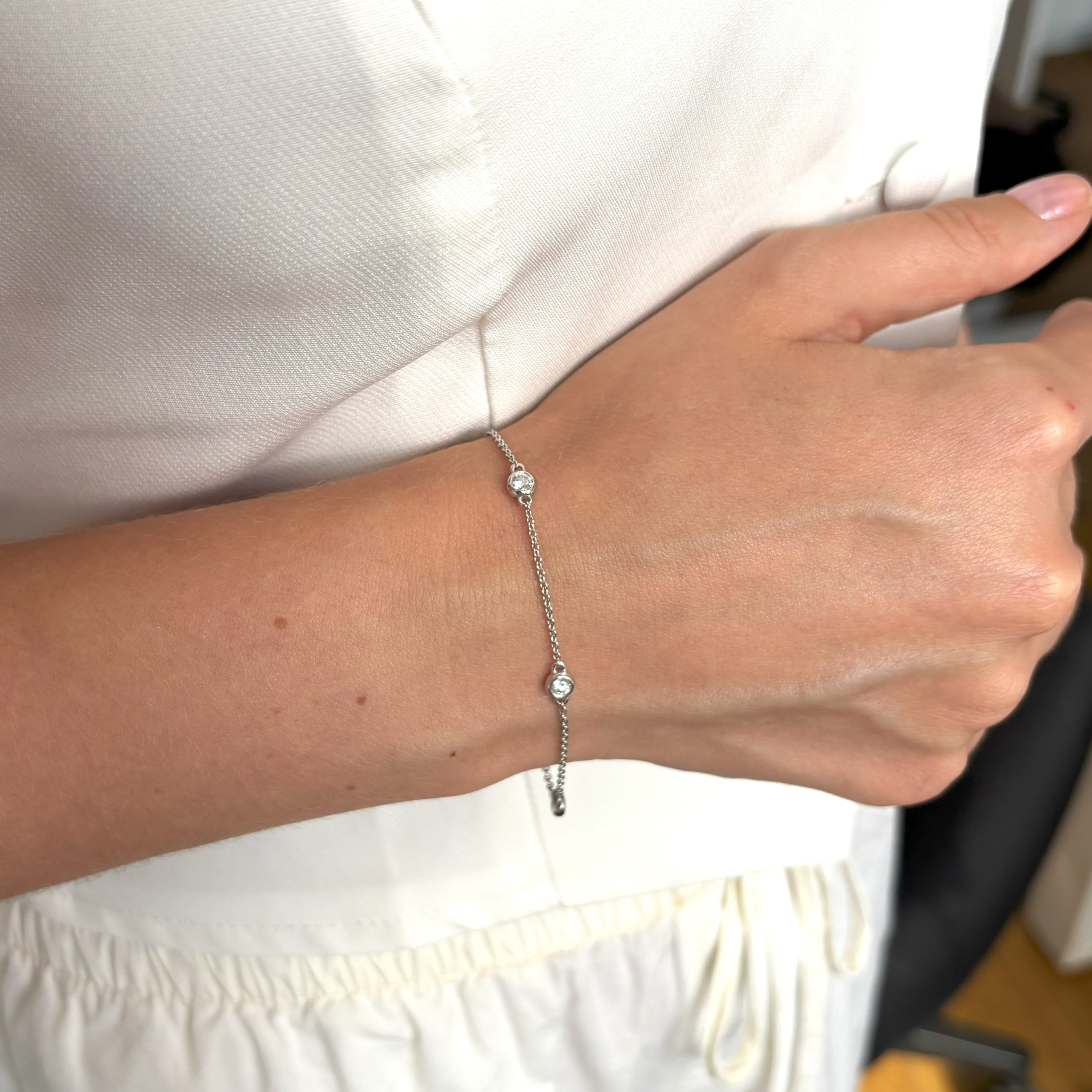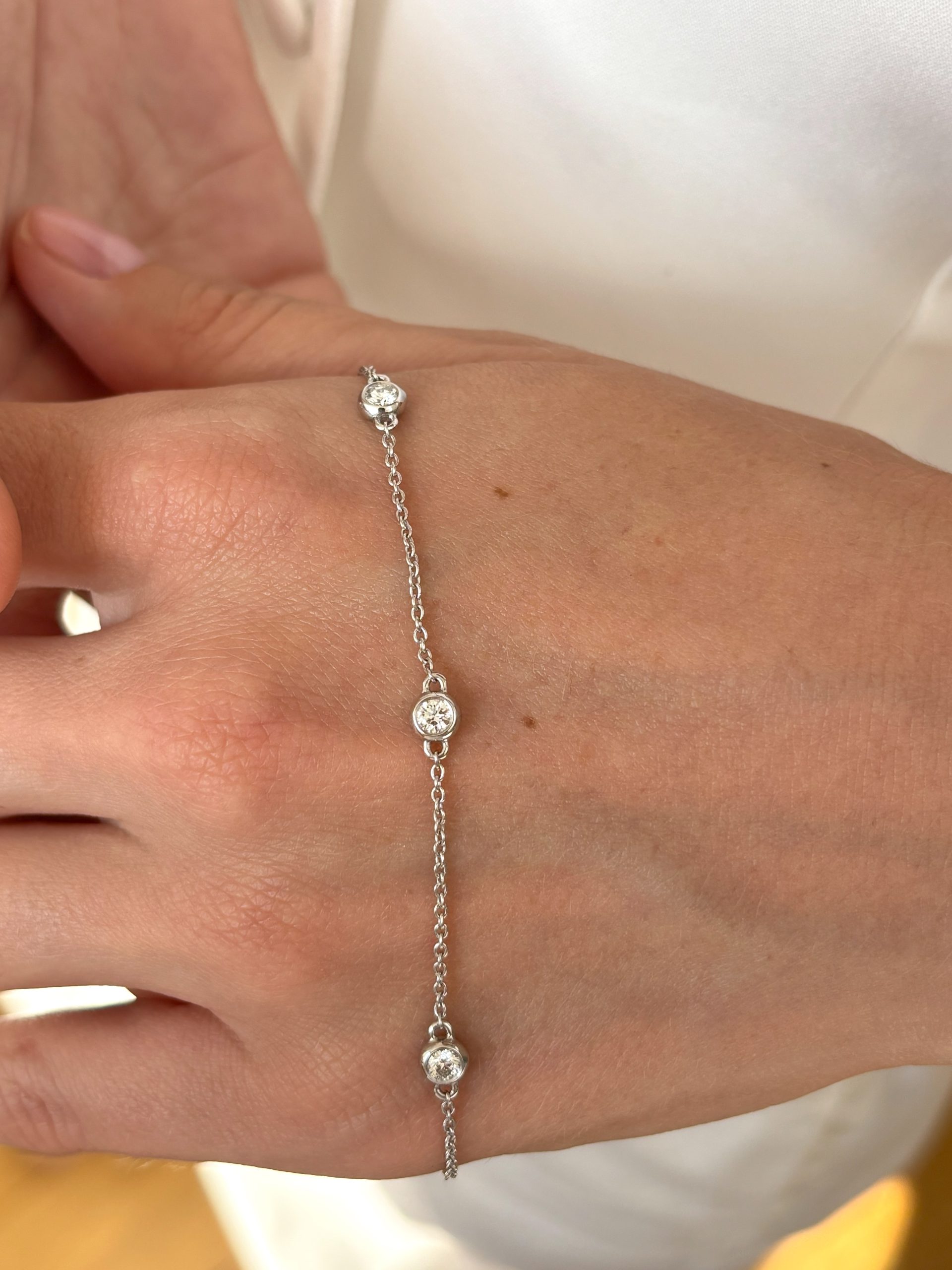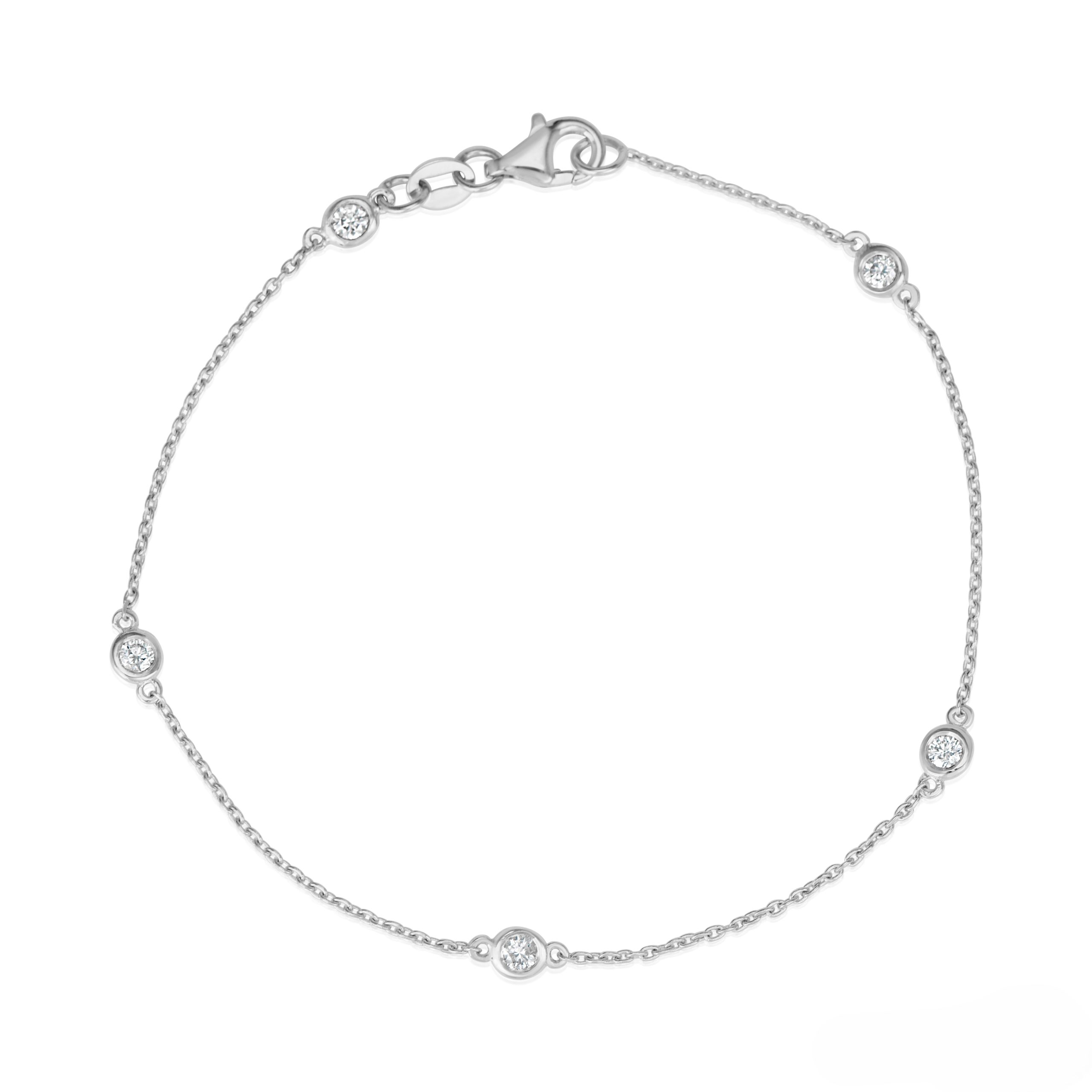 צמיד עדין עשוי זהב לבן משובח, שעל שרשרתו הדקה פזורים חמישה יהלומים עגולים קטנים בכלי בזל מלוטש. שיבוץ הבזל מעניק לכל יהלום מסגרת נקייה שמדגישה את זוהרו, והפריסה הסימטרית לאורך השרשרת יוצרת תחושה של הרמוניה ועדינות על פרק כף היד. הצמיד מסתיים במחבר לובסטר ועמודי הגדלה, כדי להתאים לכל היקף ולענוד בנוחות לאורך כל היום.