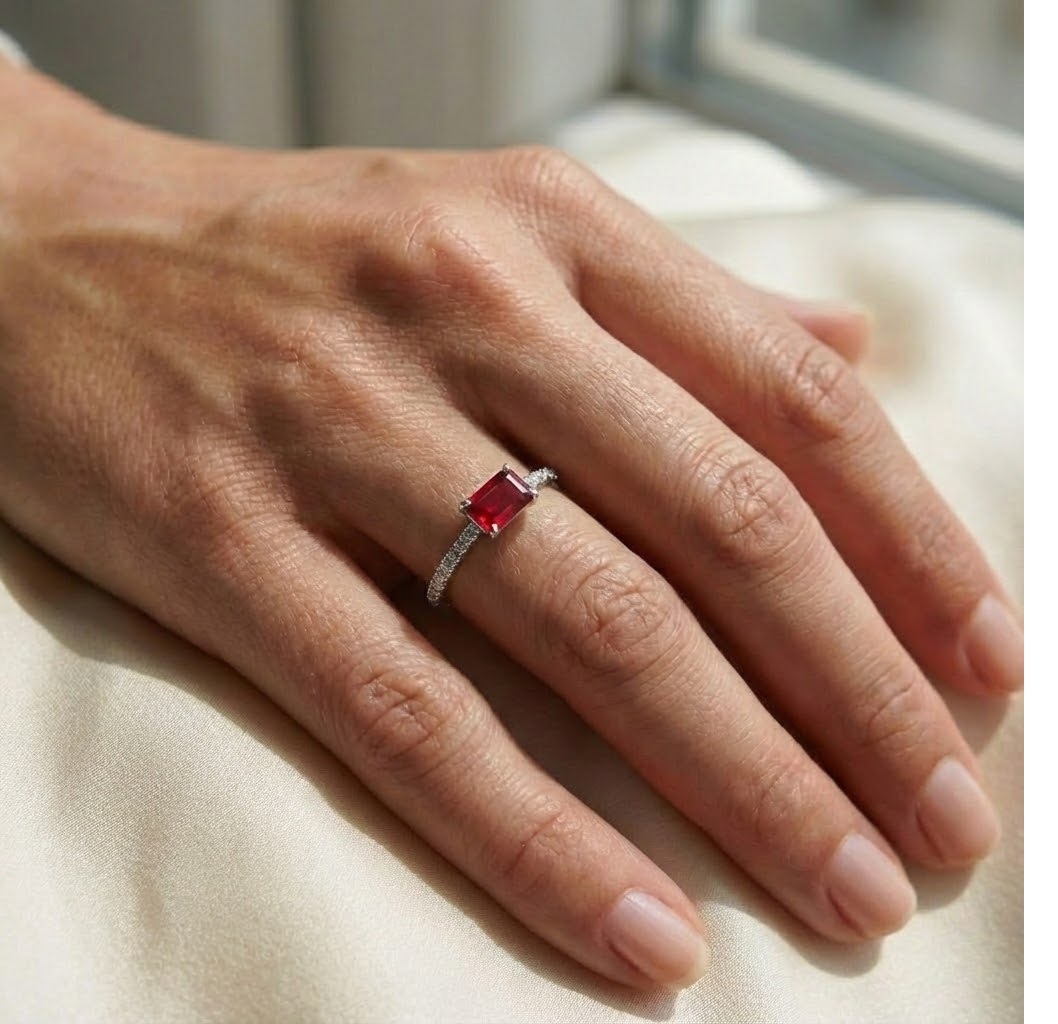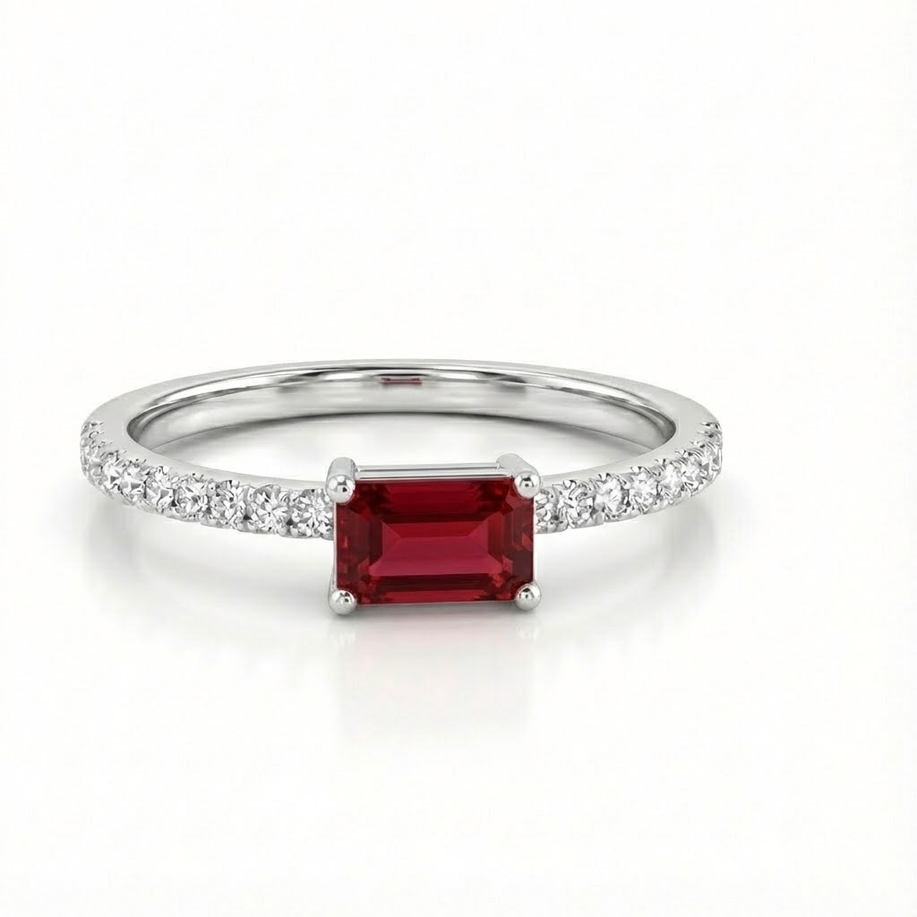טבעת מושלמת בעיצוב עכשווי, עשויה זהב לבן מוקפד, אבן חן רודולייט אדמדמה במרכז לרוחב הטבעת וזרוע משובצת יהלומים קטנים עגולים ולבנים היוצרת קומפוזיציה של תנועה ואיזון. הזרוע משובצת בשיבוץ Pavé של יהלומים היוצרים ברק חי ועשיר בכל סיבוב של האצבע. טבעת בעלת מראה אוורירי וקליל.