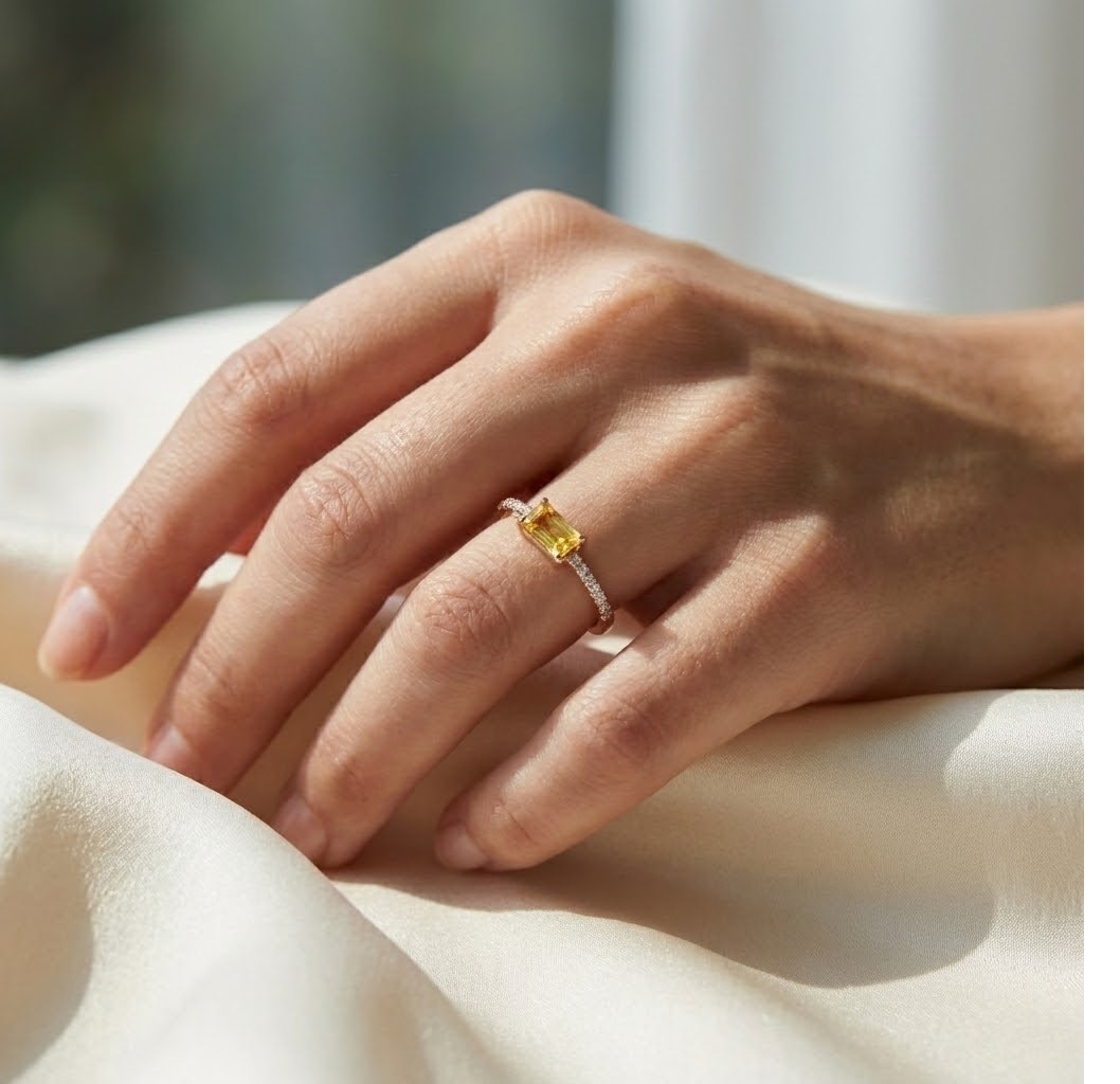 טבעת מושלמת בעיצוב עכשווי, עשויה זהב אדום מוקפד, אבן חן טורמלין צהובה במרכז לרוחב הטבעת וזרוע משובצת יהלומים קטנים עגולים ולבנים היוצרת קומפוזיציה של תנועה ואיזון. הזרוע משובצת בשיבוץ Pavé של יהלומים היוצרים ברק חי ועשיר בכל סיבוב של האצבע. טבעת בעלת מראה אוורירי וקליל.