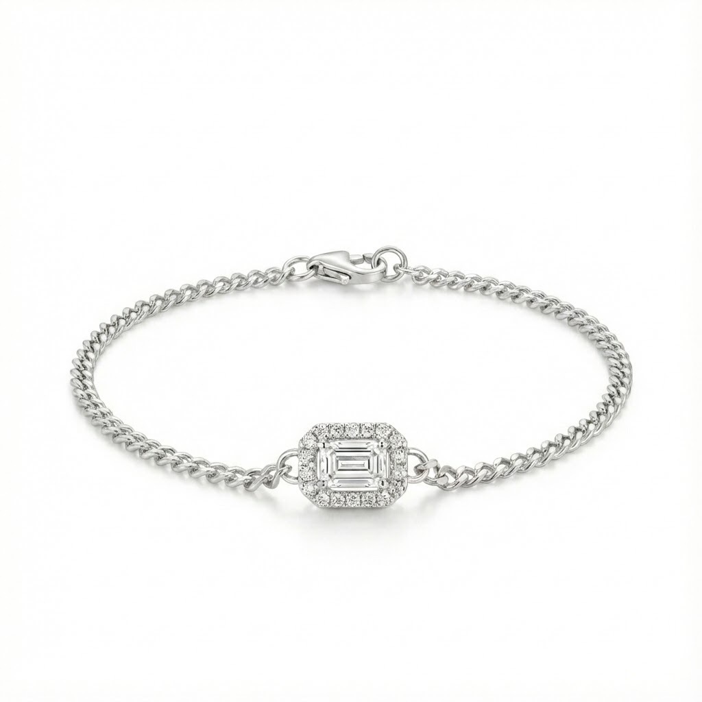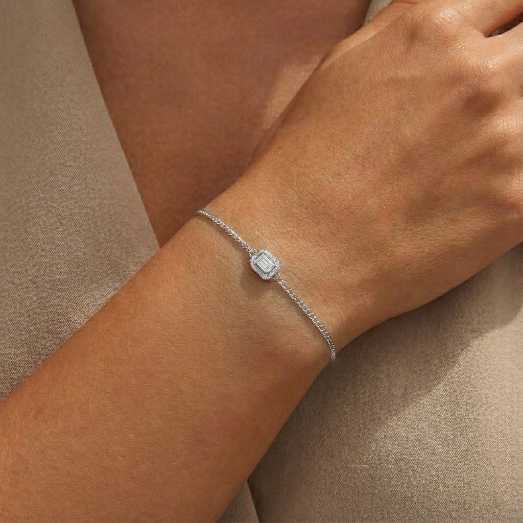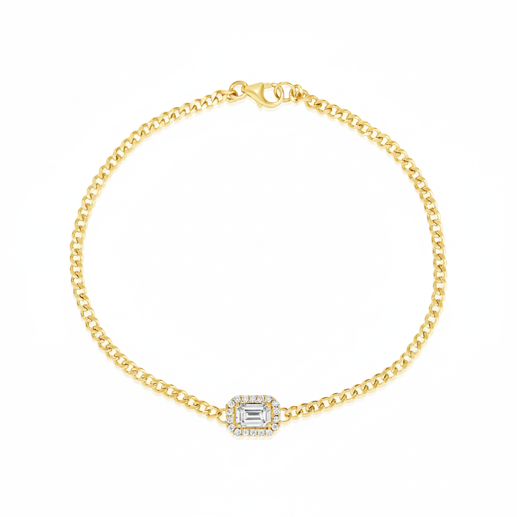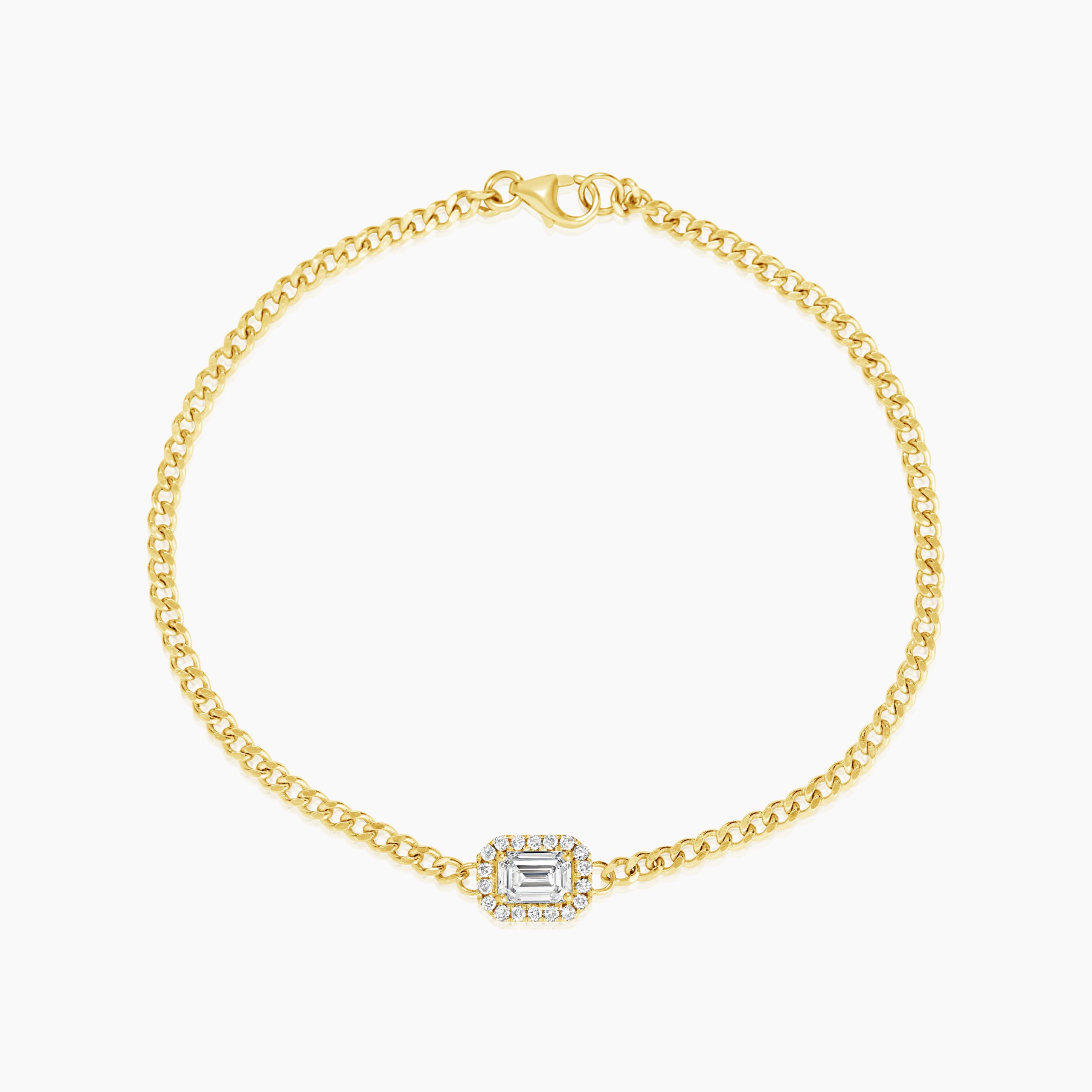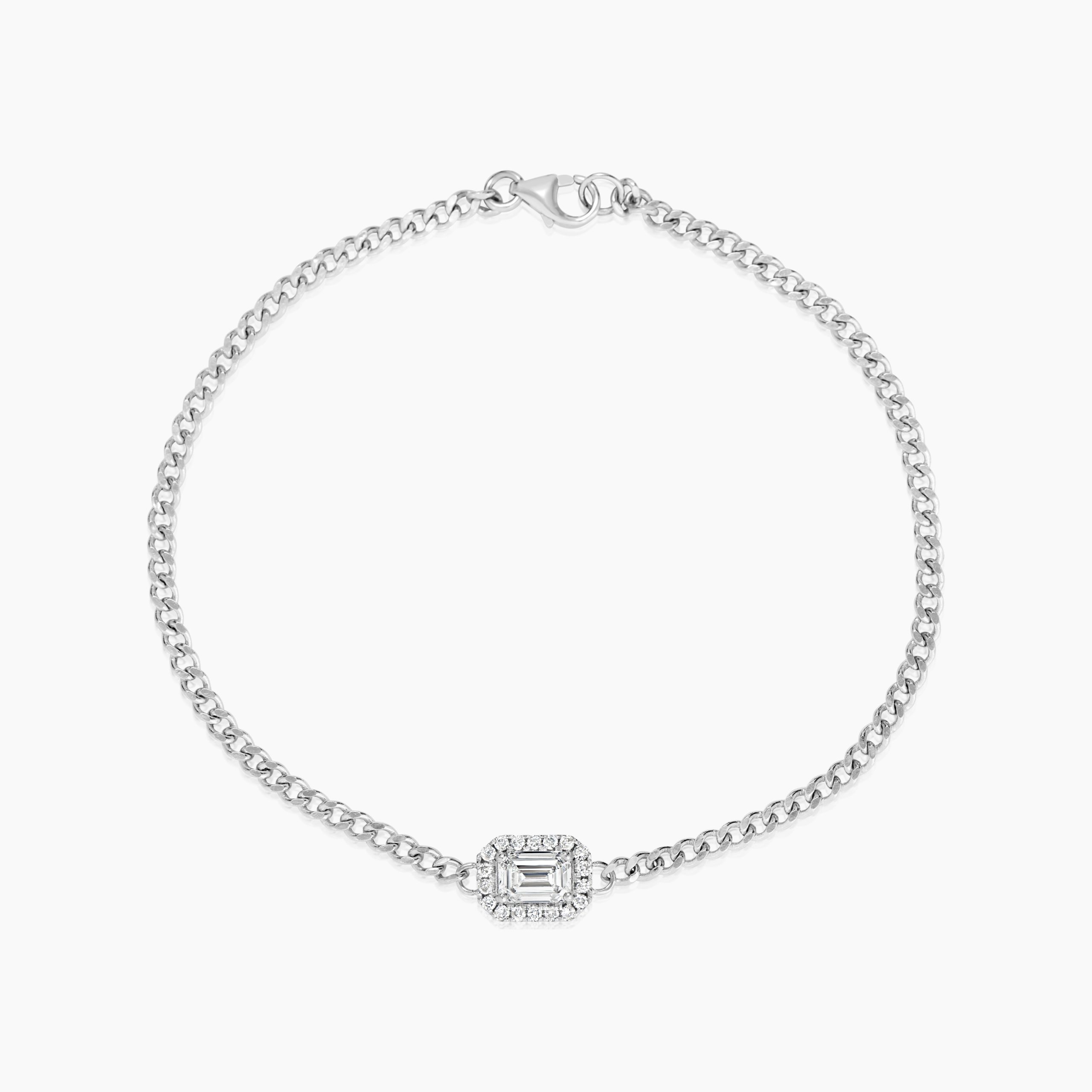 רונדי צמיד הילו עדין עם יהלום במרכז בחיתוך אמרלד מוקף בהילה של יהלומים עגולים, המשובצים במחבר עדין שמשתלב בשרשרת חוליות מלוטשת. העיצוב מאזן בין צורה גאומטרית קלאסית לתשומת לב לפרטים: יהלום אמרלד תופס את הבמה, והיהלומים הקטנים סביבו יוצרים הילה של ברק עדין.