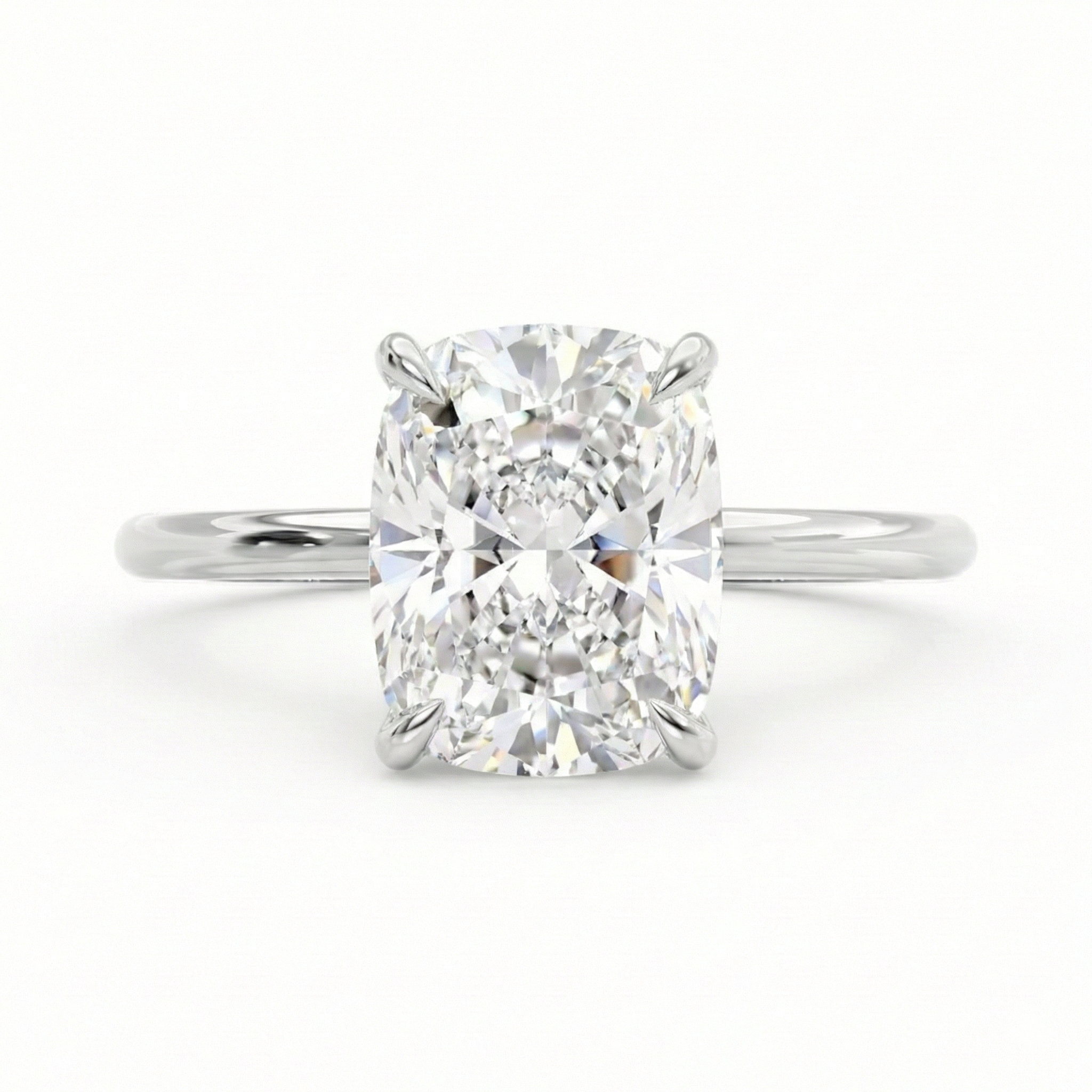 במרכזה יהלום בחיתוך קושן – חיתוך מרובע עם פינות מעוגלות וברק רך ונשי, משובץ בארבע שיניים עדינות. הזרוע החלקה והאלגנטית משלימה את המראה הנקי והקלאסי ובנוסף שיבוץ על הגשר מתחת ליהלום.