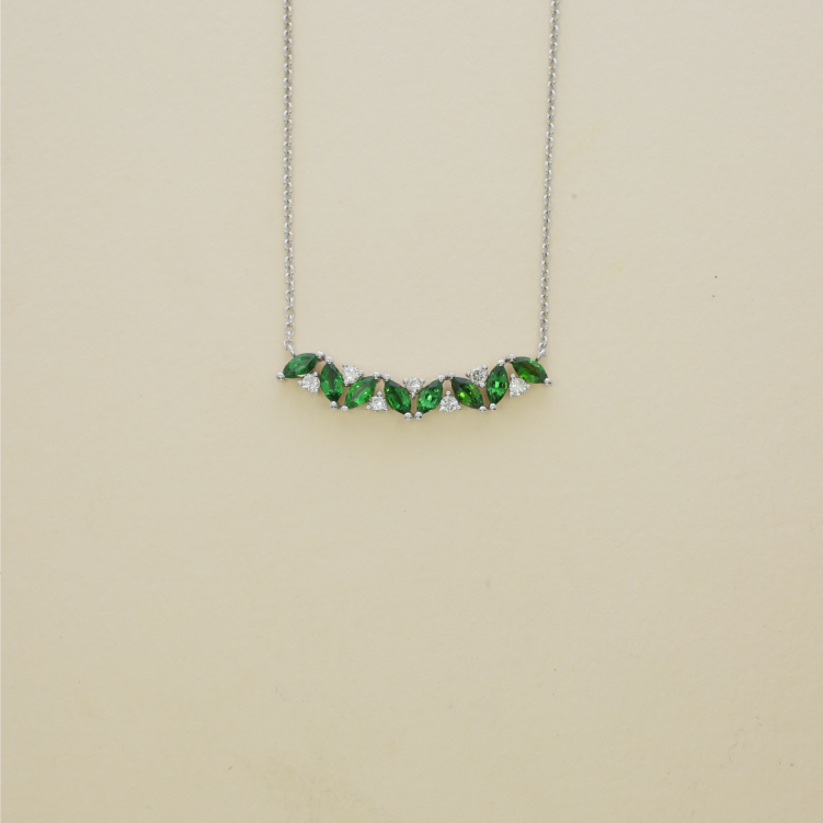 אלווין משלבת בין יוקרה לטבעיות עם עיצוב עדין של אבני כרום טורמלין בגווני ירוק עמוק, המשובצות לסירוגין עם יהלומים בוהקים. השיבוץ המדורג יוצר תנועה הרמונית ואלגנטית שמחמיאה לקו הצוואר.