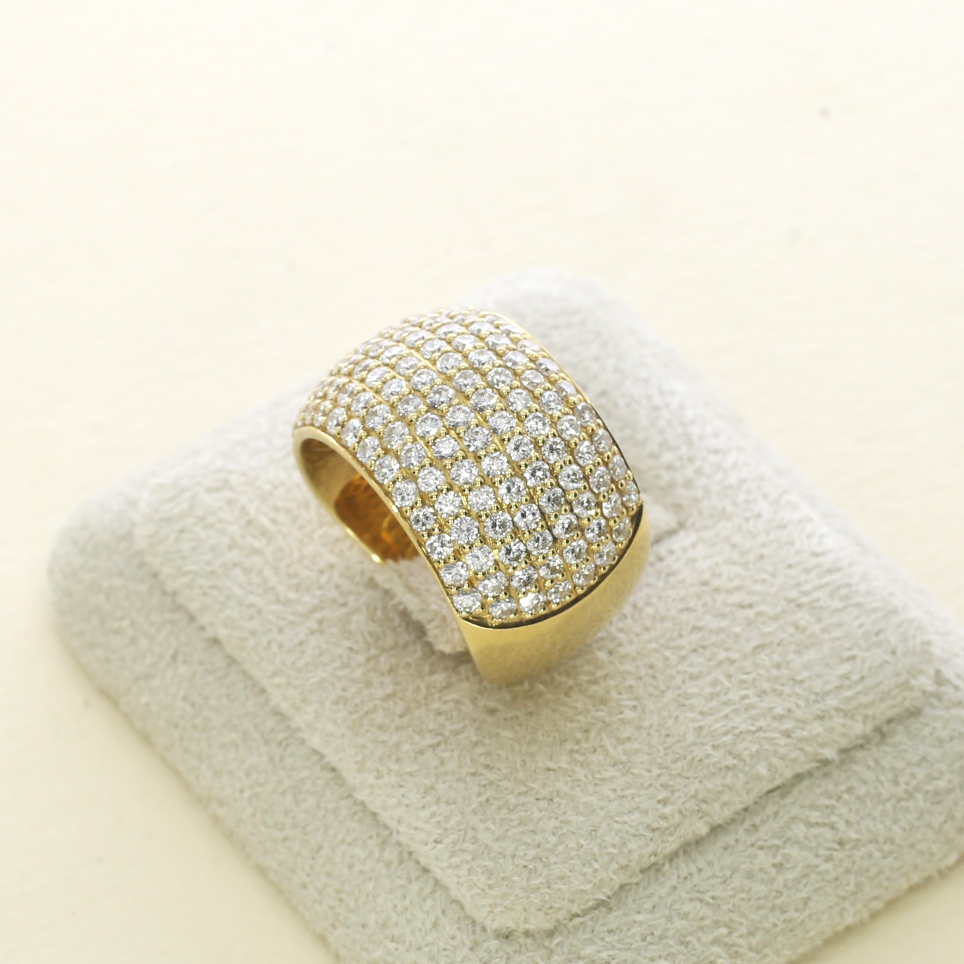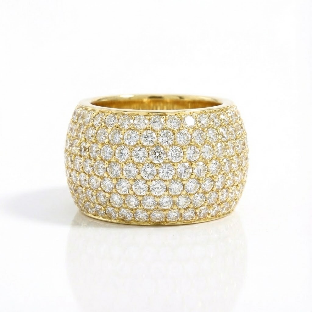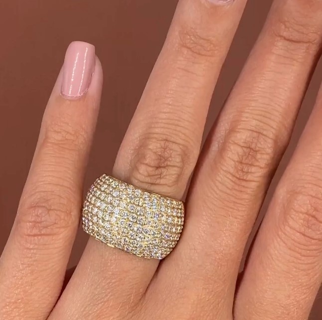 הטבעת עשויה זהב צהוב מבריק, עם שיבוץ יהלומים קלאסי המשדר יוקרה נצחית – מושלמת למי שאוהבת תכשיטים שאי אפשר להתעלם מהם.