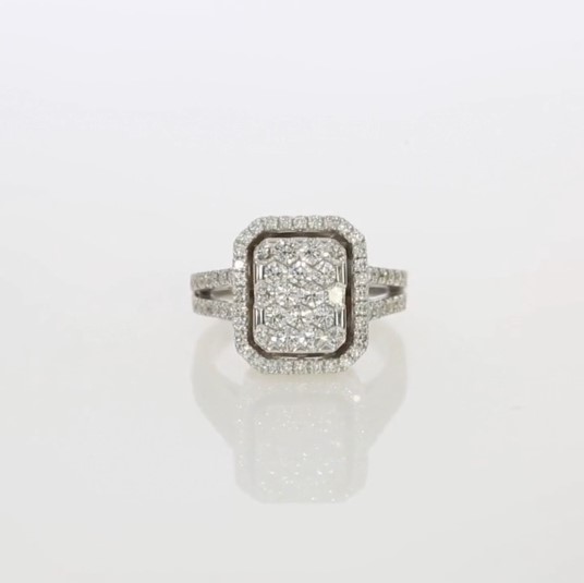 קמבריה היא טבעת Majestic סטייטמנט יוקרתית בעיצוב מלבני עם פינות מעוגלות, המשובצת במבנה צפוף של יהלומים עגולים קטנים המדמים יהלום אחד גדול ומרשים. מסגרת כפולה של יהלומים מקיפה את המרכז, ומוסיפה עומק וניצוץ נוסף.