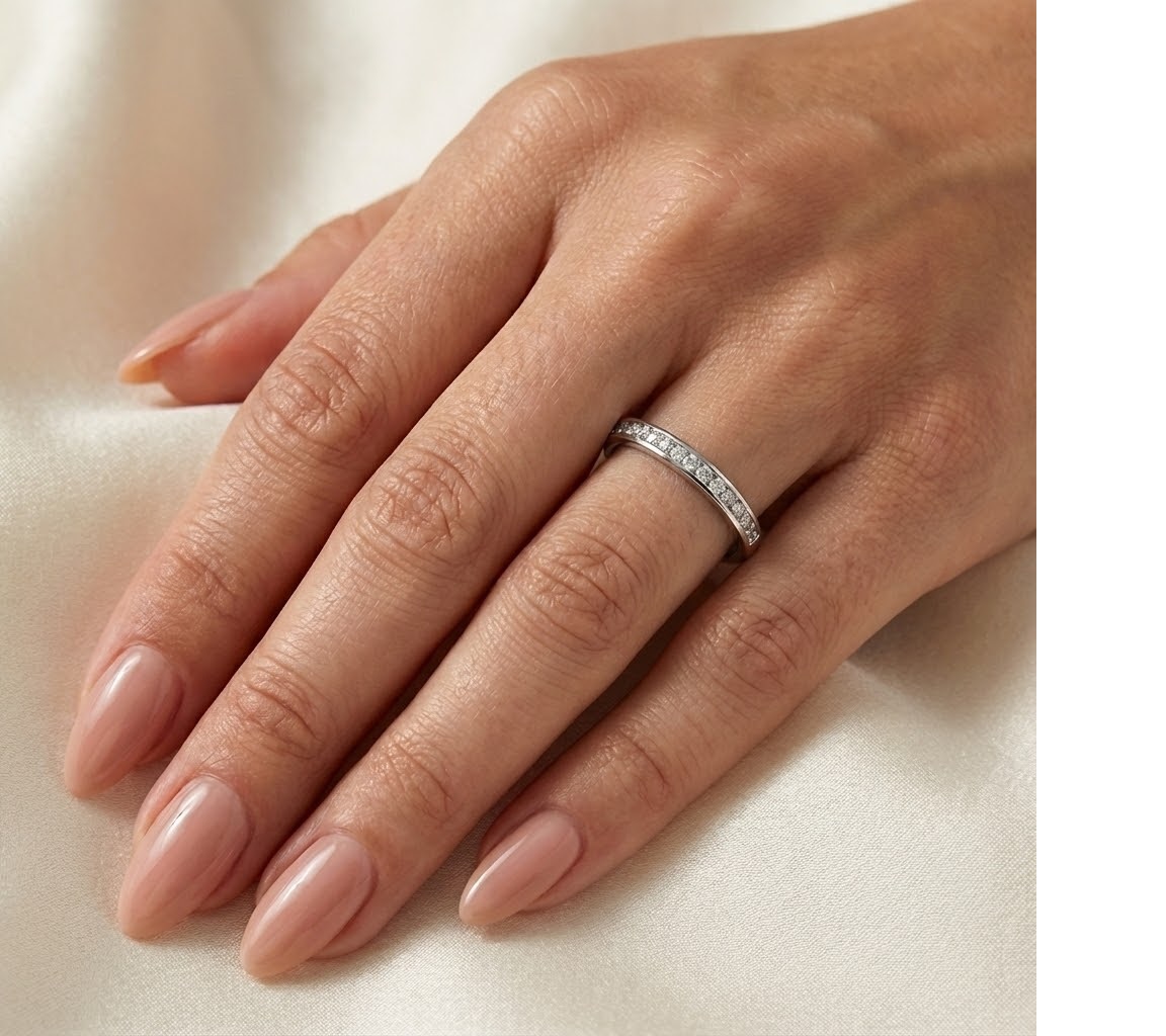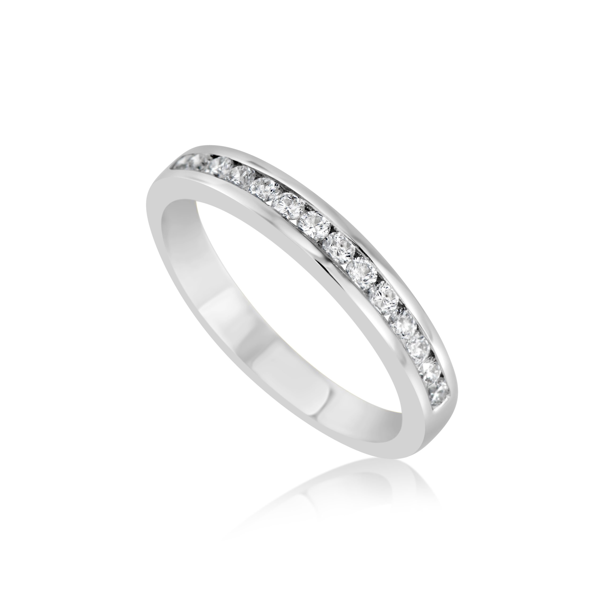 תעלה מרכזית משובצת יהלומים עגולים בשיבוץ channel לסגירה הדוקה ולפליטה מרבית של אור