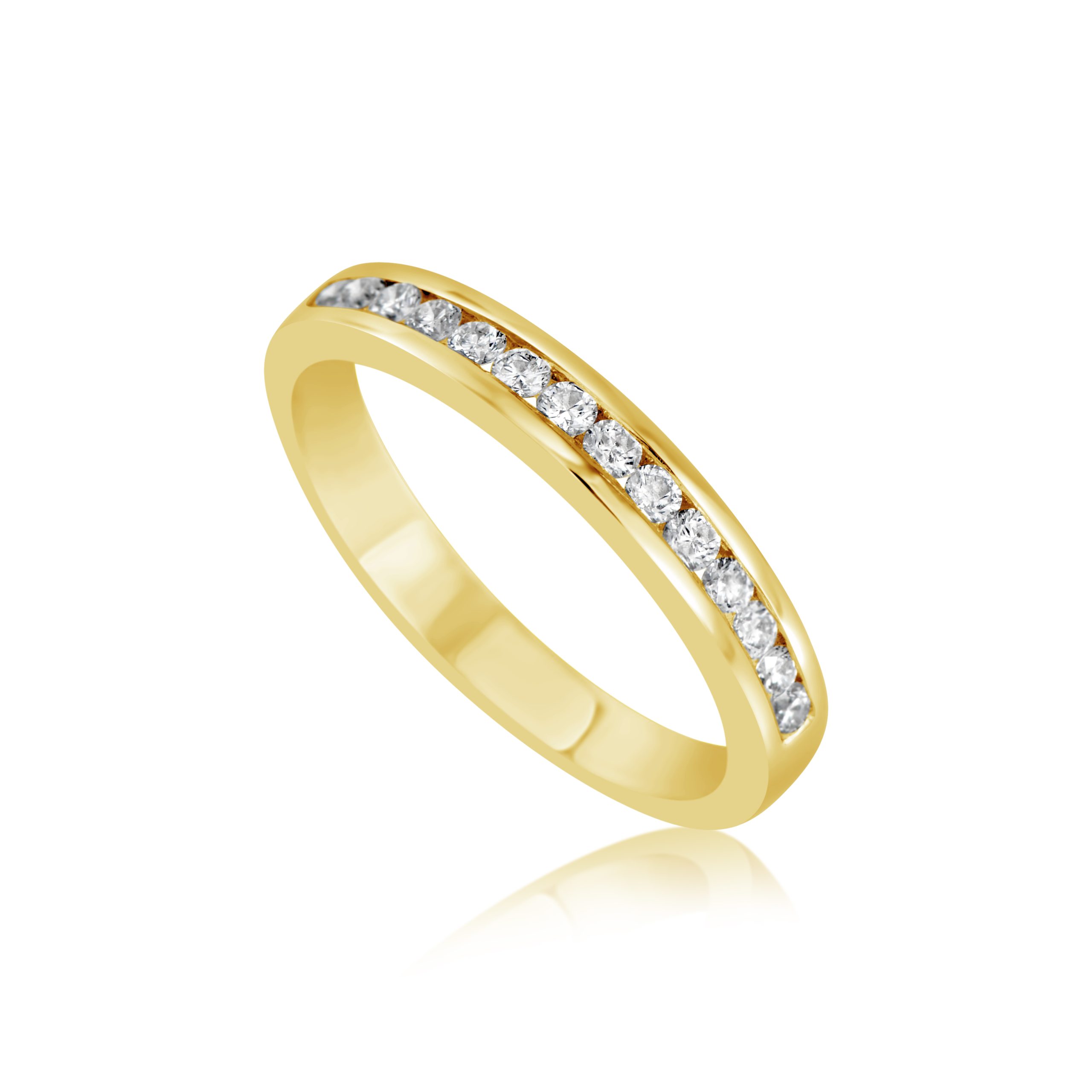 צ’ינטה,טבעת עדינה עשויה זהב צהוב משובח, עם תעלה מרכזית (channel) צרה המשובצת בשורת יהלומים עגולים בצפיפות מושלמת. כל יהלום נתפס בשיבוץ טבעתי פנימי, המדגיש את הברק ומגן על האבן מכל צד, בעוד שזרוע הטבעת החלקה מסביב לתעלה מדגישה את קו הזוהר ויוצרת מראה נקי ומעודן.