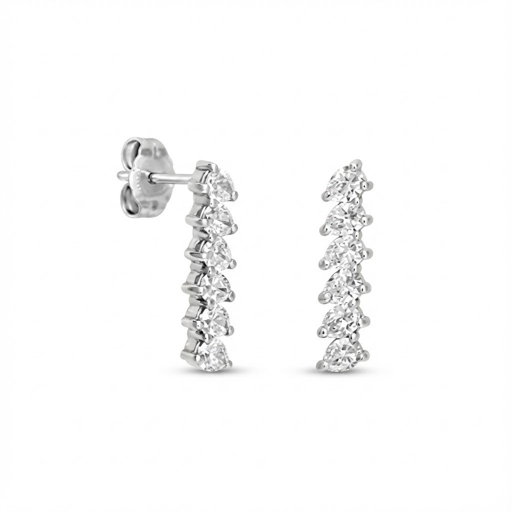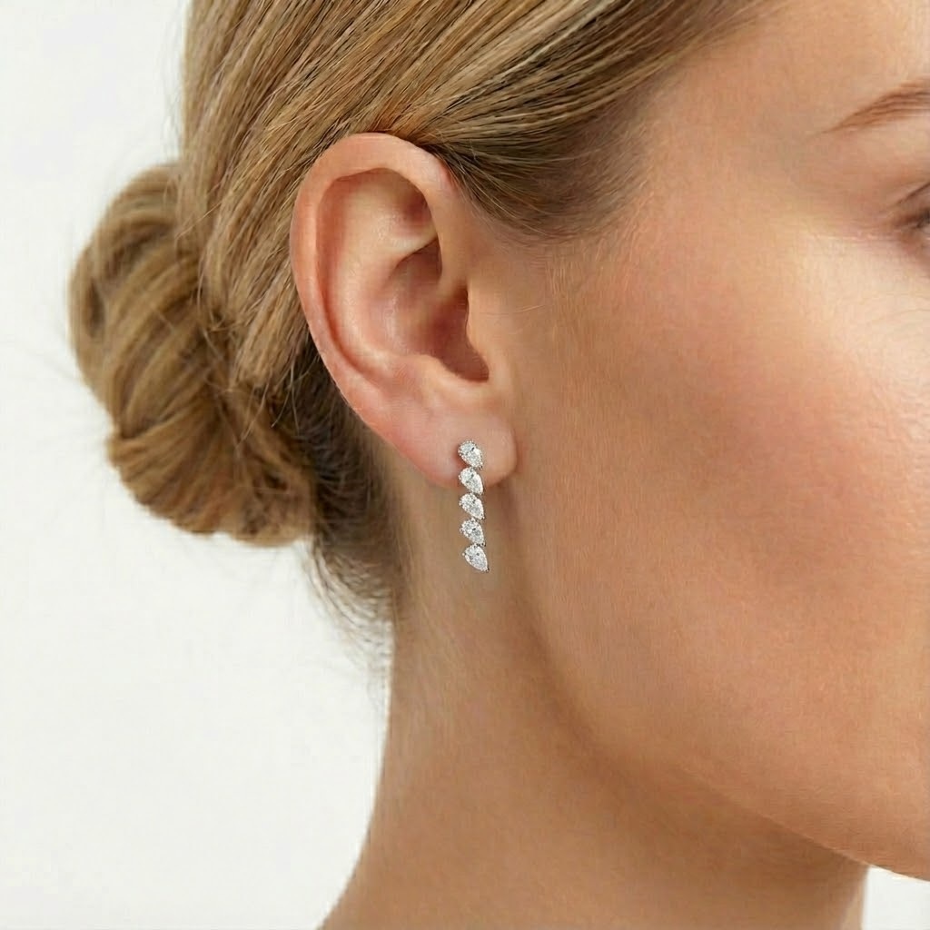 דלינה הם עגילי סטאד ייחודיים בעיצוב מעוגל ועדין, משובצים בשורה של יהלומים בחיתוך טיפה (Pear Cut) המונחים זה מעל זה בצורה זורמת ומרשימה. השיבוץ המדויק מעניק לעגיל מראה קליל אך עשיר, מלא נצנוץ ותנועה טבעית של האור.