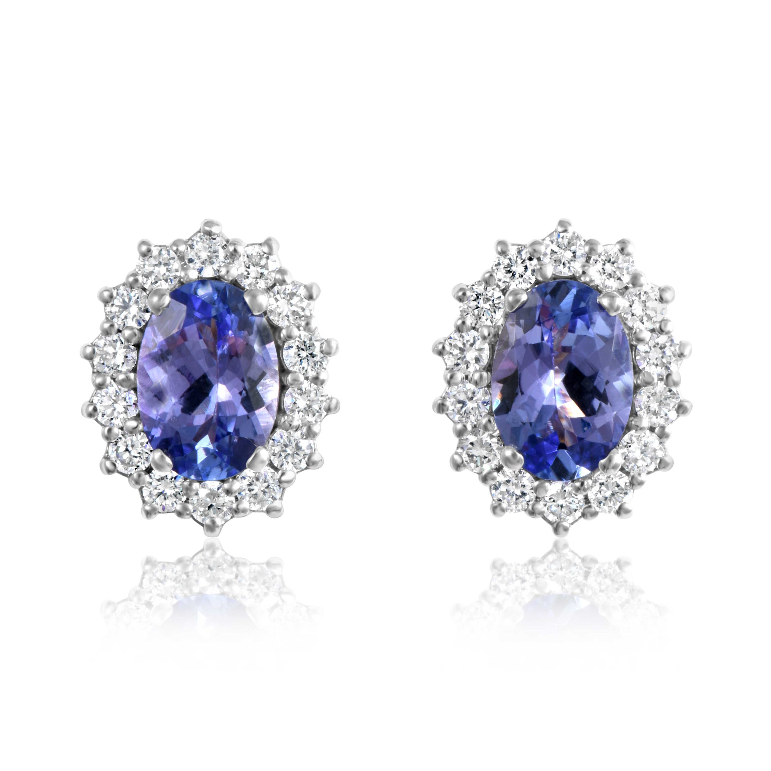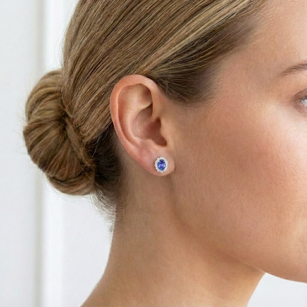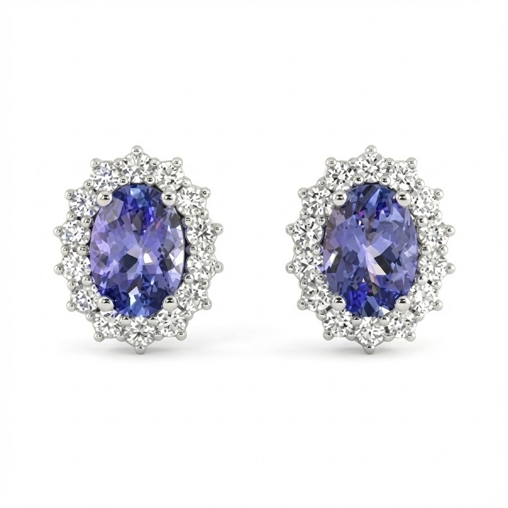 עגילי דיאנה אלגנטיים הילו, קלאסי. משובץ אבן חן טנזנייט עגולים במרכז ויהלומים מסביב