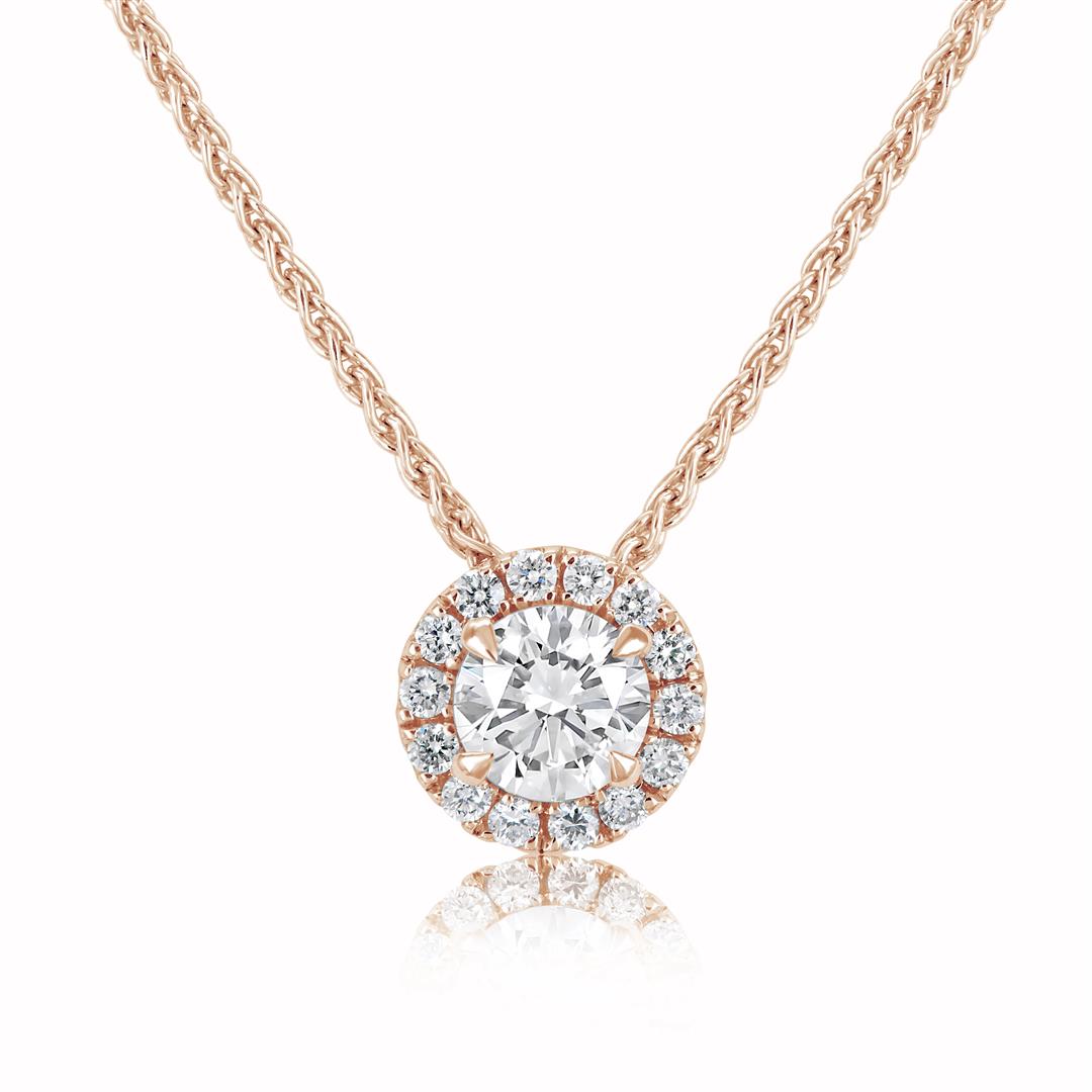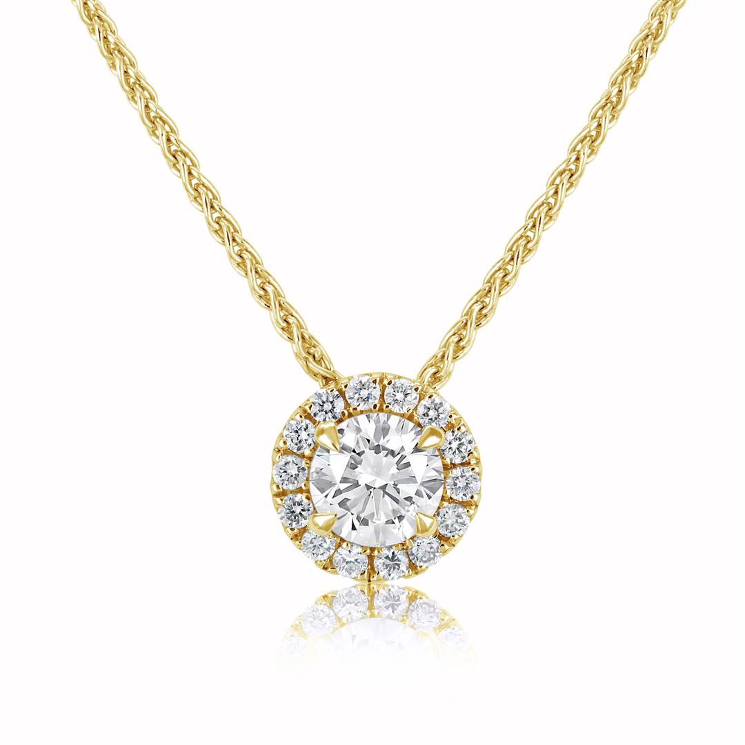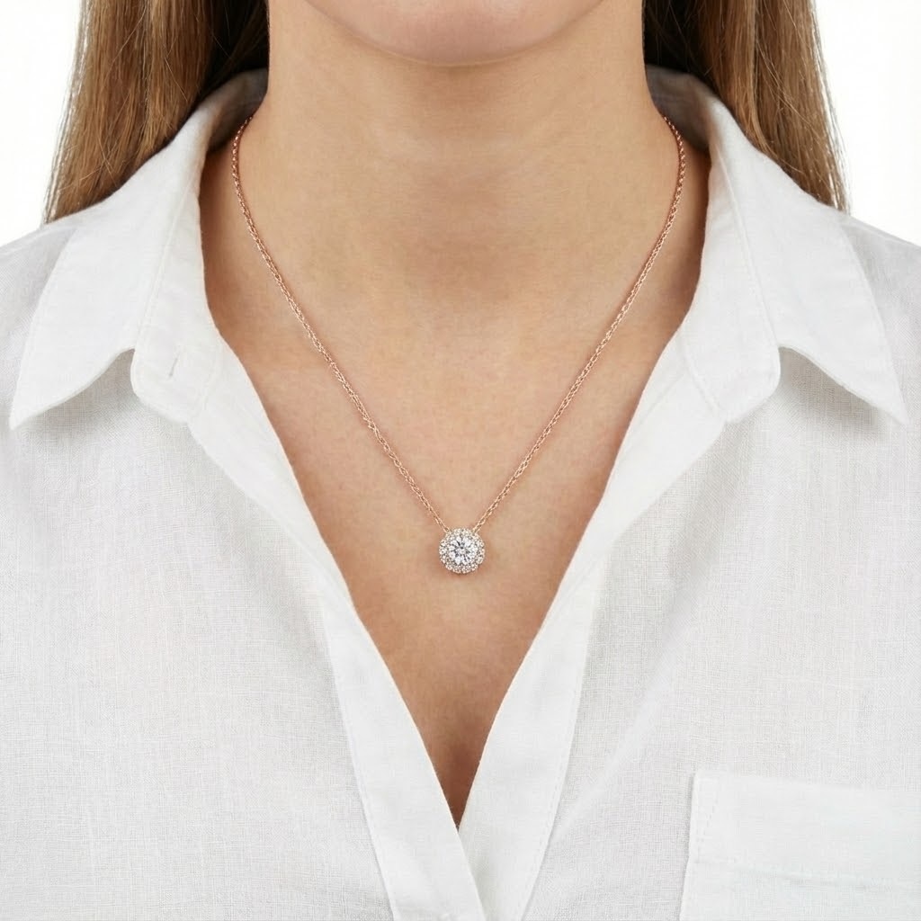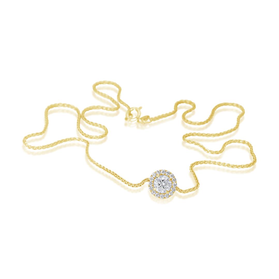 תליון קלאסי-מודרני עשוי זהב צהוב מוקפד, עם אבן מרכזית חיתוך עגול המשובצת בארבע שיניים עדינות, שמוקפת במעגל פנימי של יהלומים קטנים בשיבוץ פרון אישי. שרשרת הטורנסל הדקה תומכת בתליון ומשלימה מראה רומנטי ועדין, בזמן שההילה סביב האבן המרכזית יוצרת אפקט וינטג’-זוהר המשתקף בברק רב־שכבתי.