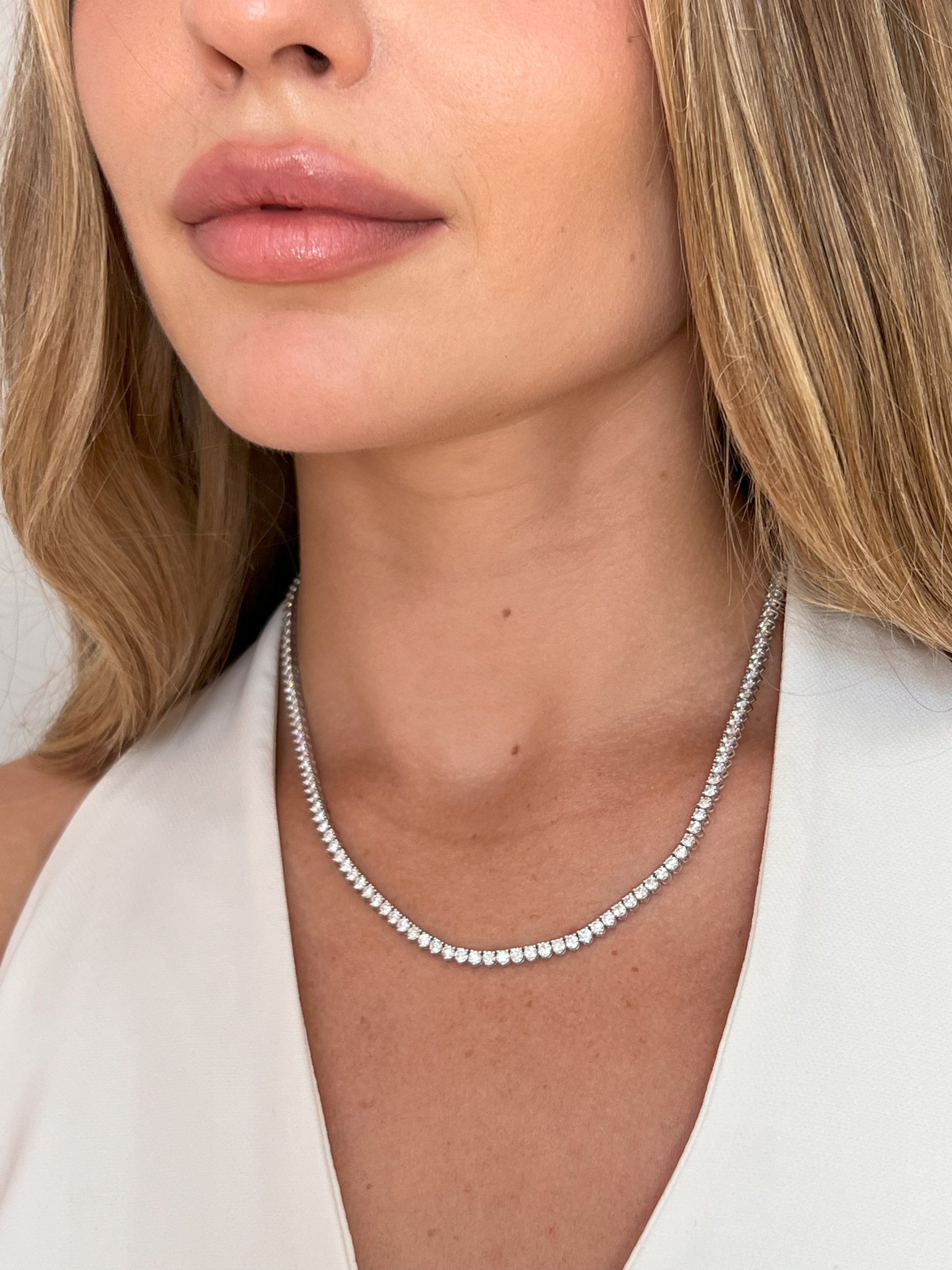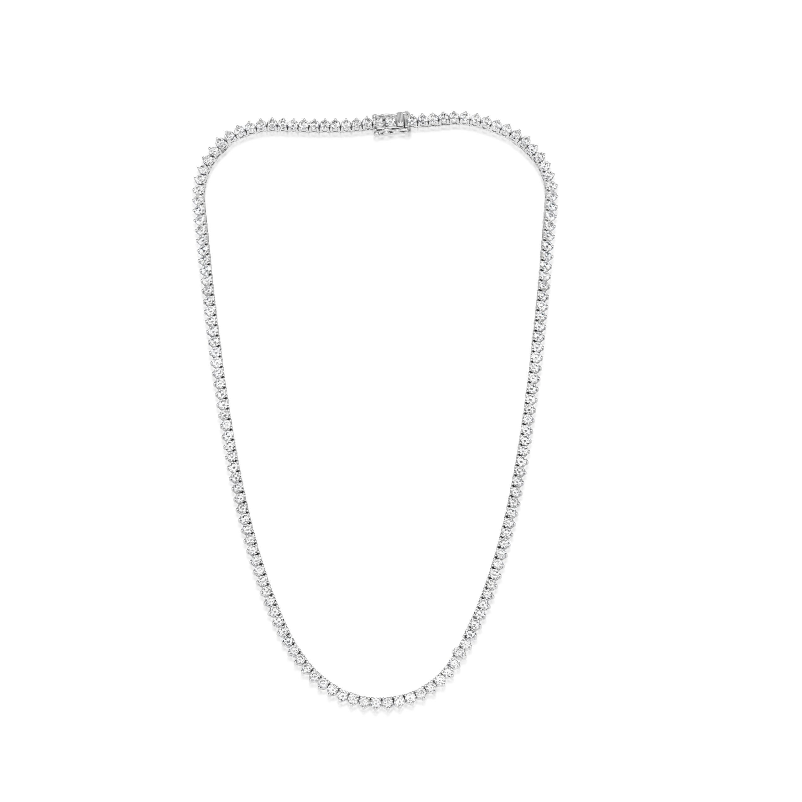 שרשרת טניס קלאסית ויוקרתית בעיצוב אינסופי, עשויה זהב לבן מוקפד, המשובצת בשורת יהלומים עגולים בריקוע שלוש שיניים לאורך כל השרשרת. כל יהלום נתפס בחשיפה מיטבית לאור, ליצירת ניצוץ מתמשך ושובר לב בכל מבט. הלהקה הדקה אך יציבה מעניקה תחושה של קלילות ונוחות, בעוד אורך השרשרת מתוכנן כך שישבב יפה על קו הצוואר ויתאים גם להדגשה מעל חולצות עם צווארון וגם ללבוש על עור חשוף.