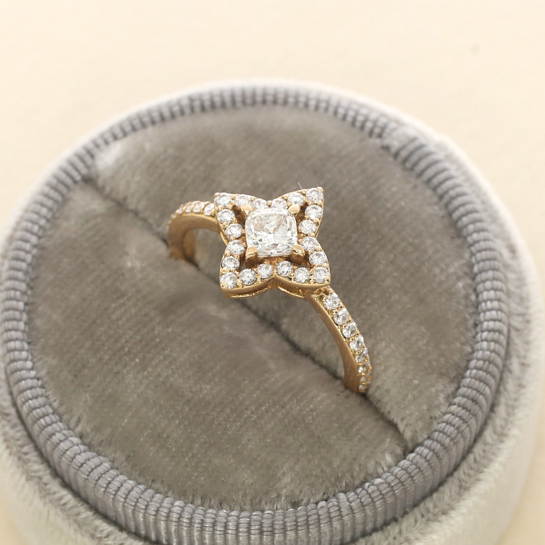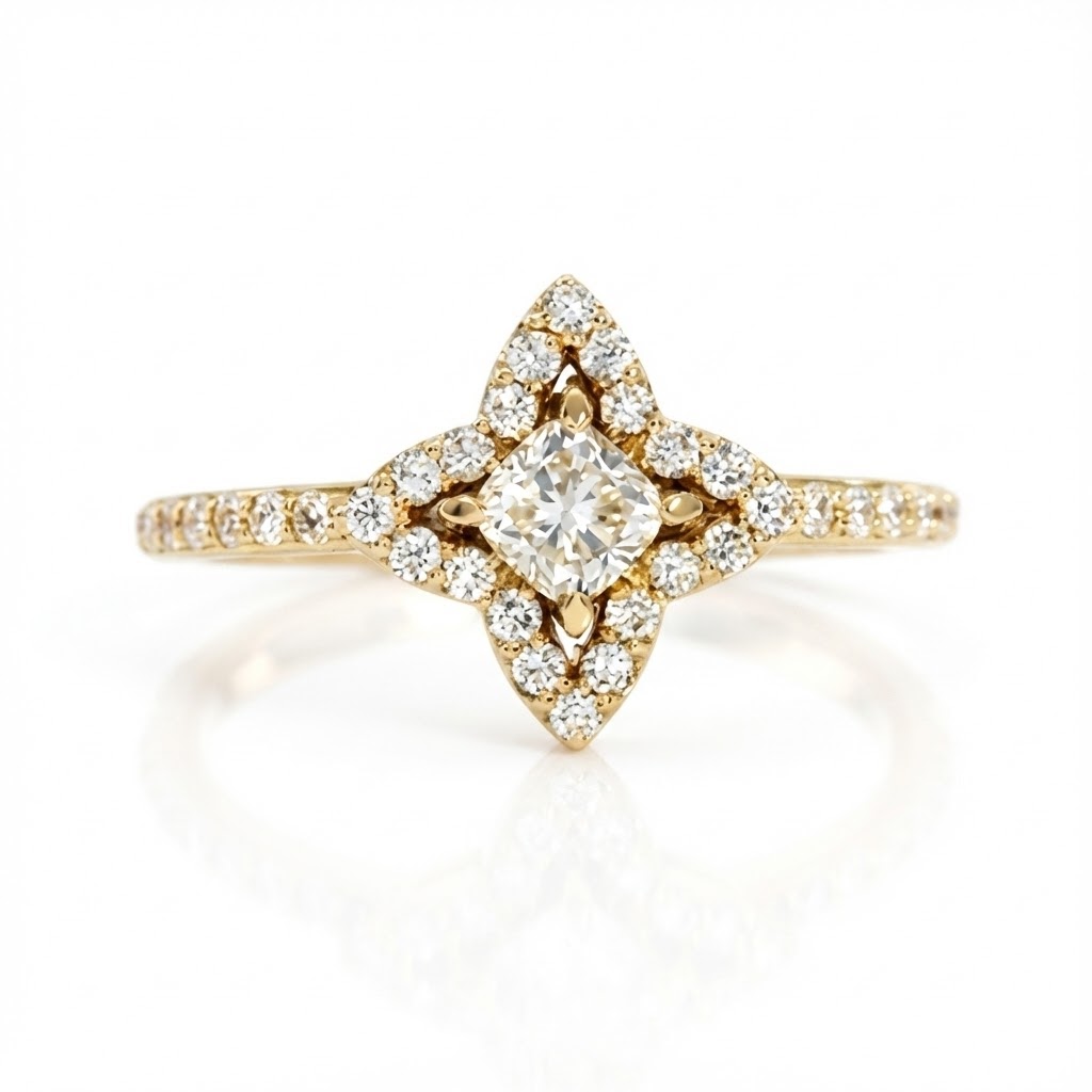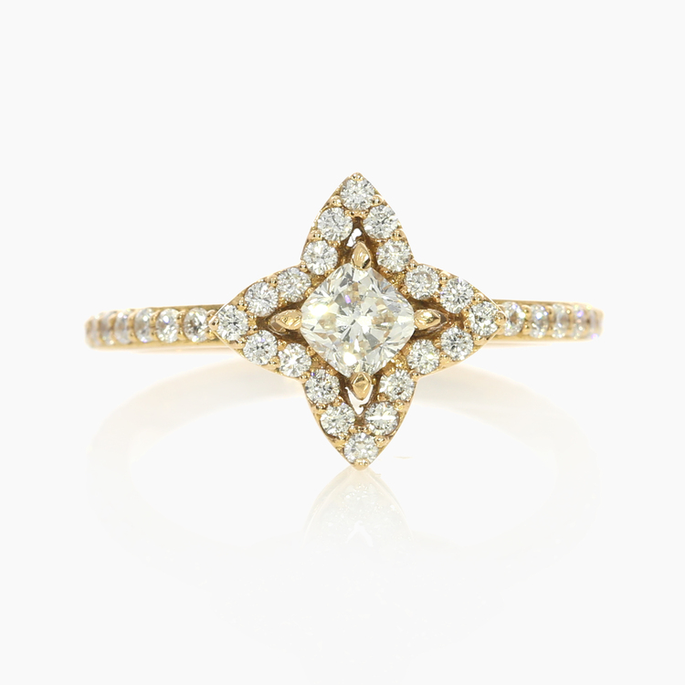 מלודי היא טבעת כוכב קלאסית שמפגישה בין עיצוב על-זמני ליוקרה מודרנית. במרכזה שיבוץ יהלום עגול גדול ובוהק, מלווה יהלומים עגולים קטנים בשיבוץ פווה – ליצירת איזון חזותי והרמוניה מדויקת.